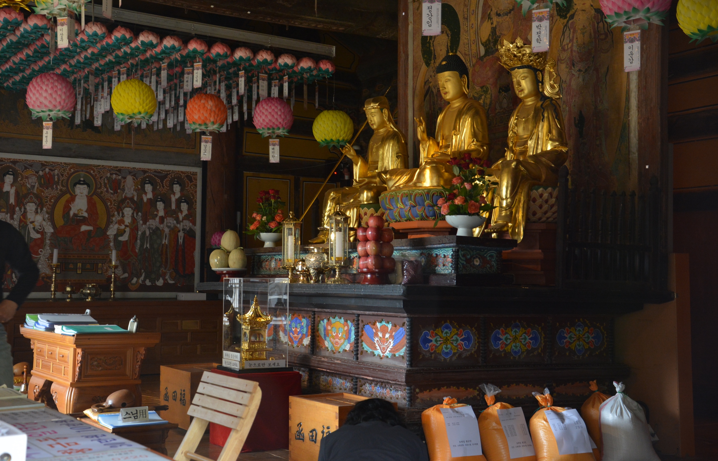 극락보전의 주불인 아미타여래상을 중심으로 좌우측에 관음보살상과 지장보살상이 배치되어 있다.