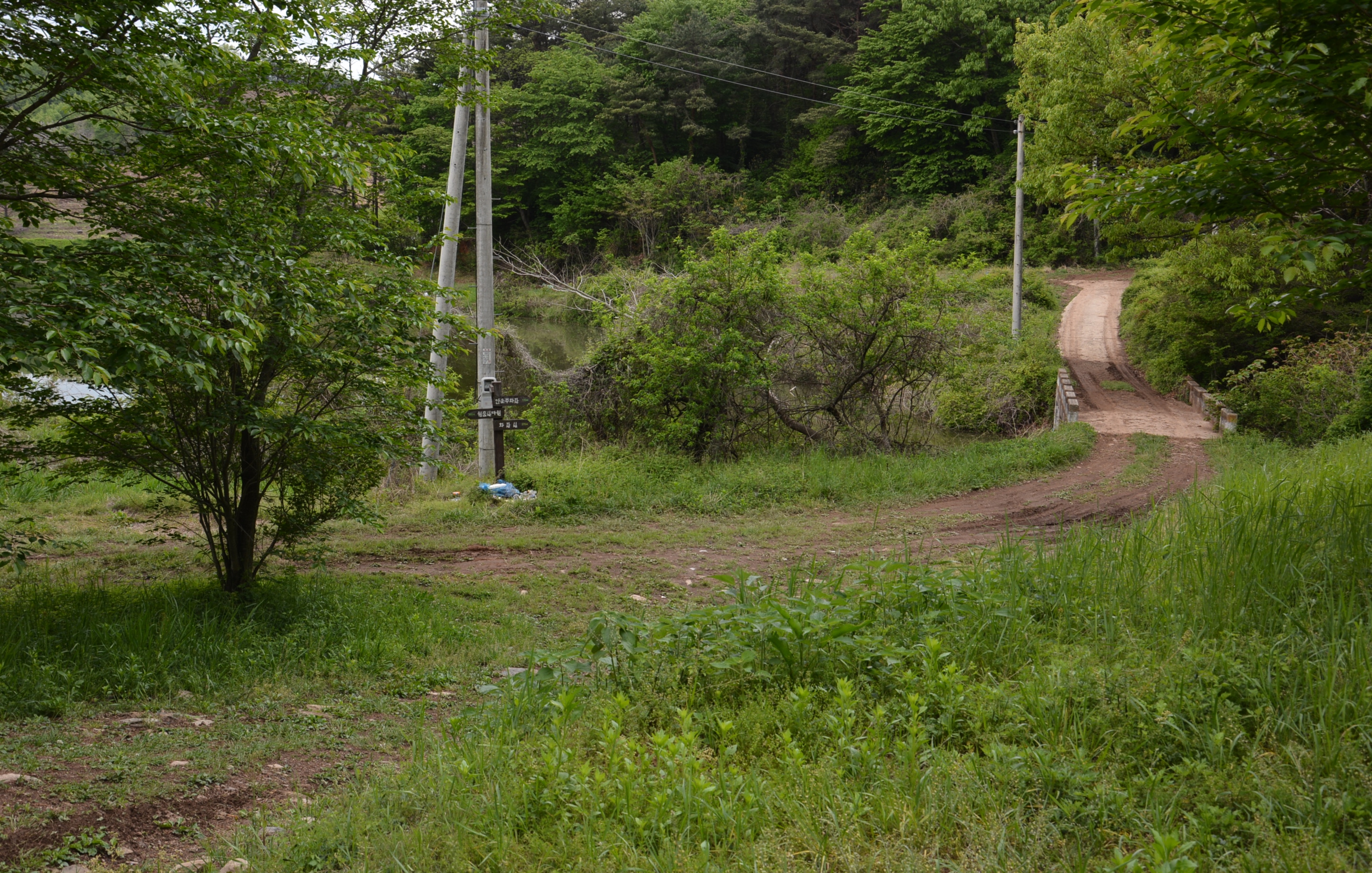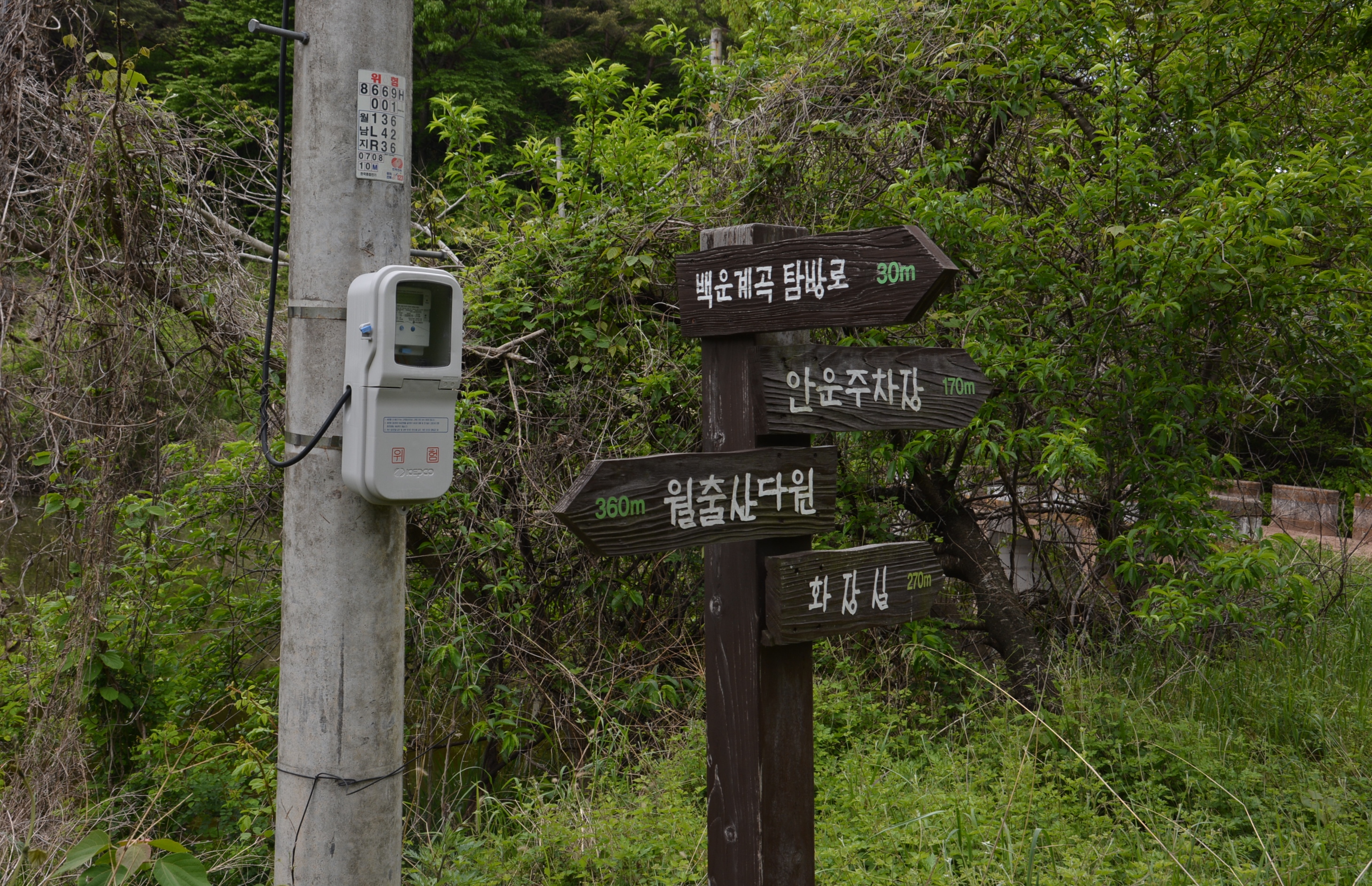 전주 옆에 이정표가 있다.