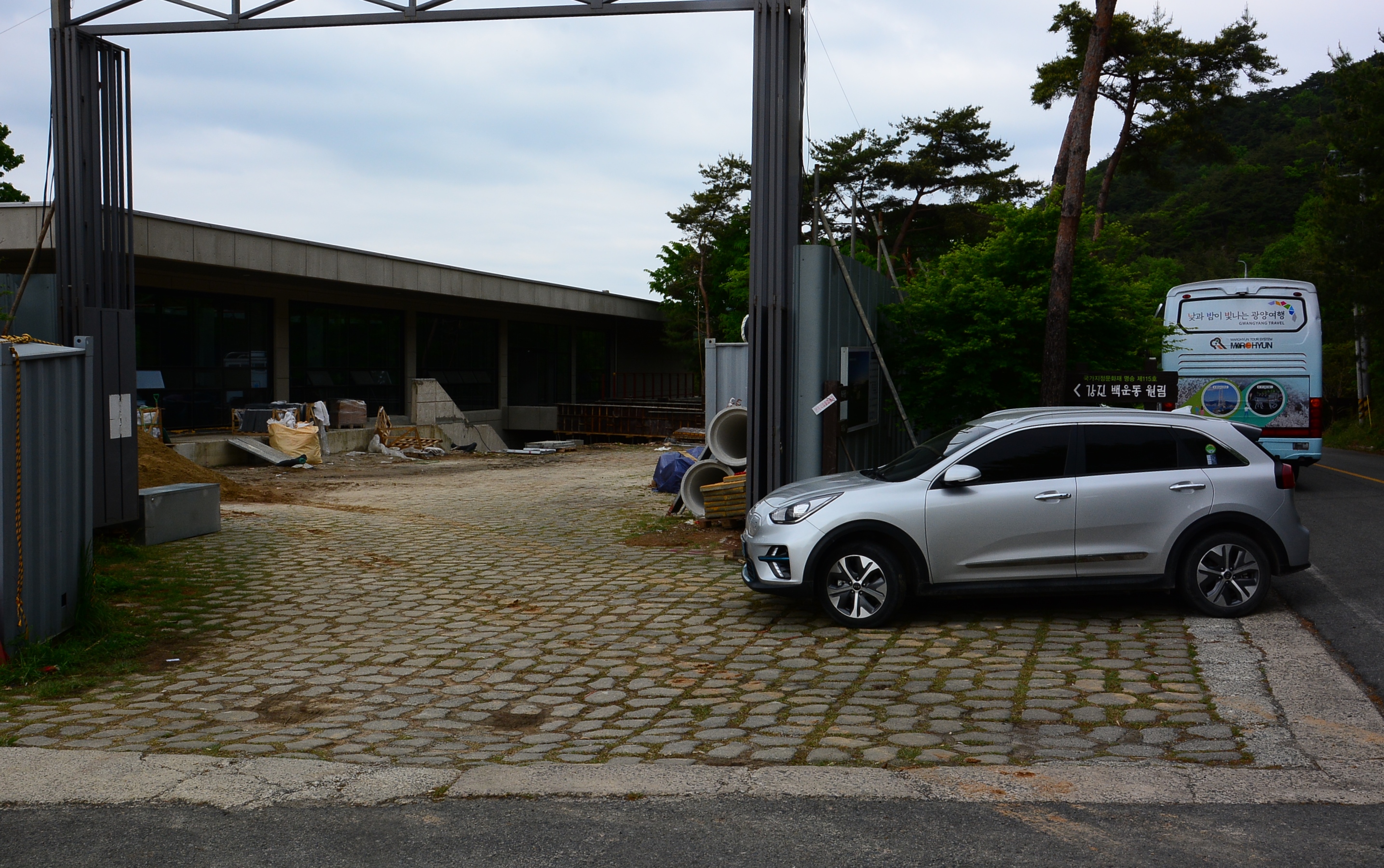 안내도상 월출산 다원 주차장엔 현 건물 공사가 진행 중으로, 도로변까지 공사 칸막이가 설치되어 있어 현재는 주차공간이 매우 협소하다,