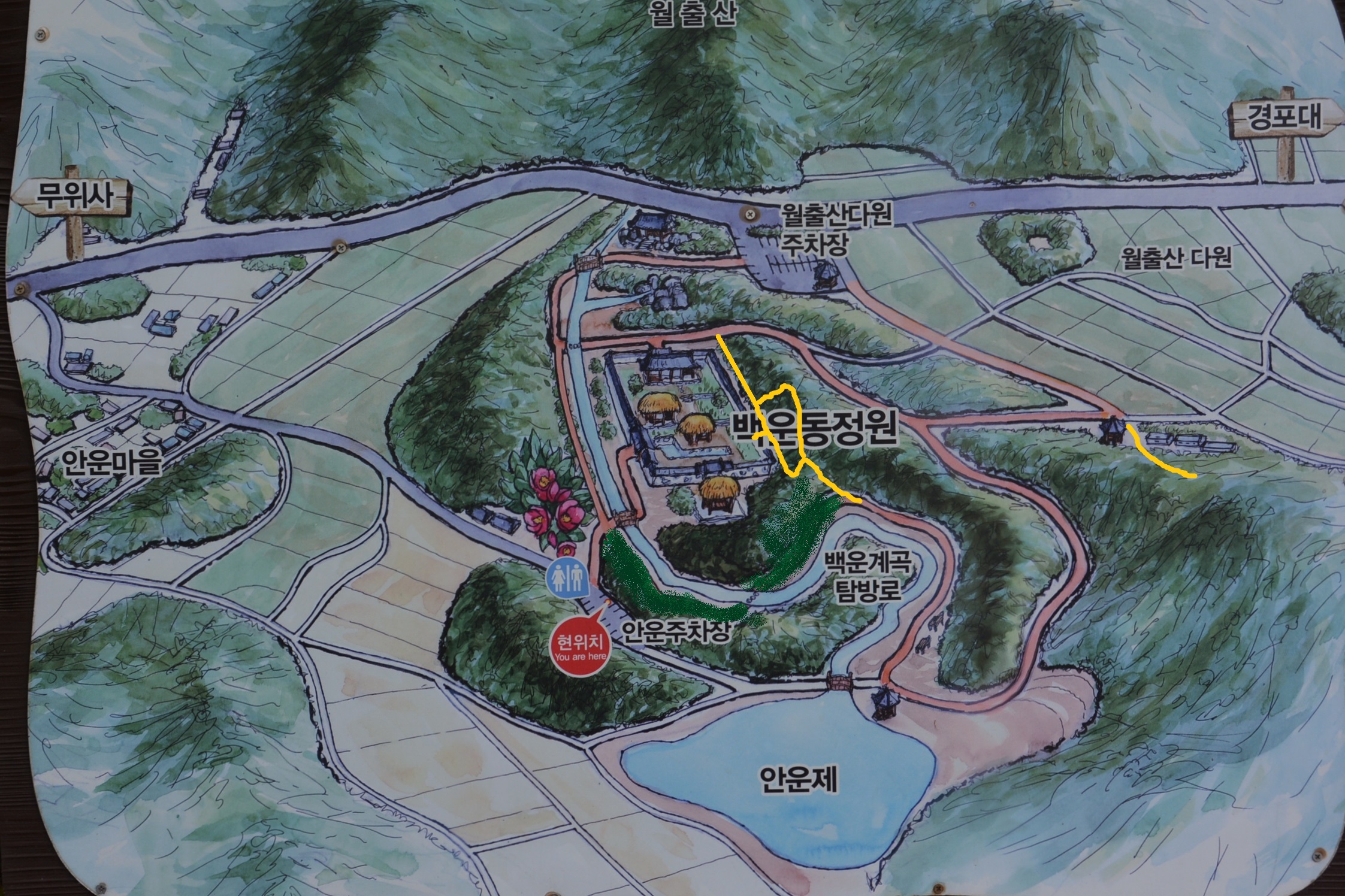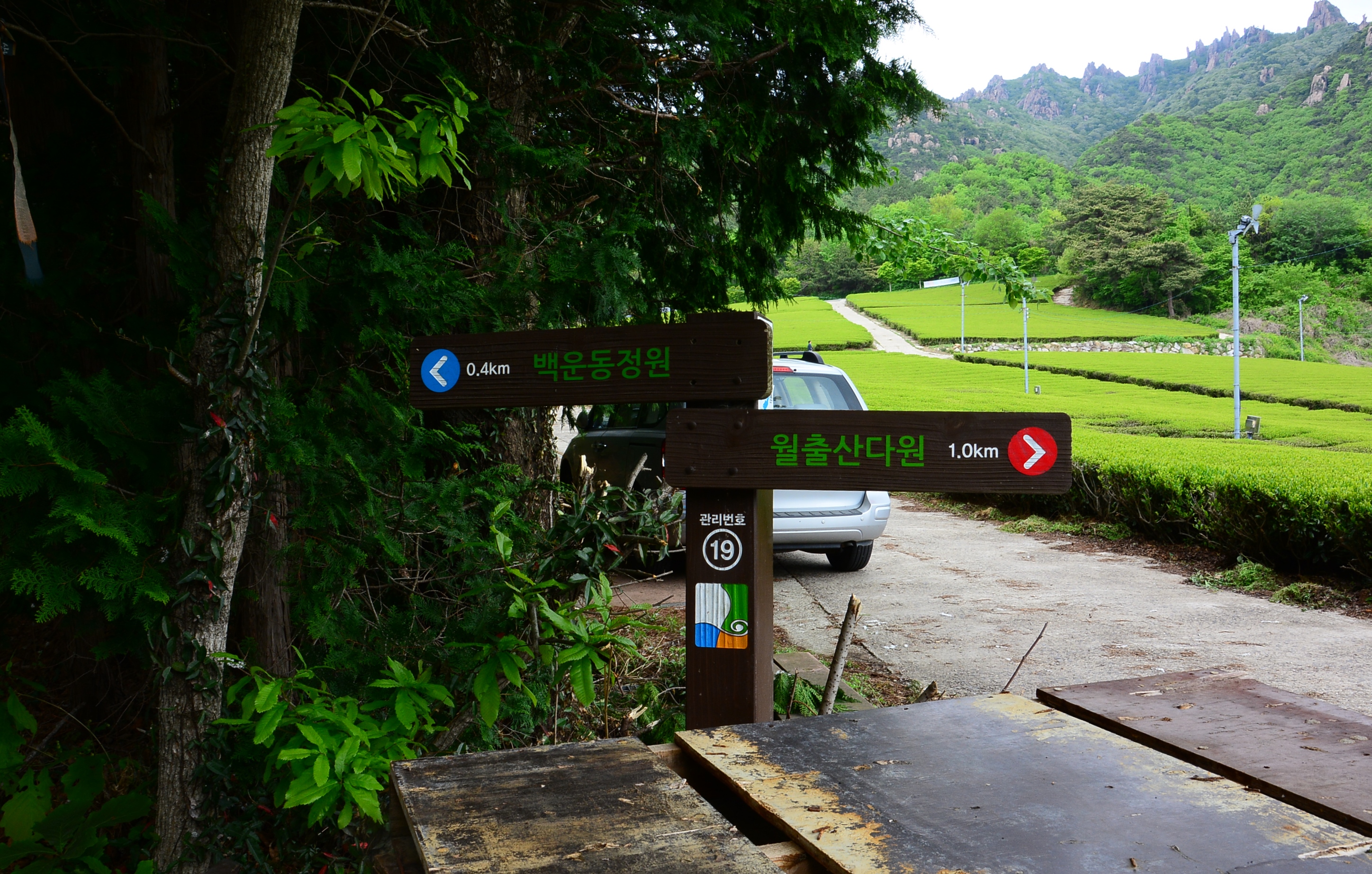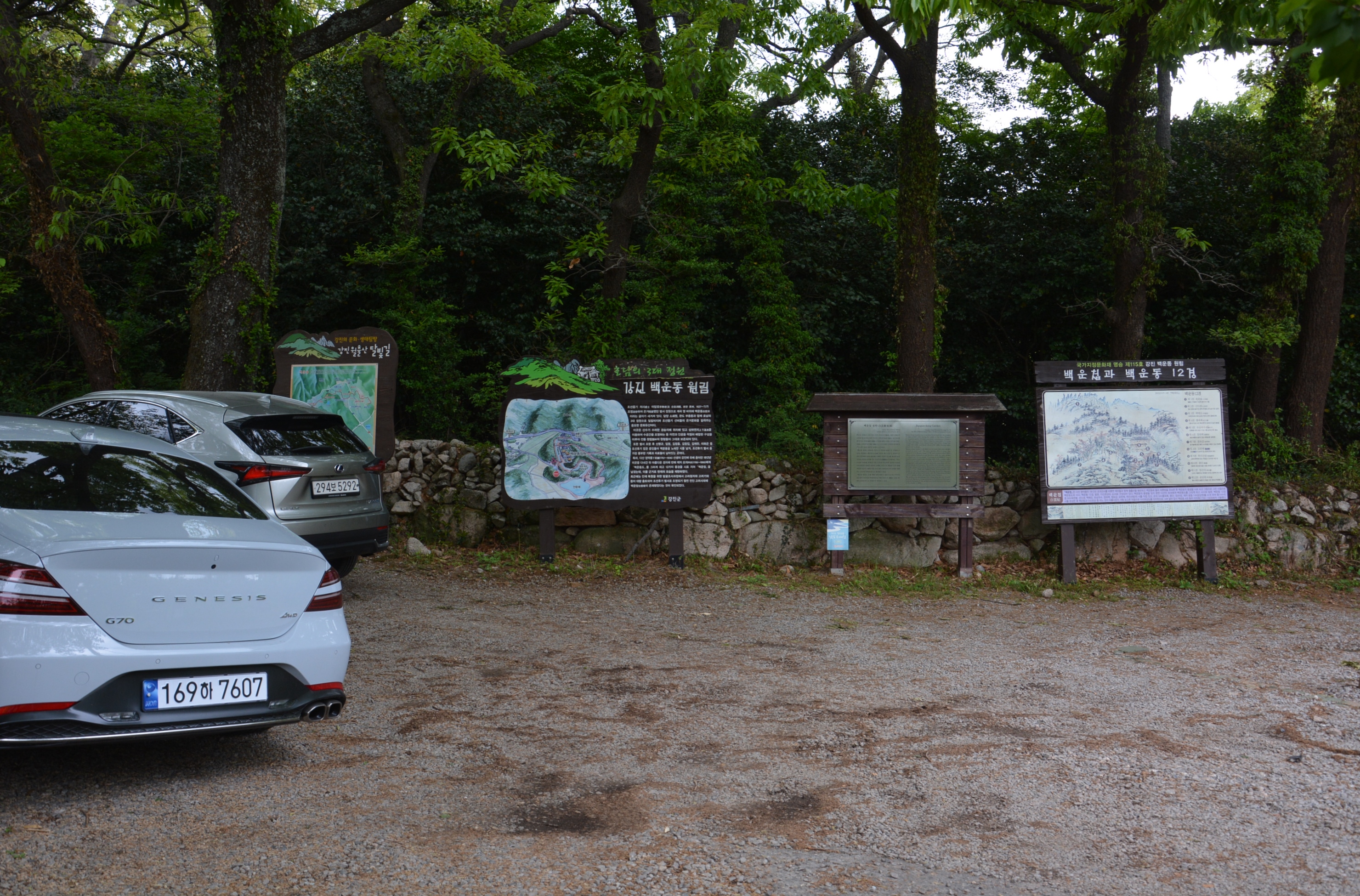 백운동 정원은 안내도상 안운주차장으로 진입하는 것이 옳으나, 진입로를 찾아 들어가기가 어렵고 주차공간도 작아 월출산다원 주차장을 이용하는것이 편하다.