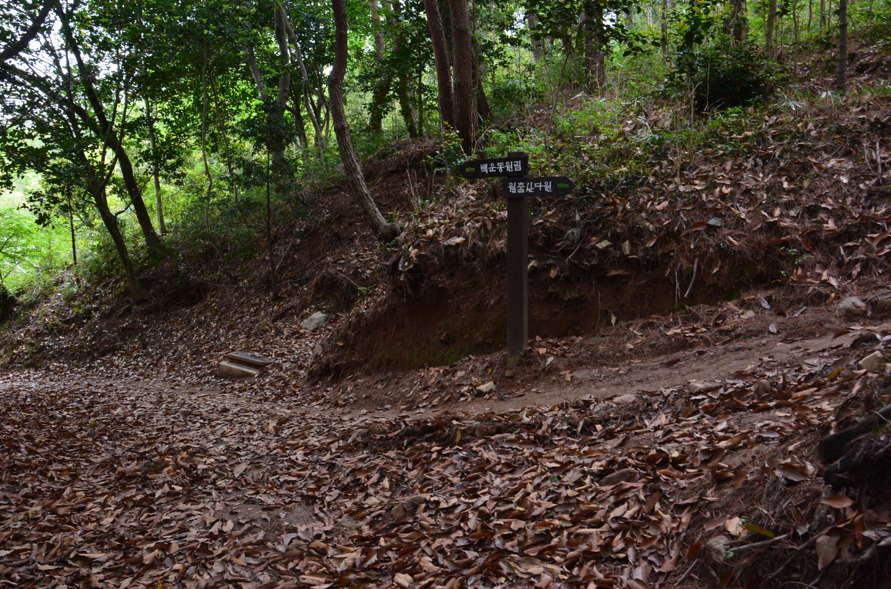 좌측 방향 아래 이정표의 월출산 다원 방향으로 이어가면 월출산 다원 입구 인근의 백운동 계곡방향 갈림길로 이어진다.