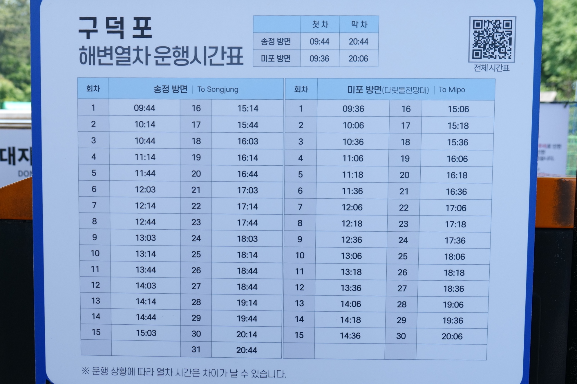 해변열차는 미포~청사포~송정역까지 4.8km구간을 왕복하며 시속 15km/h편도 약 30분 소요, 요금은 1회 탑승(하차후 재입장 불가) 7,000원, 2회탑승권 12,000원, 모든역 탑승권 16,000원이다.