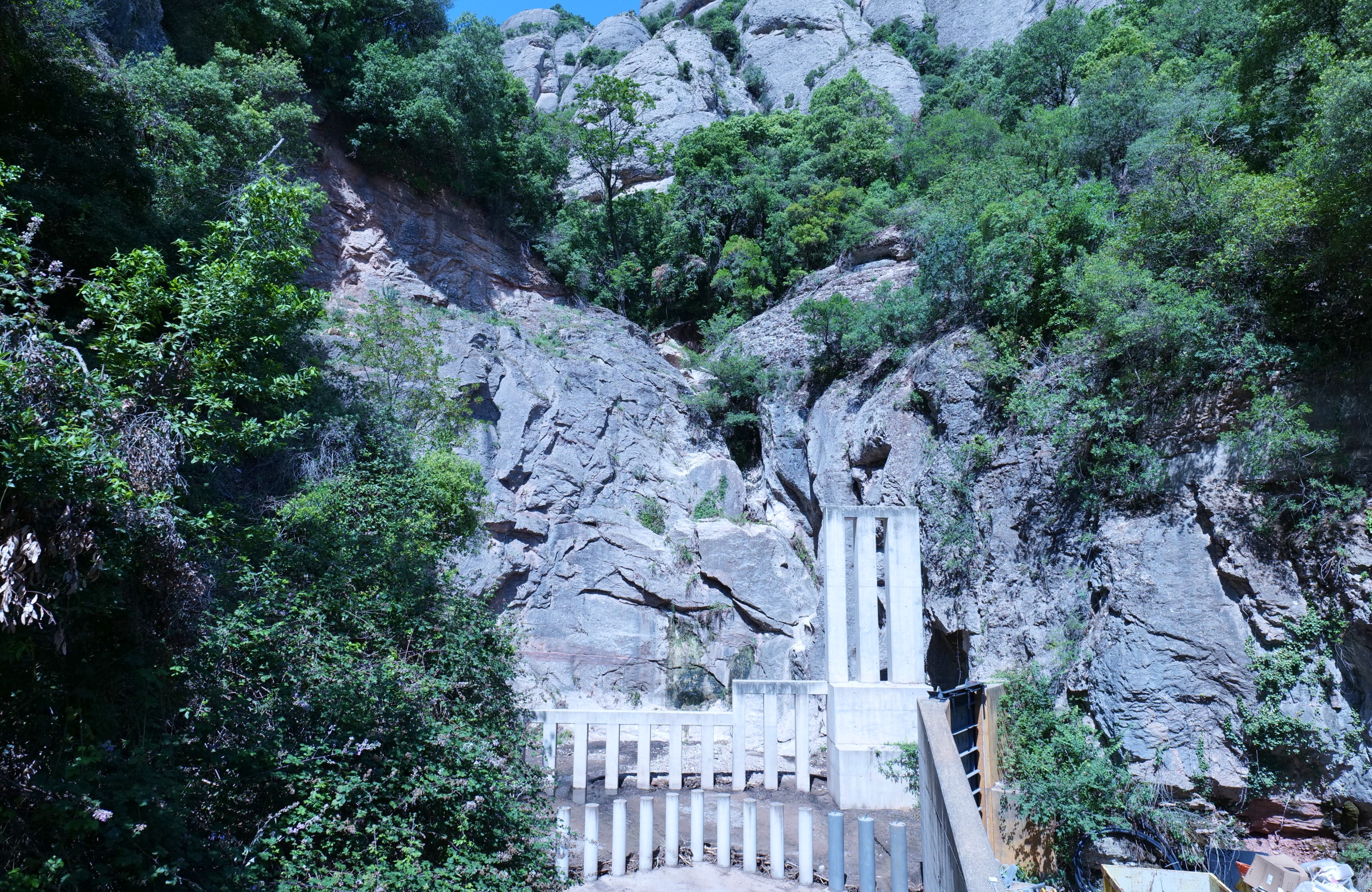 계곡에서 떨어지는 나무 등 부유물을 막기위해 콘크리트 기둥을 세웠나 보다.