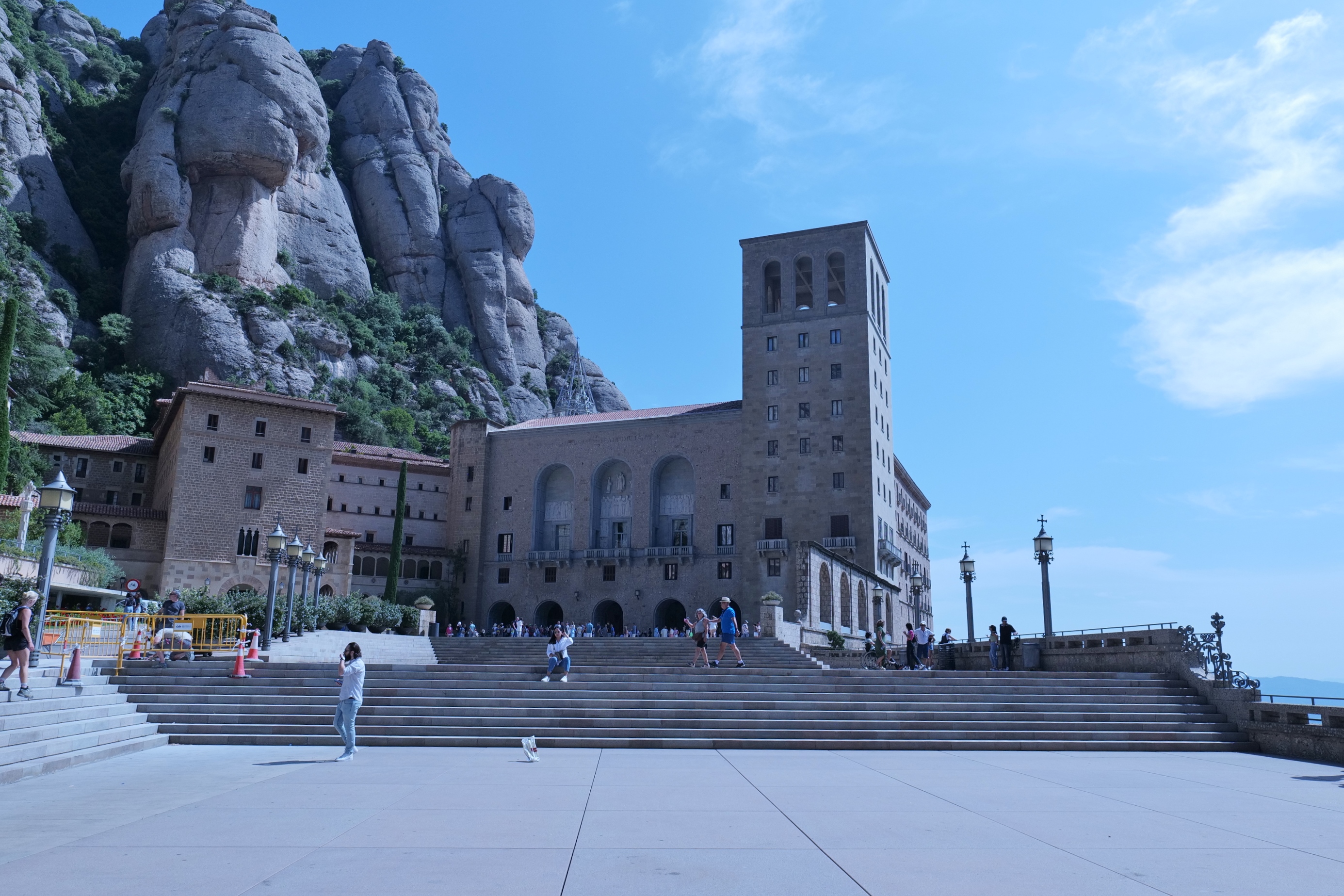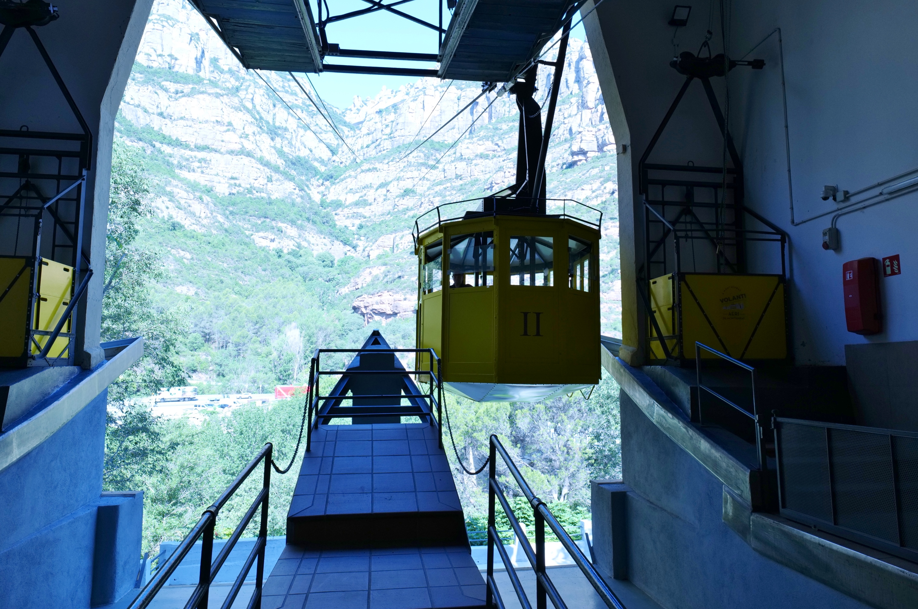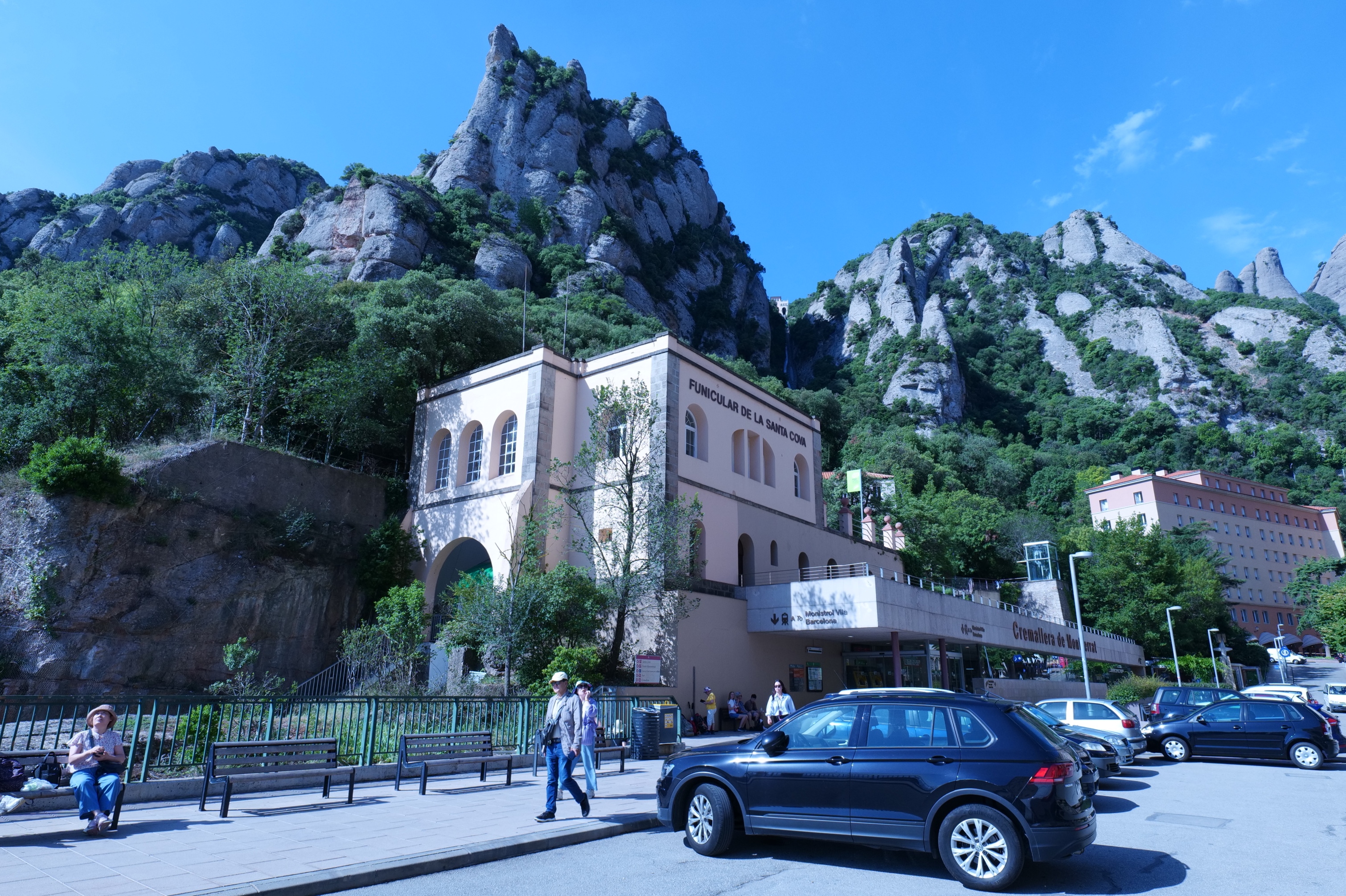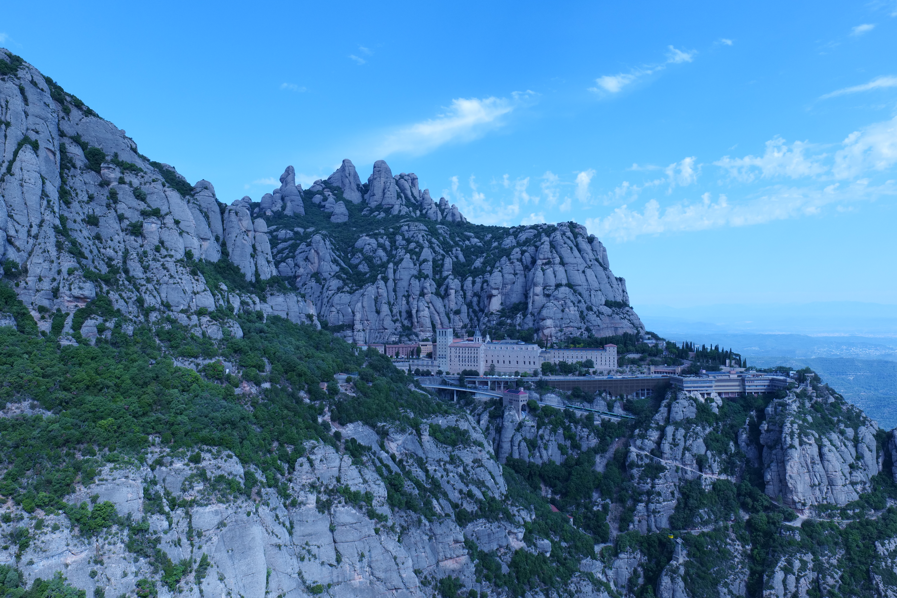 노란 케이블카가 도착하는 계곡 상부에 몬세라트 수도원이 있다.