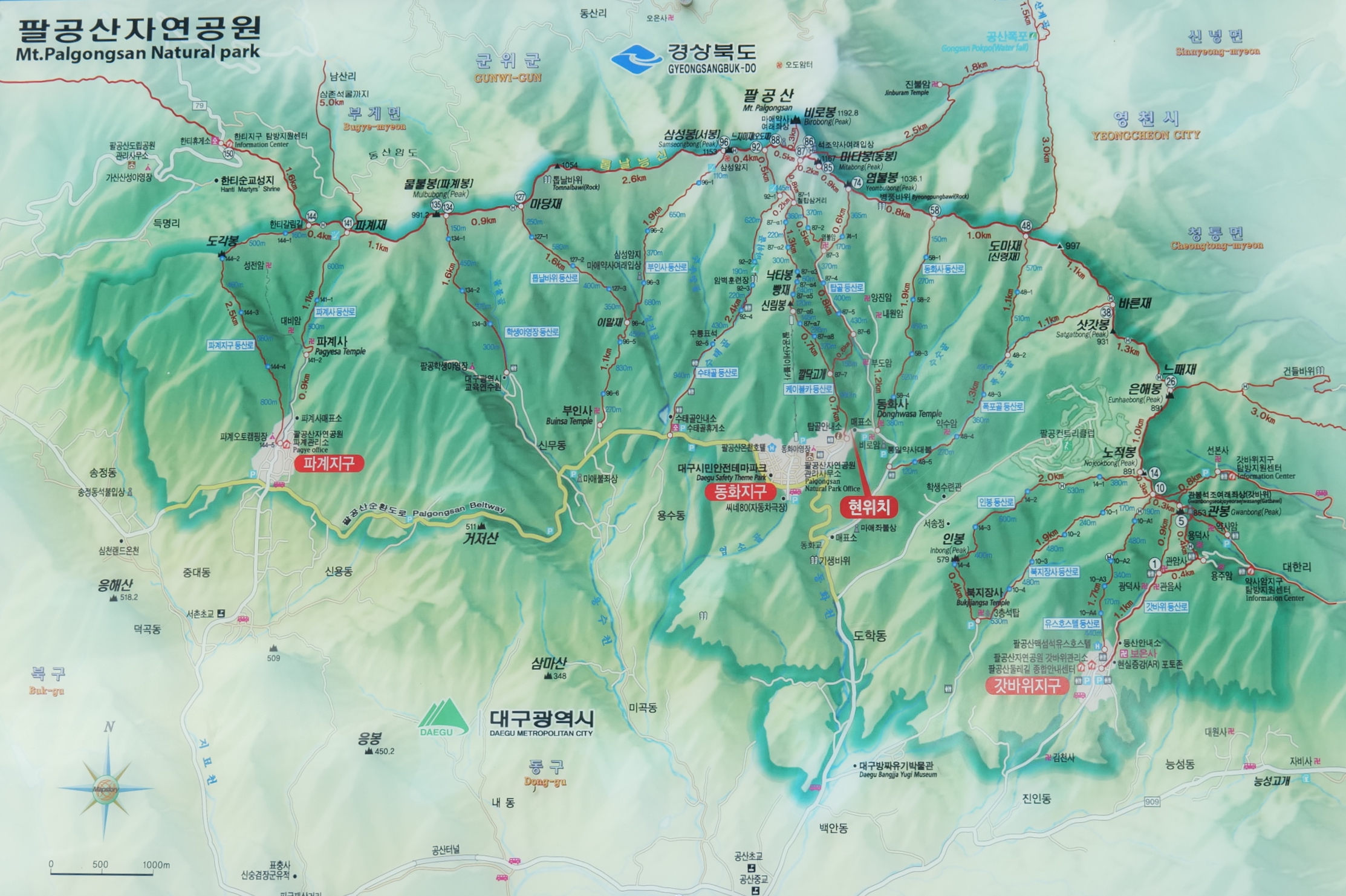 최고봉인 비로봉(1,192n) 남쪽 기슭에 동화사가 있으며, 동쪽엔 은해사, 서쪽엔 파계사 등의 고찰이 있다.