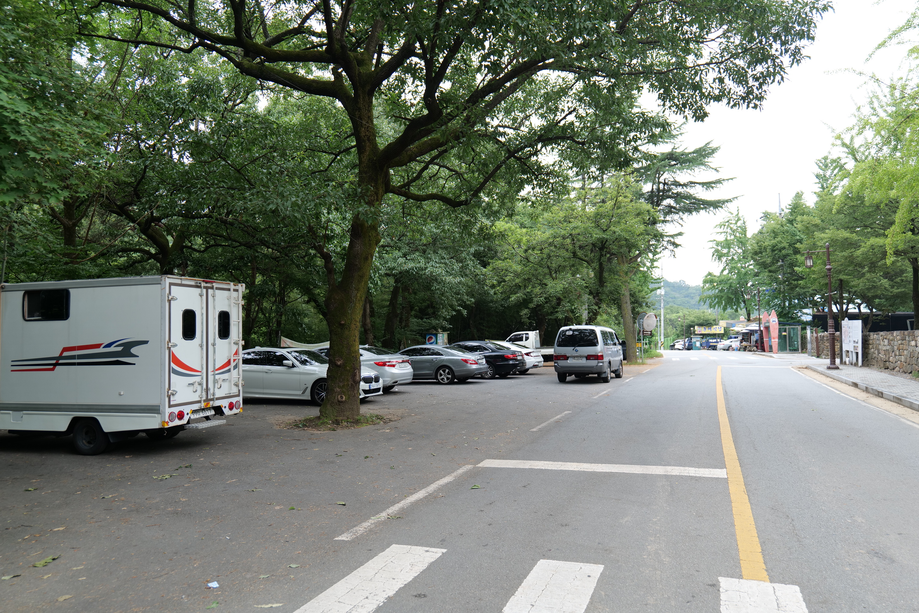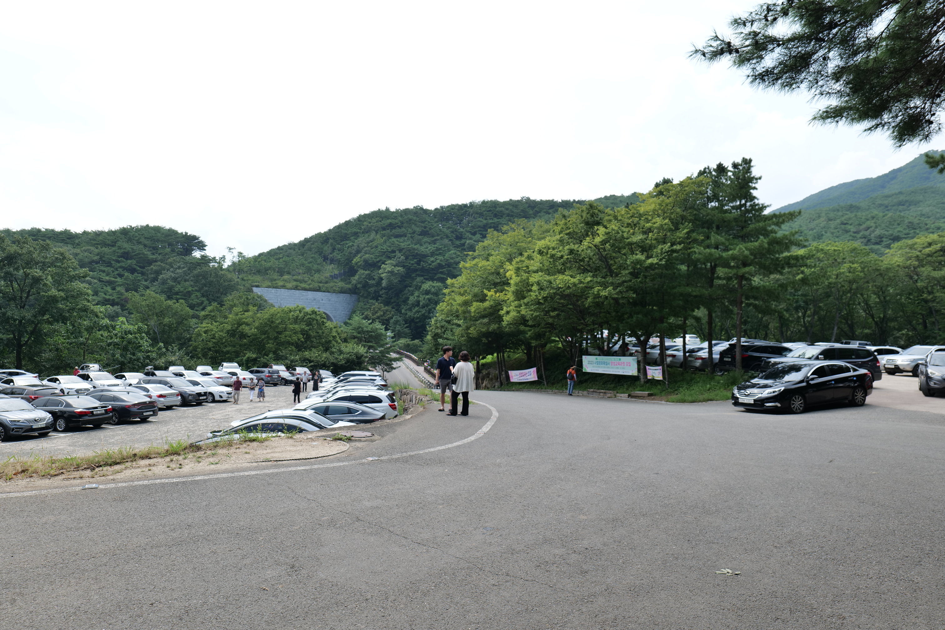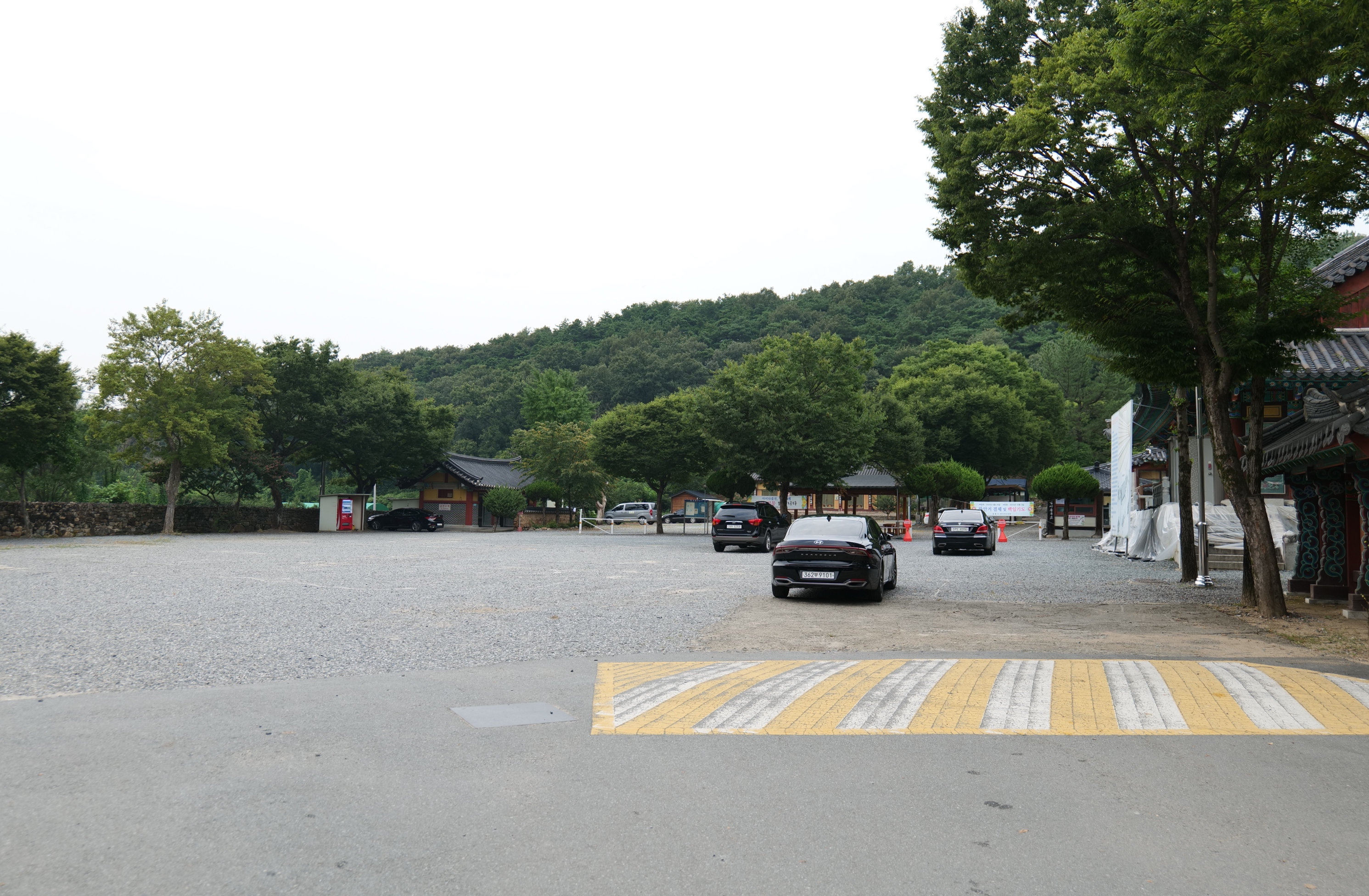 구룡사 앞에 차량 몇 대 주차공간이 있다.