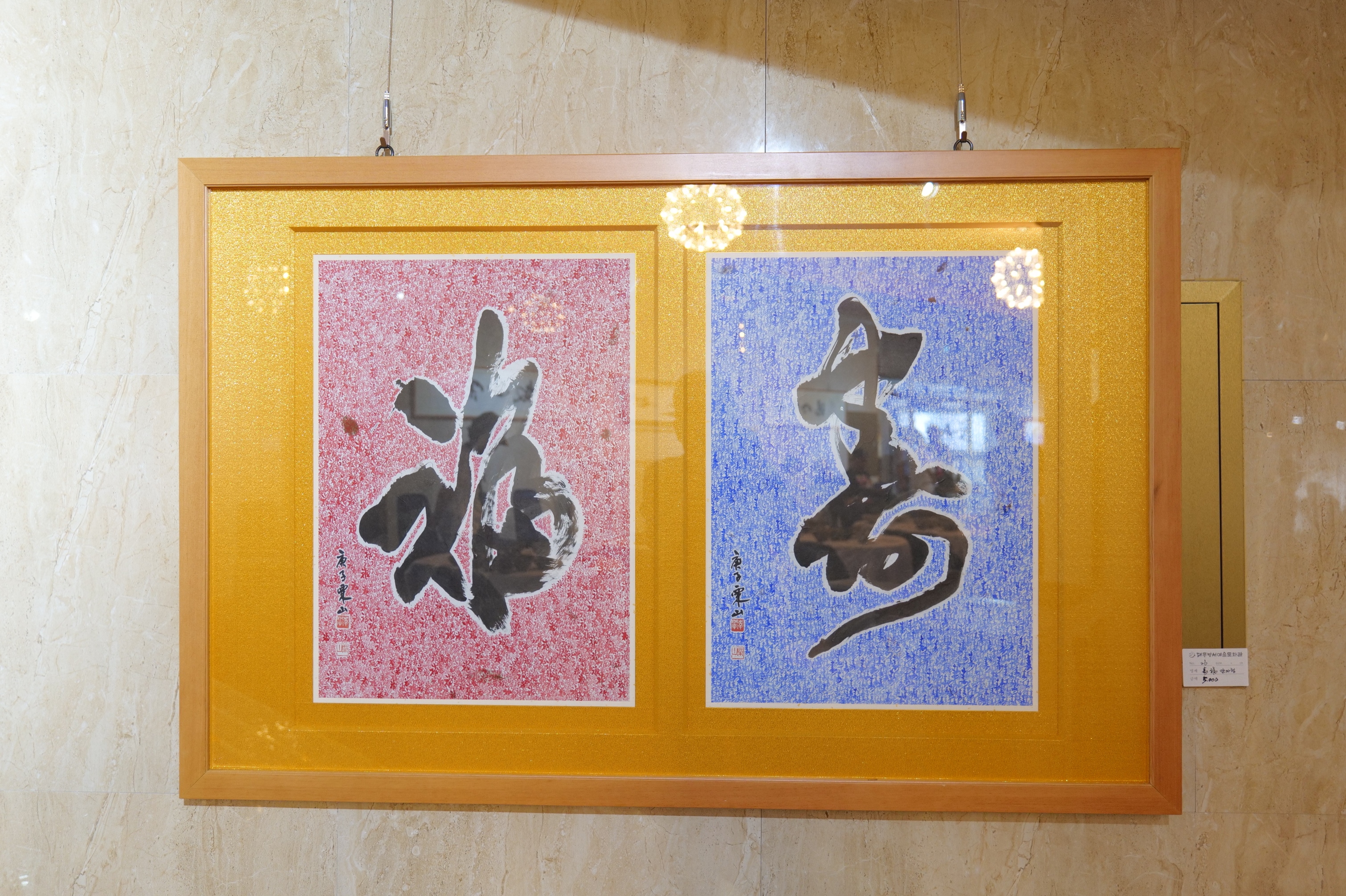 붉고 푸른 배경은 큰 글자와 같은 작게 쓴 무수히 많은 글씨이다.