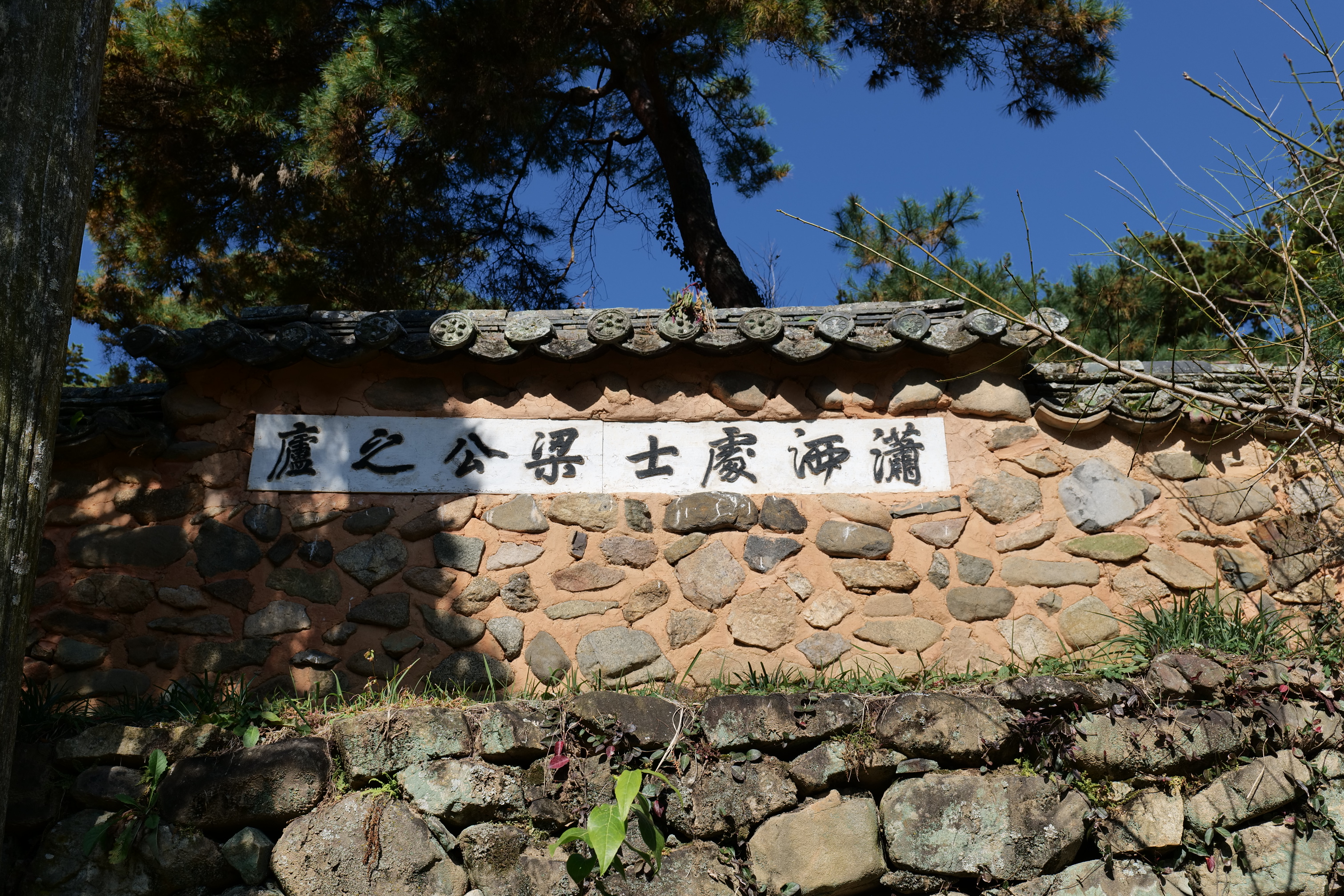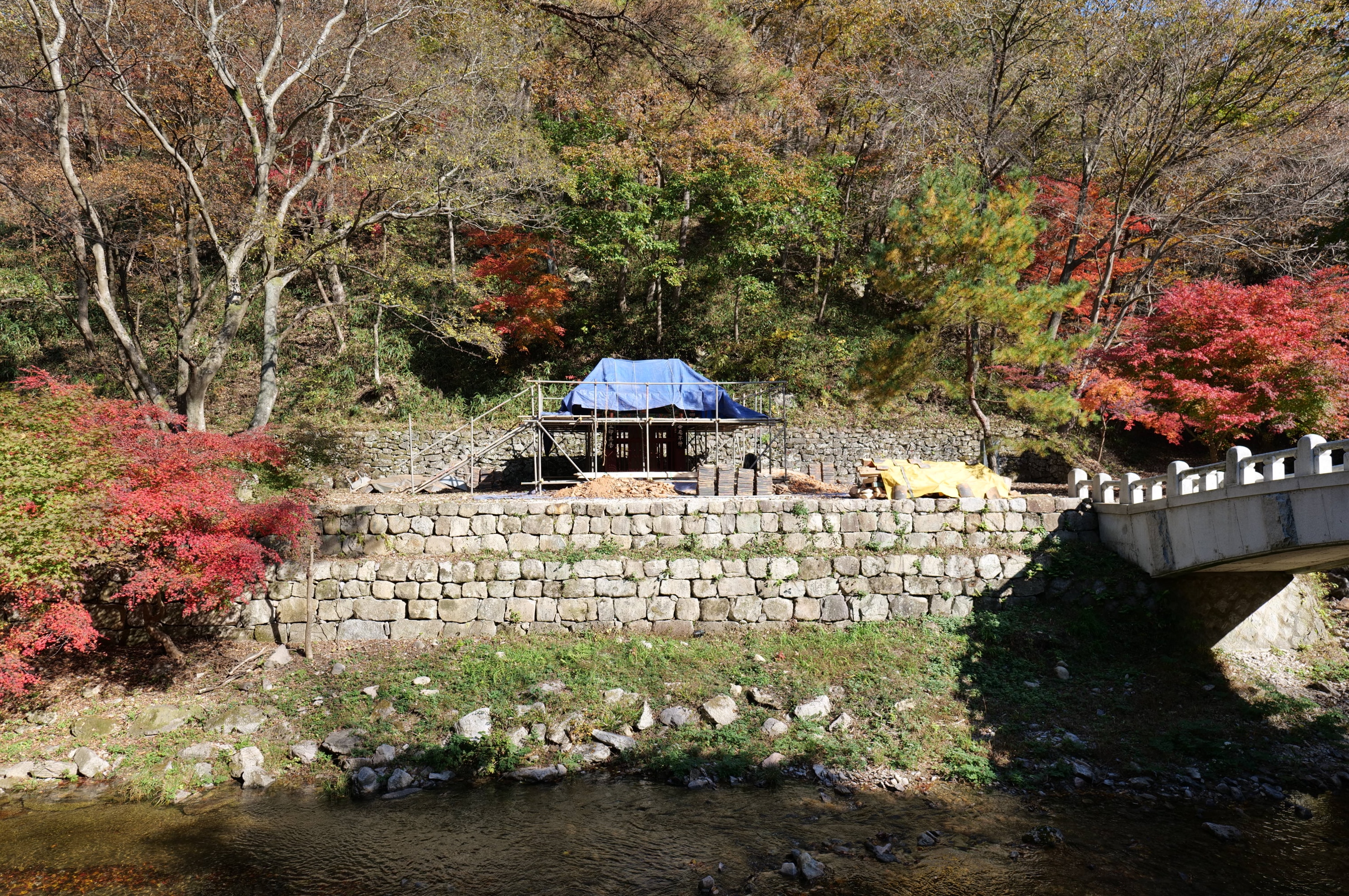 다리 건너편 언덕은 돌담으로 단을(梅臺) 만들었음이 보이고 윗쪽으로 소쇄처사양공지려 표지석이 조그마하게 보이는 담이 있다.