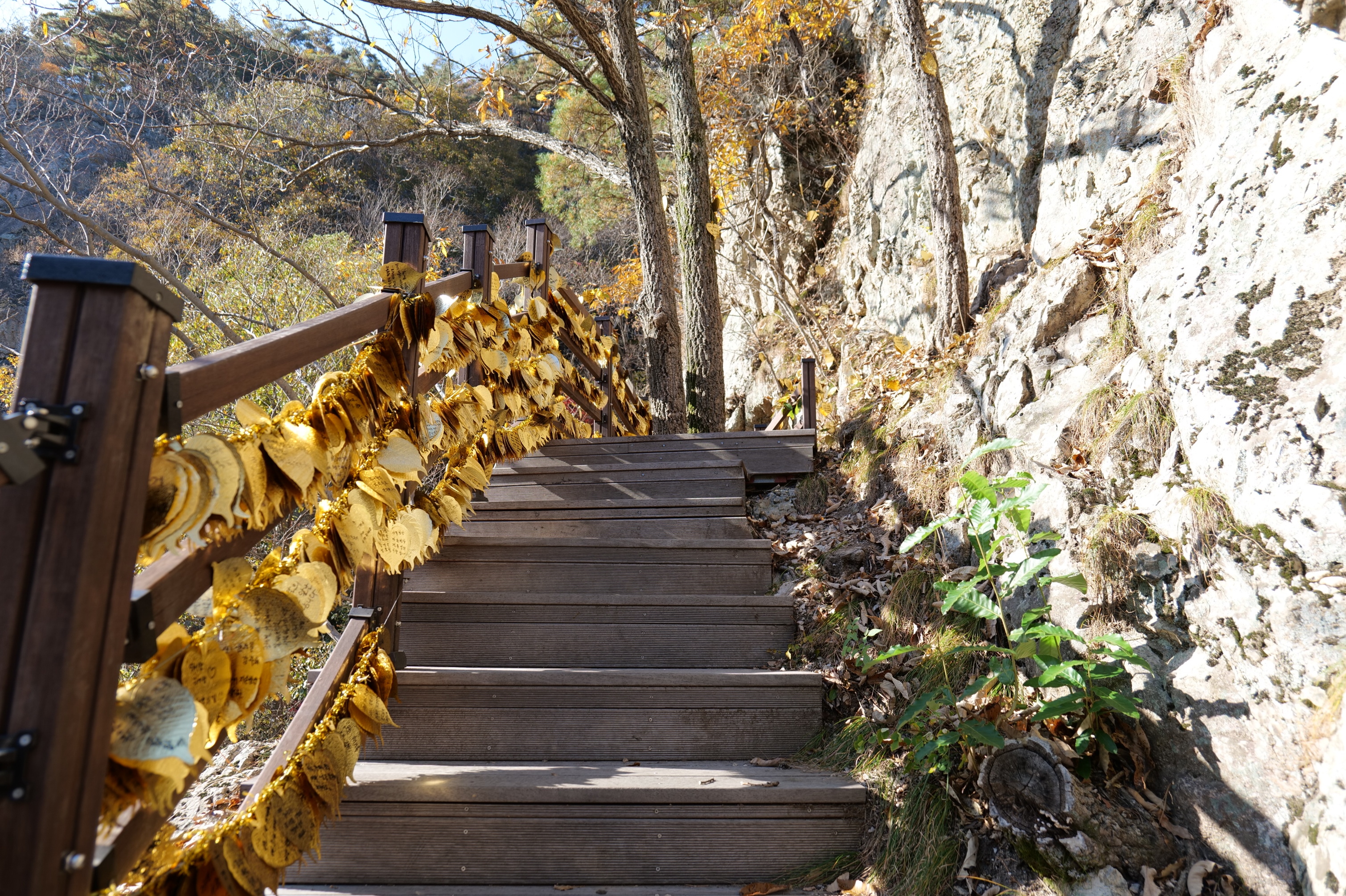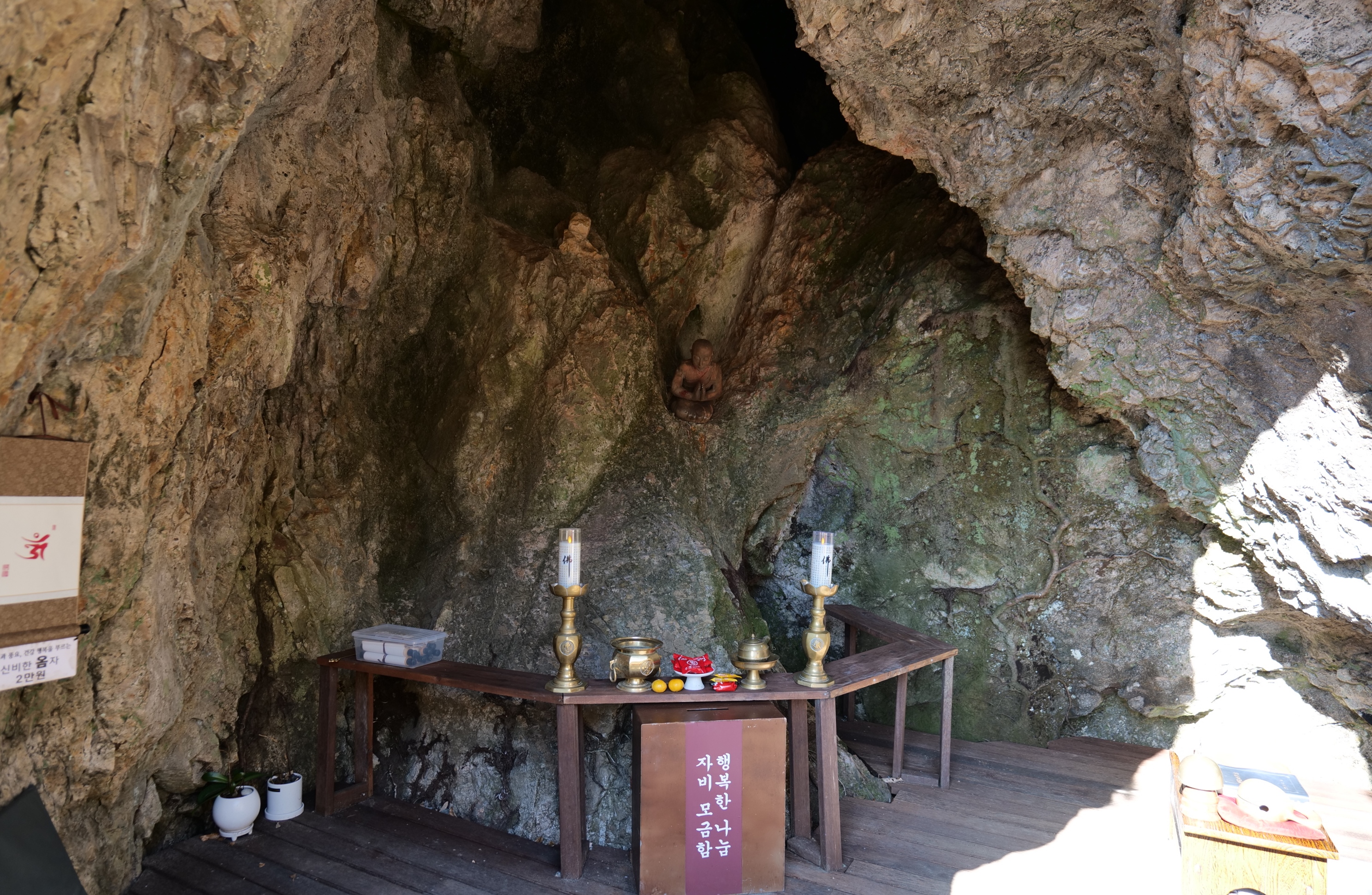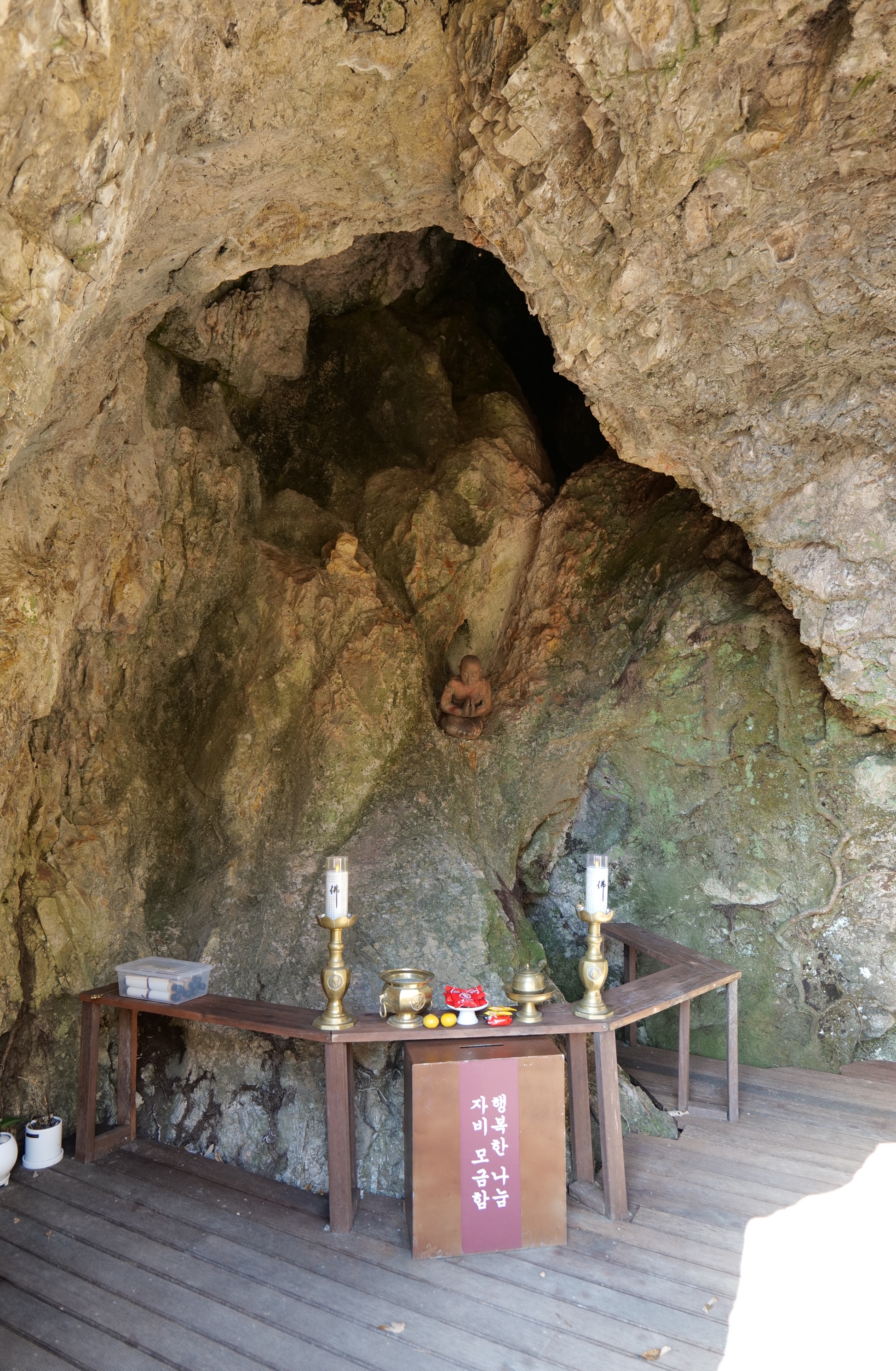 갈림길 이정표엔 70m로 표시되어 있어 보기보다 가깝다. 수좌굴이 암벽 중턱에 있어 제법 오르막을 보이나 생각만큼 심하지 않다.