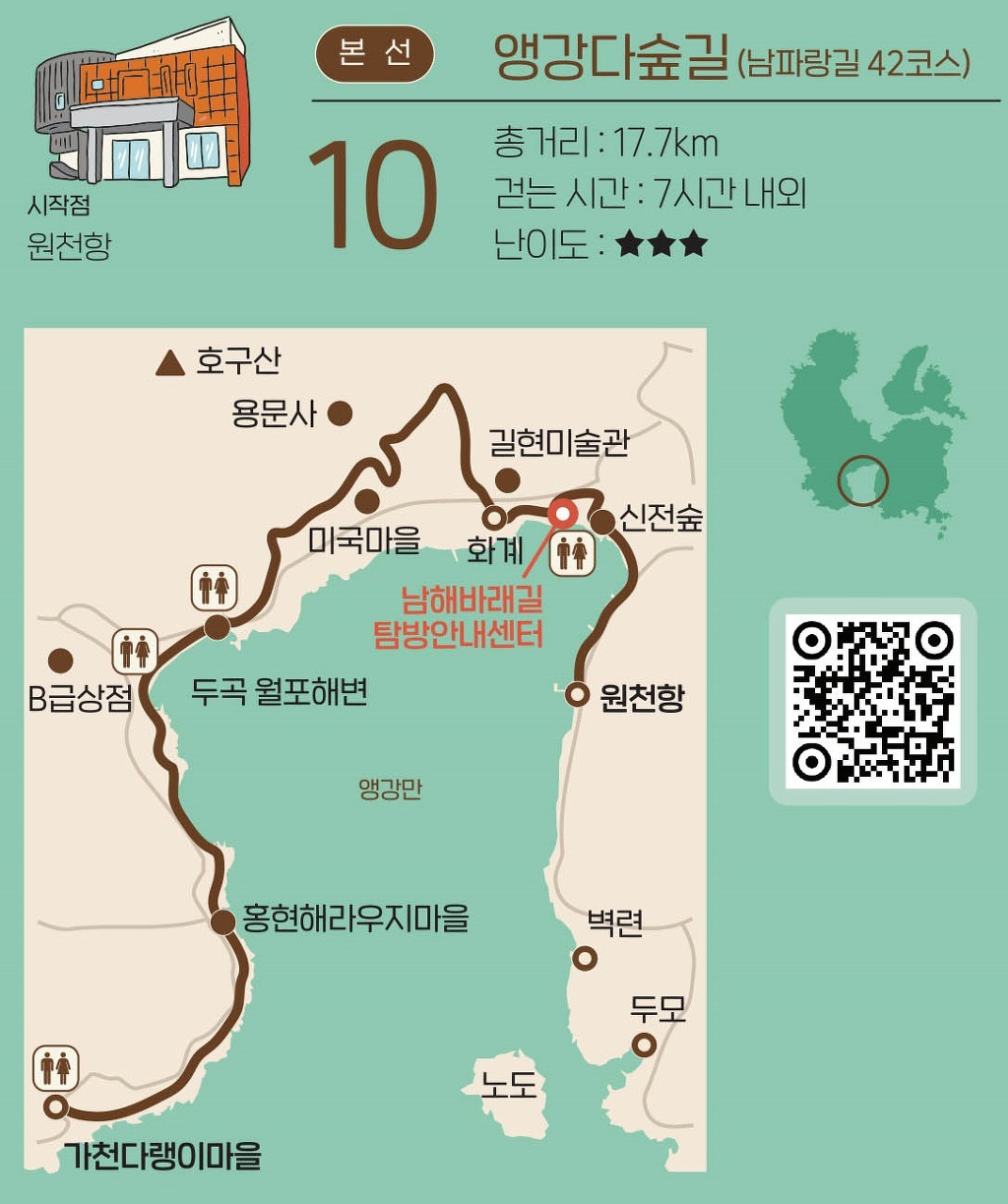 이 안내도는 앵강다숲길 시작점을 원천항으로 소개되어 있으나, 앵강다숲 인근의 남해바래길 탐방안내센터에서 시작한다고 보면 된다. 가천다랭이마을까지 15.6km, 6시간 전후 소요.