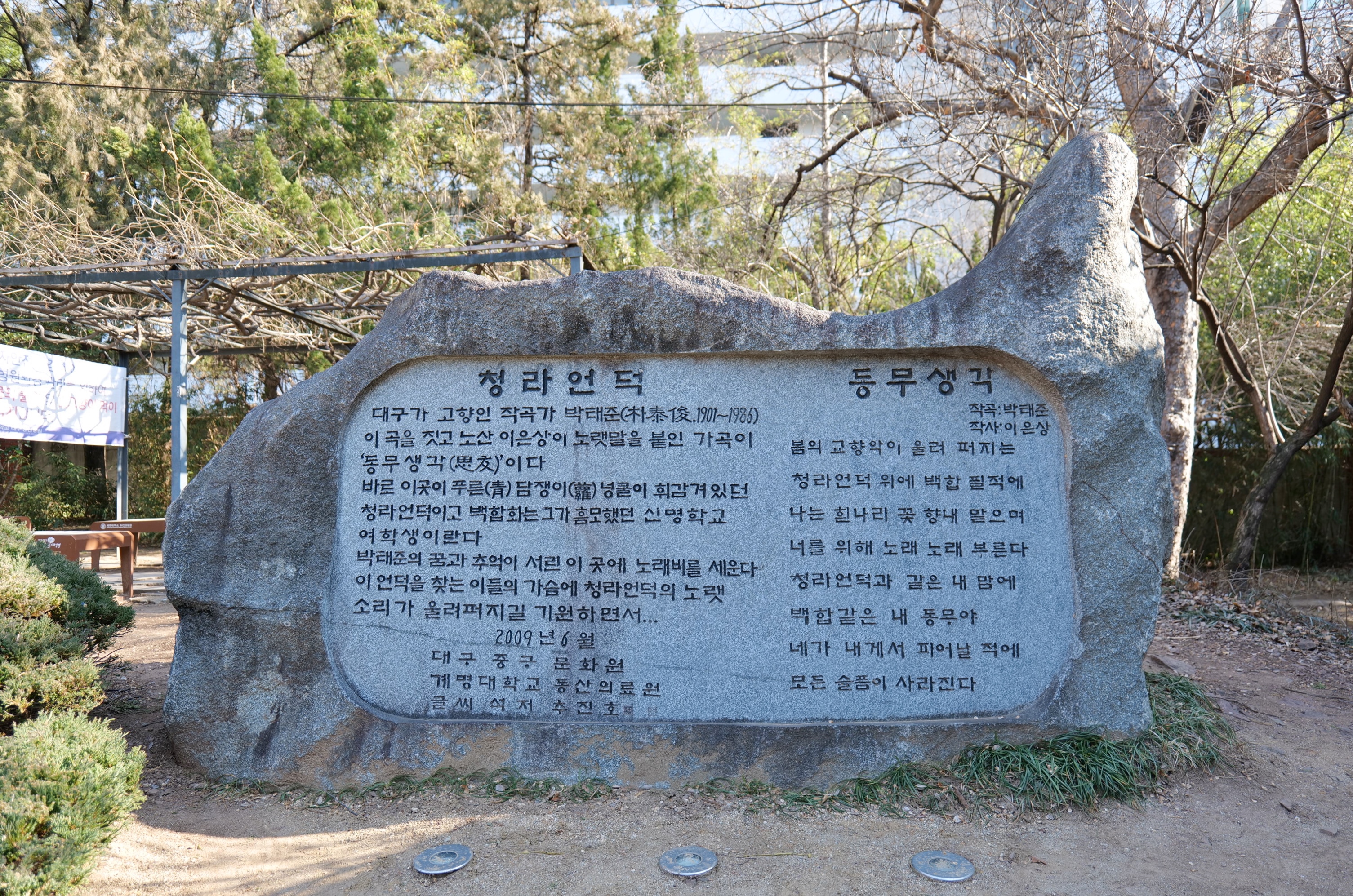 바로 이곳이 푸른(靑) 담쟁이(蘿/소나무겨우살이 라) 넝쿨이 휘감겨있던 청라언덕이고 백합화는 그가 흠모했던 신명학교 여학생이란다.