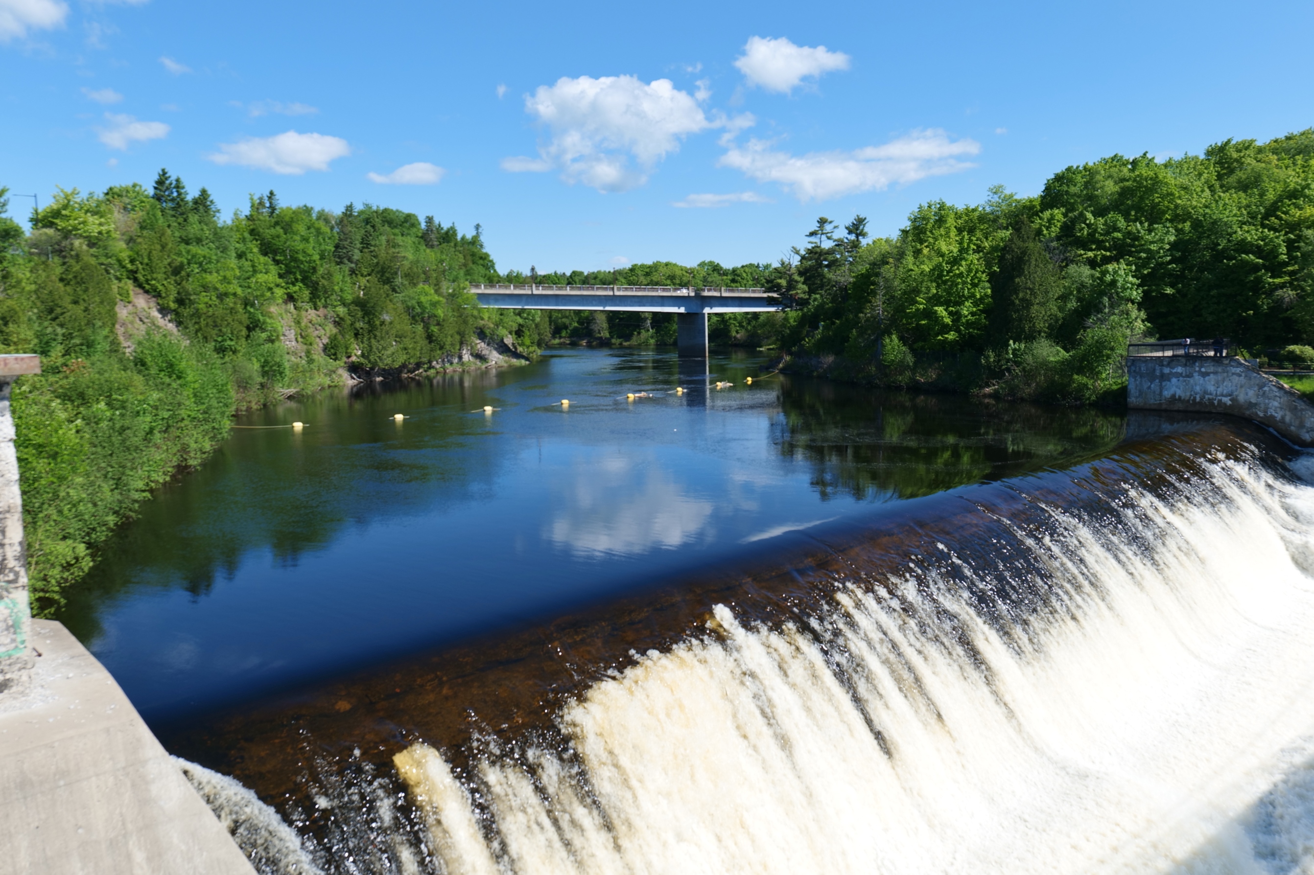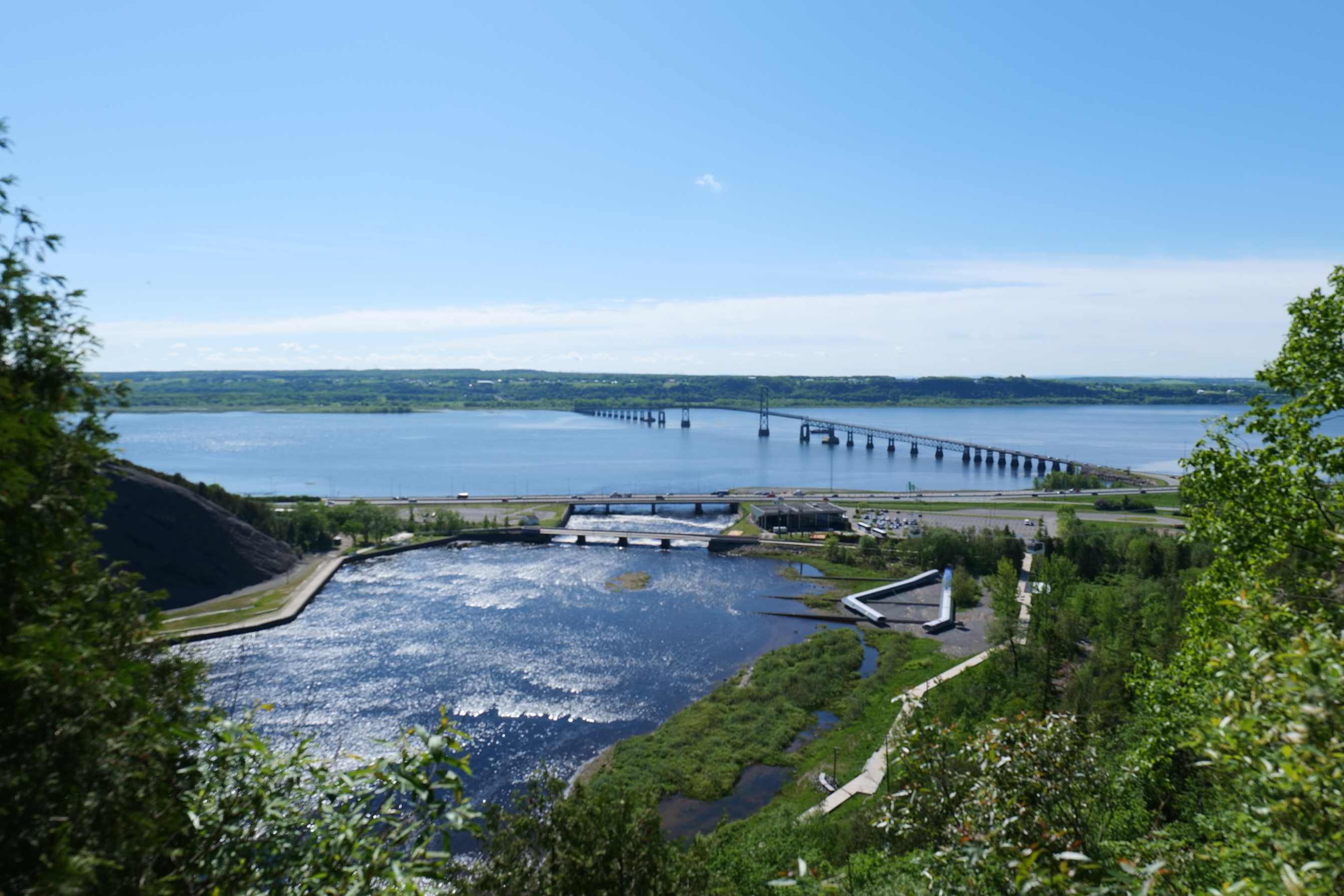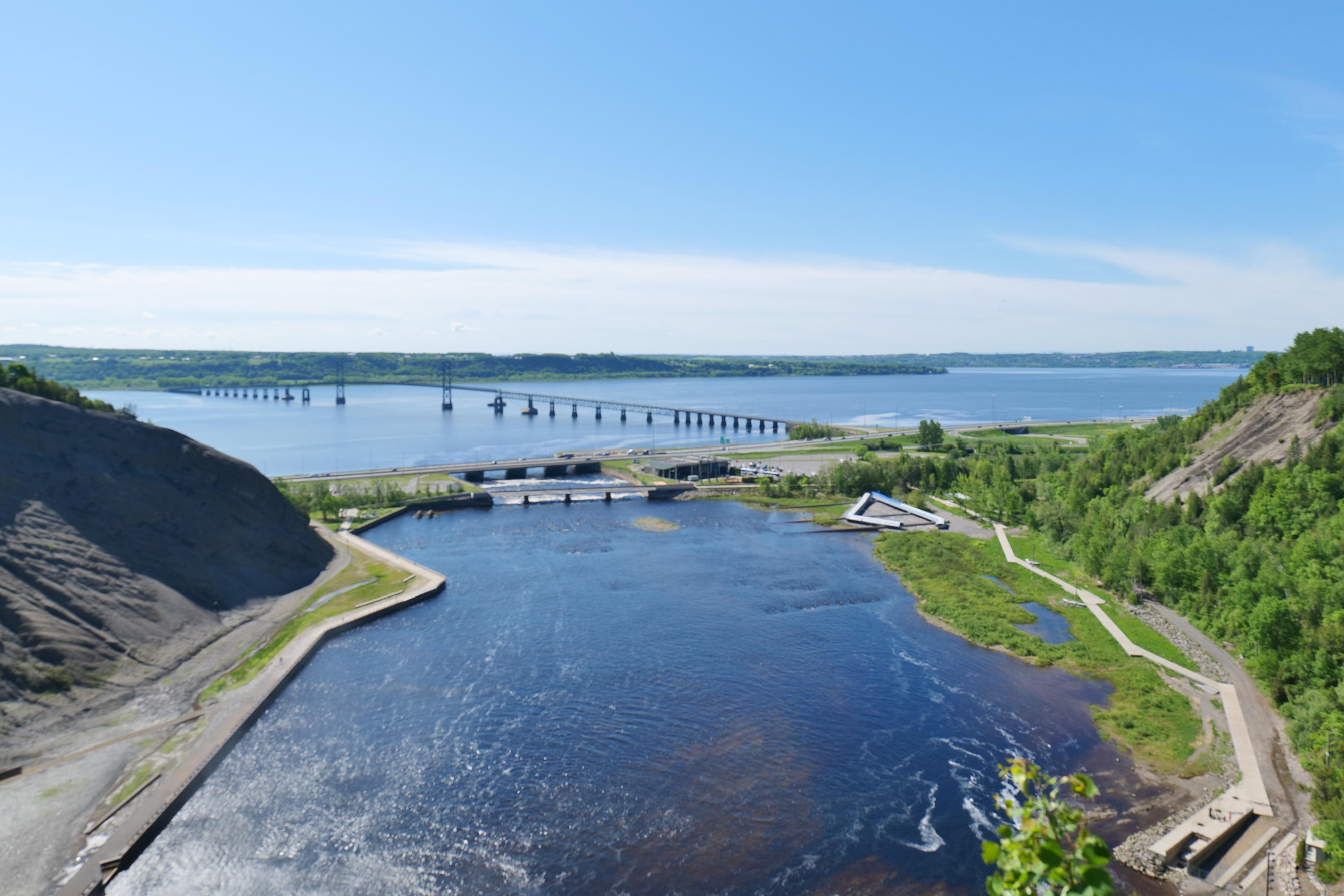 사진상 보이는 세인트로렌스 강은 우측에서 좌측으로 흐르고 다리 건너편 육지처럼 보이는 곳이 오흘레흥 섬이다. 섬의 크기가 매우 크다.