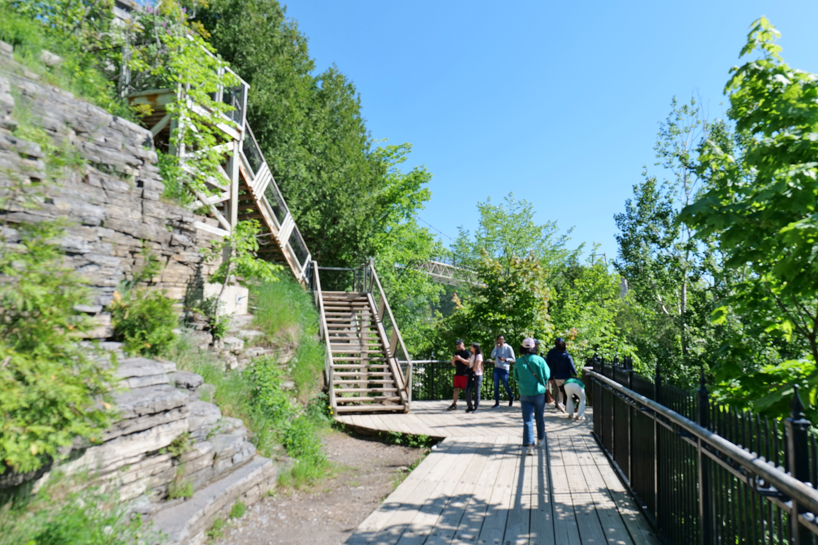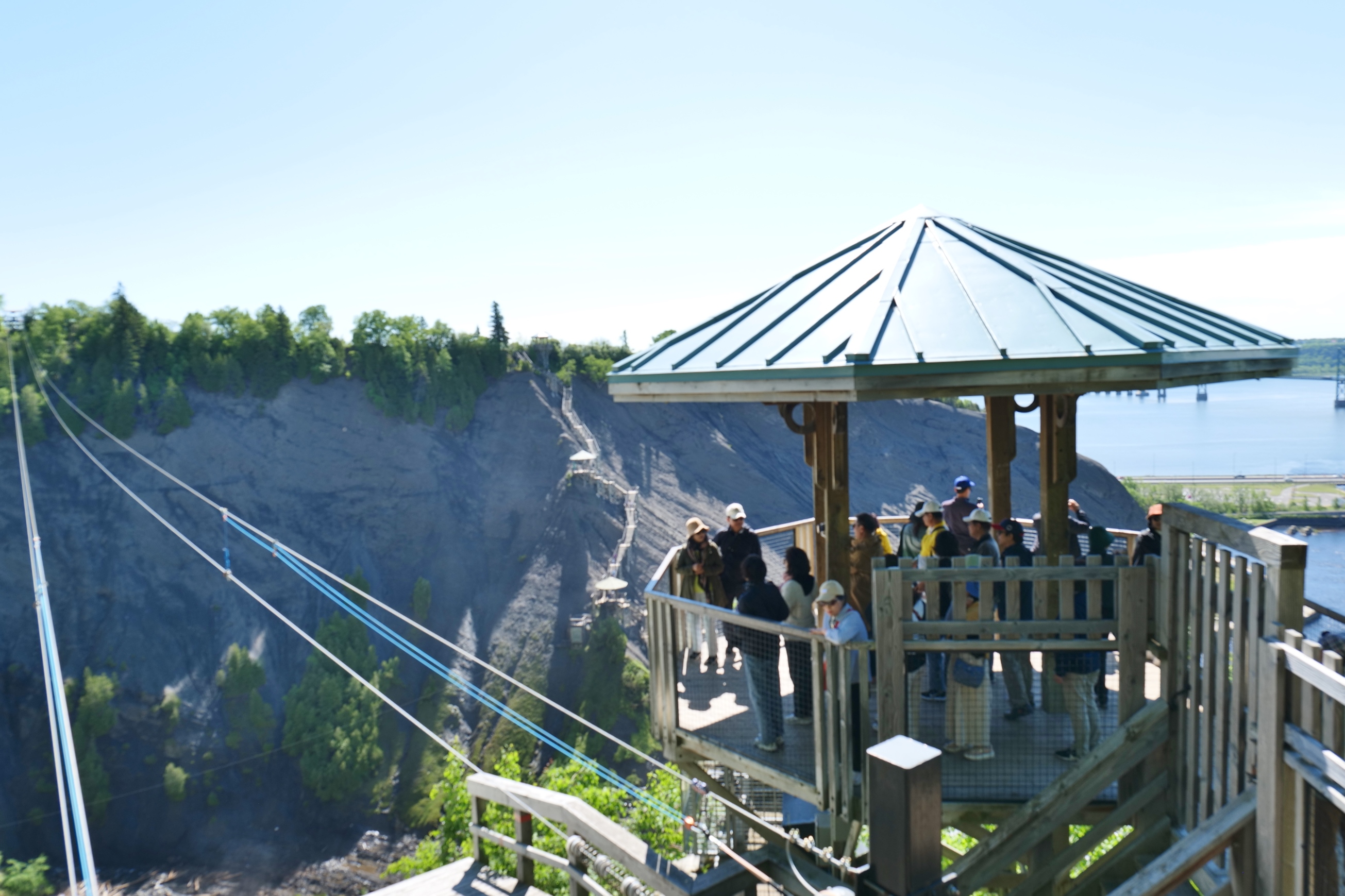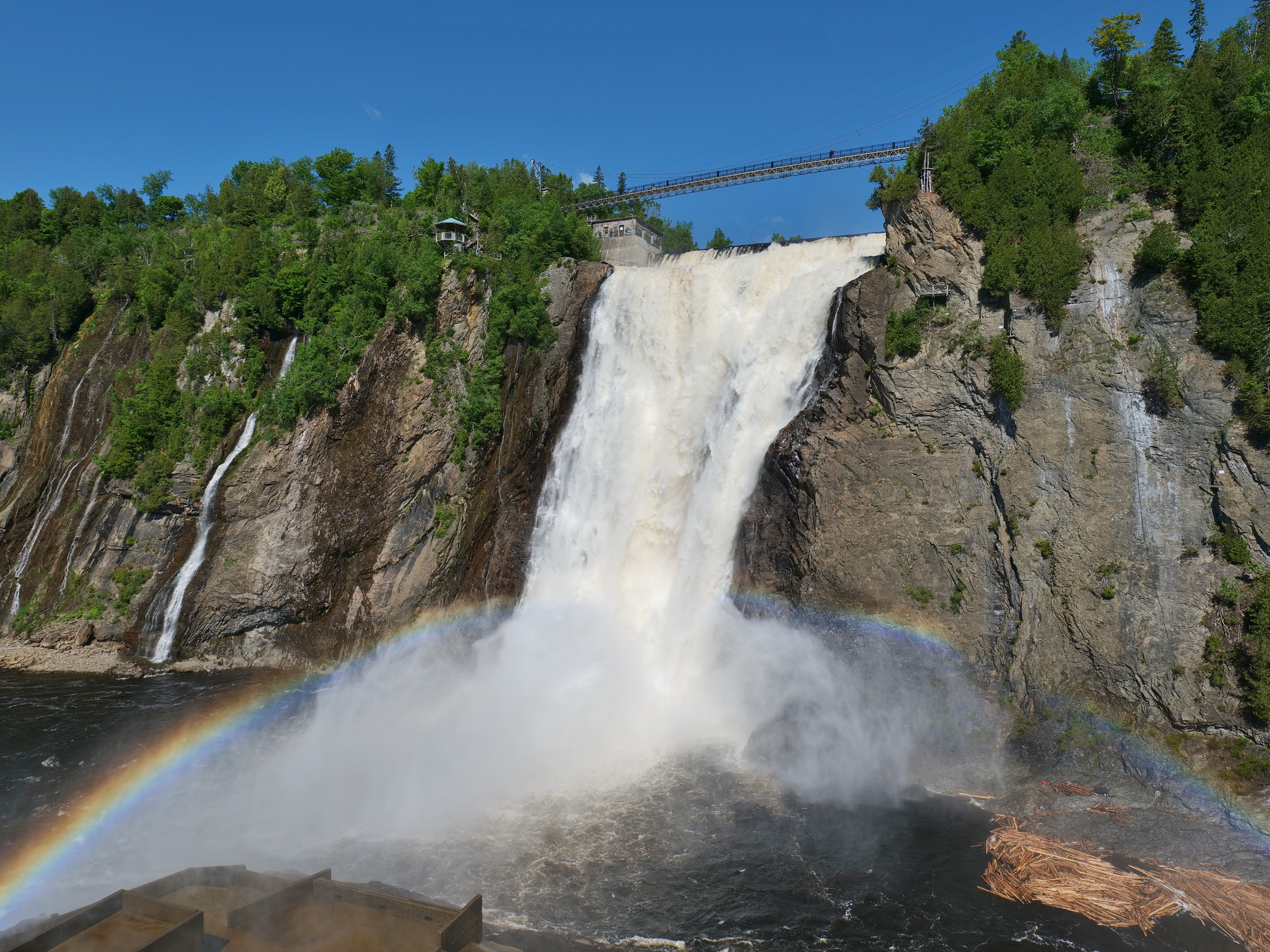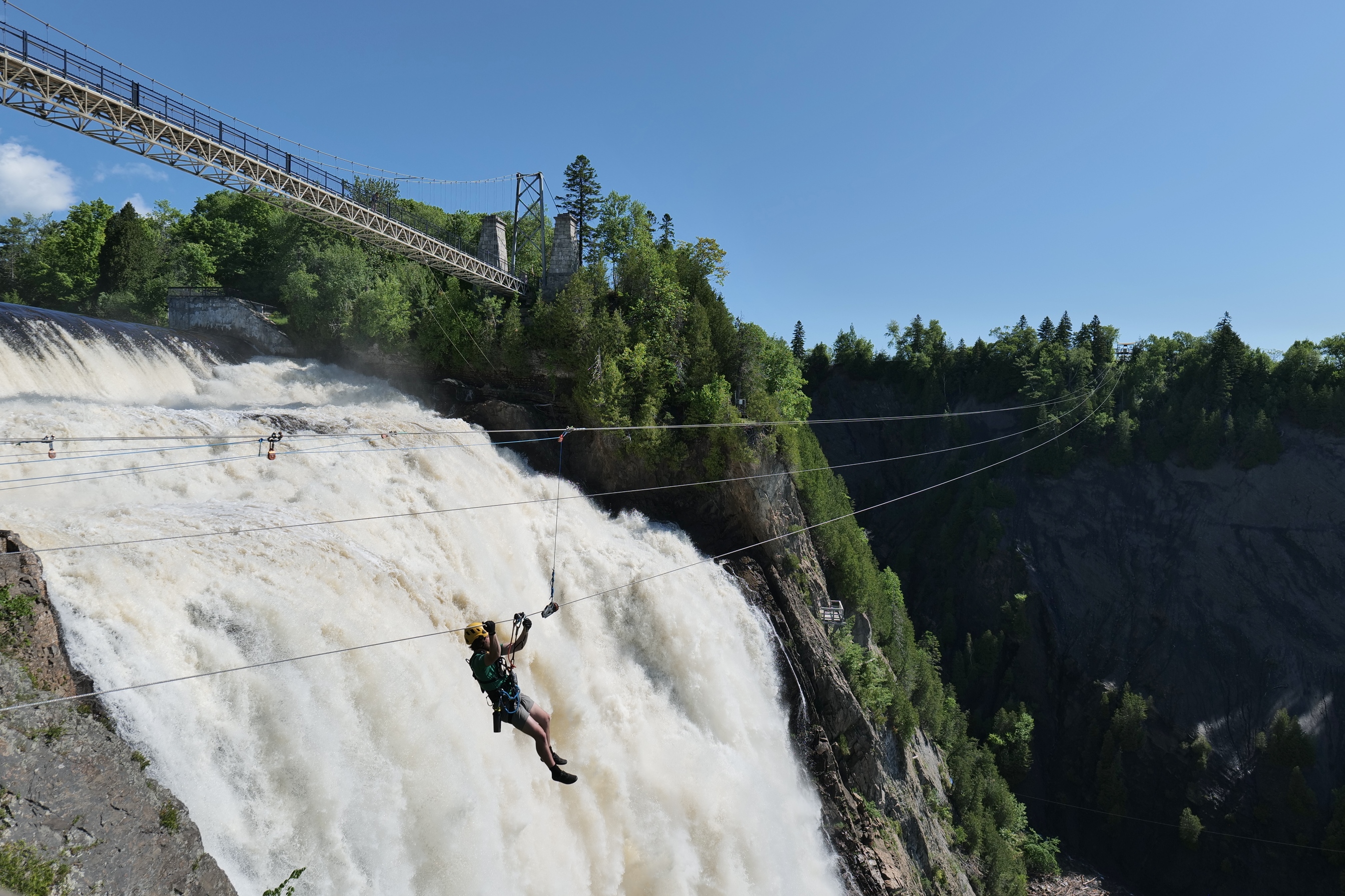 폭포 위를 가로지르는 몽모렌시 폭포 짚라인이 있다. 아마 저쪽에서 출발하여 이곳으로 도착하는 것 같다.