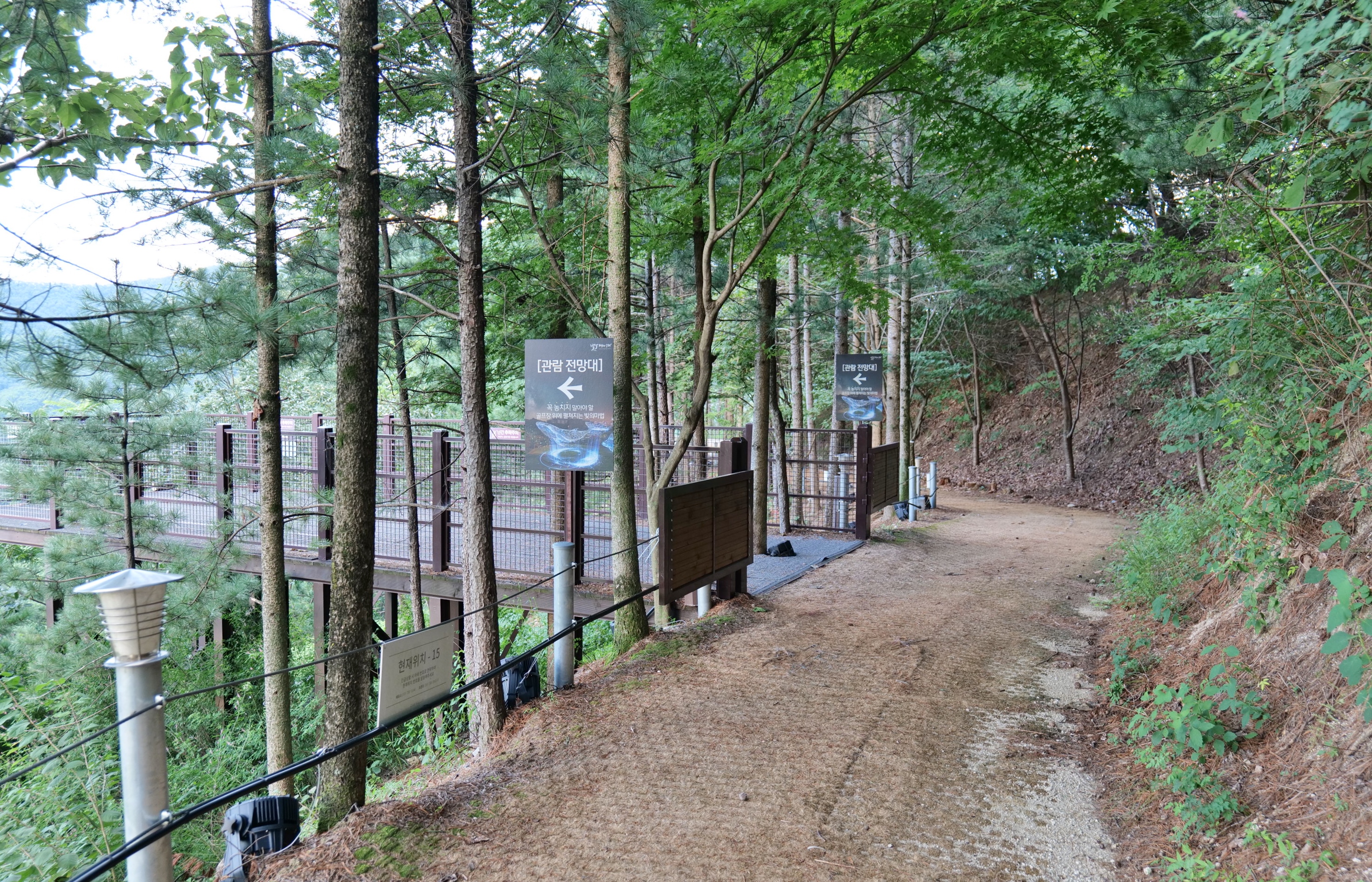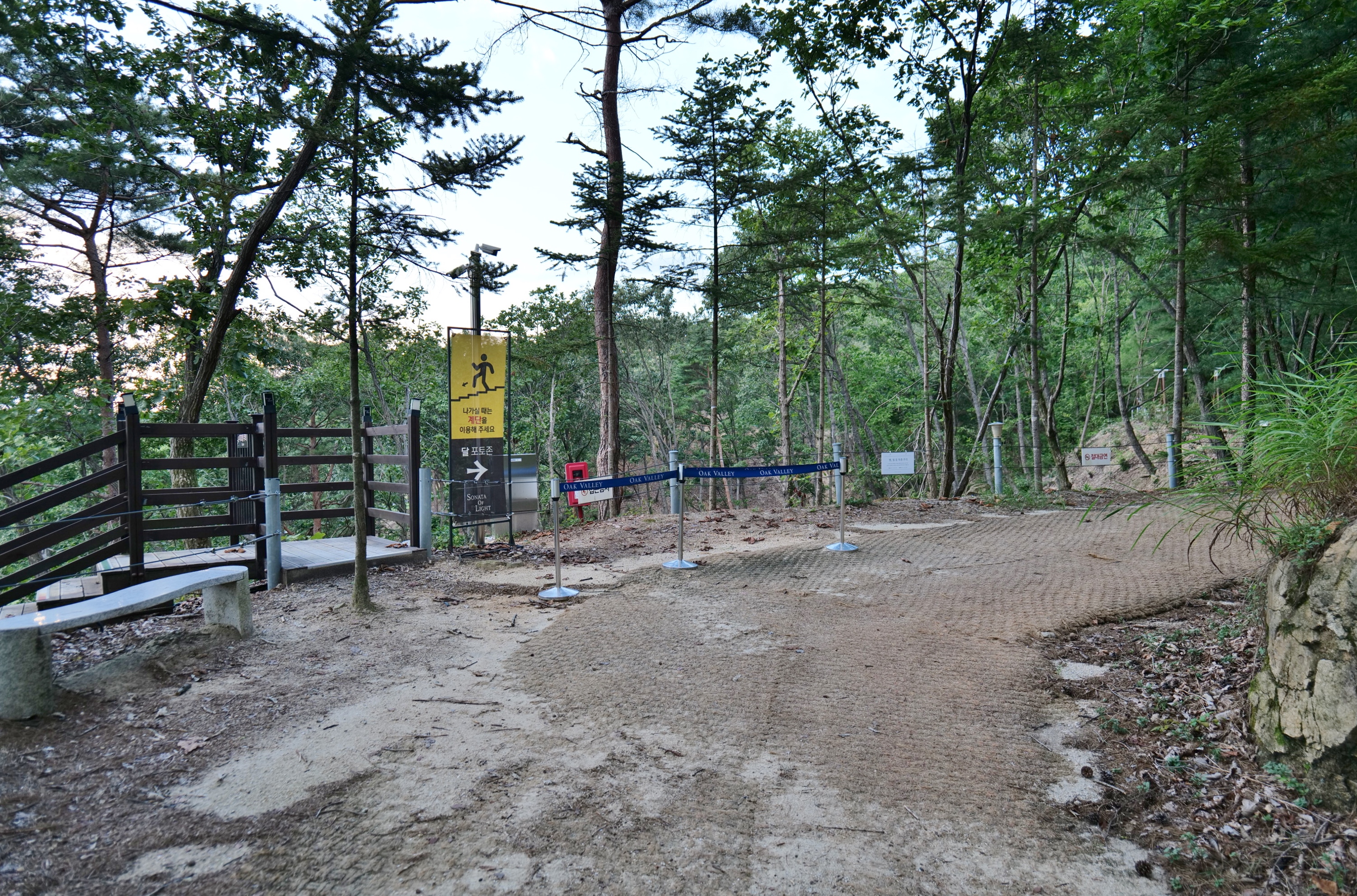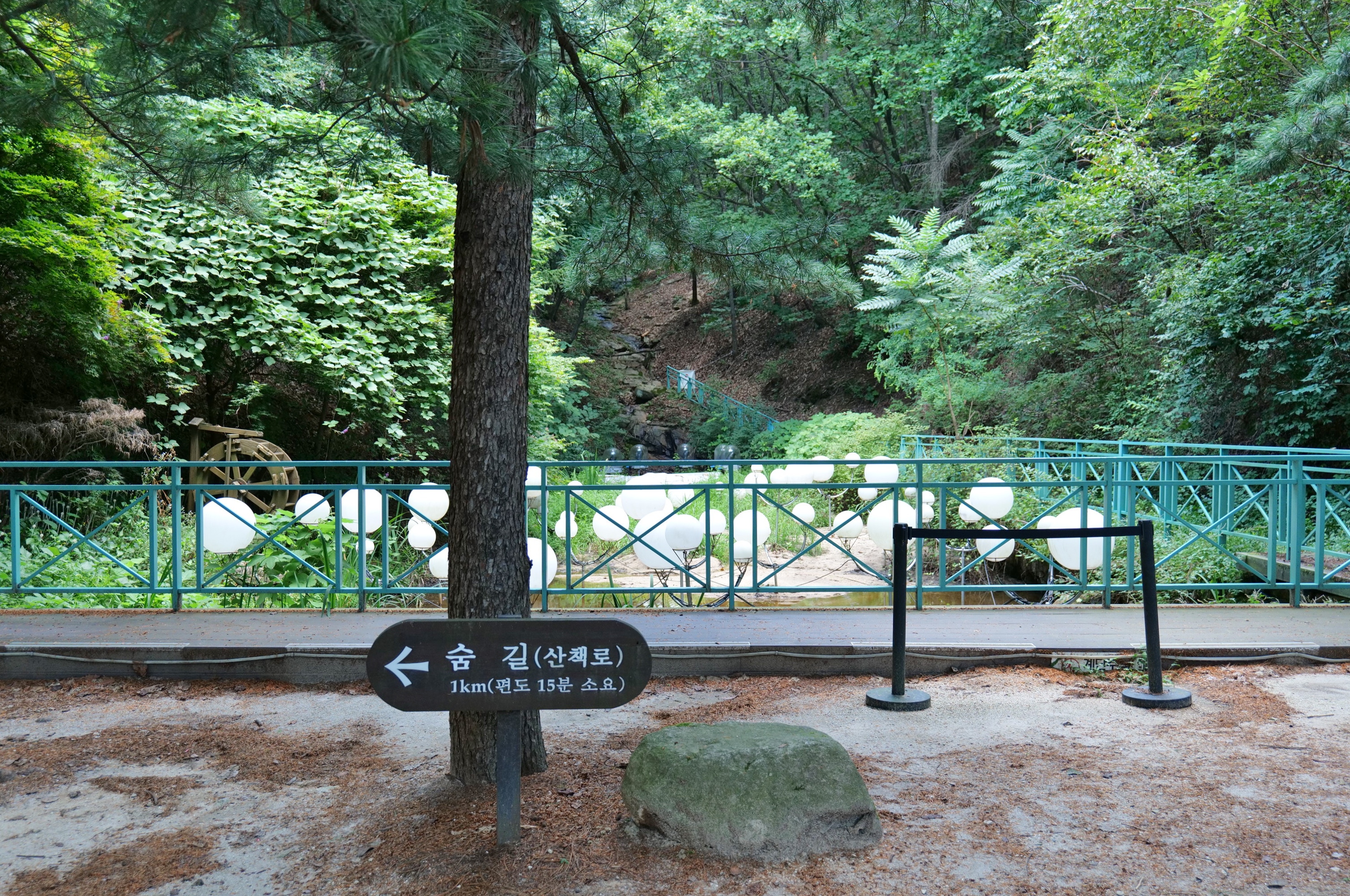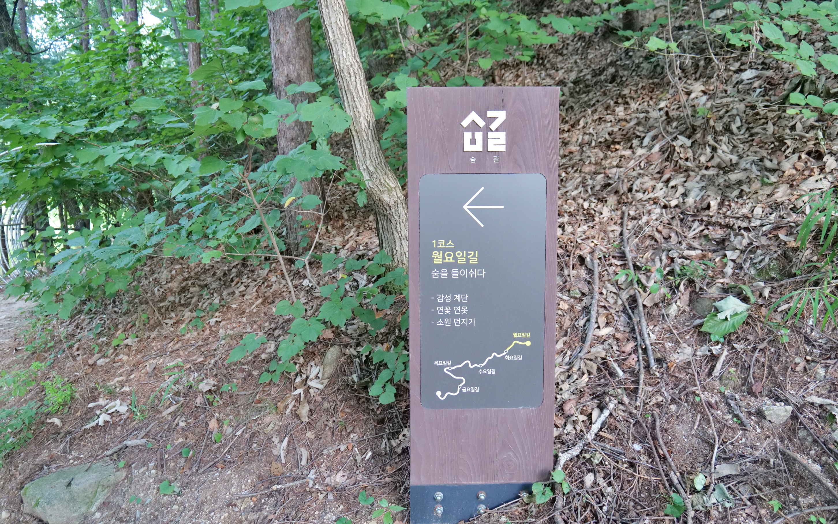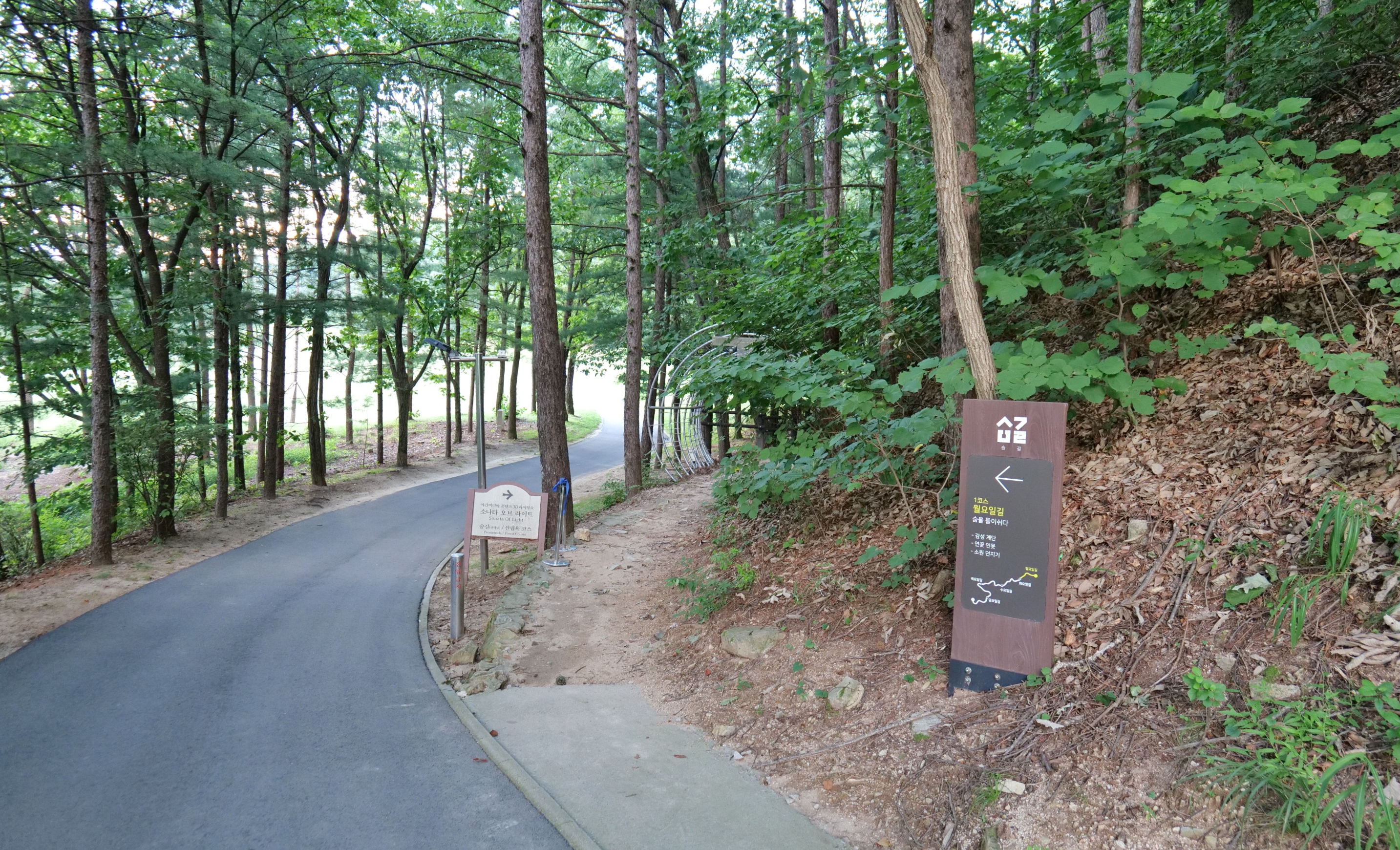 계단을 오르면 임도를 만나게 되고, 숲길(산책로) 1km,(15분 소요)안내 표지판이 있다.