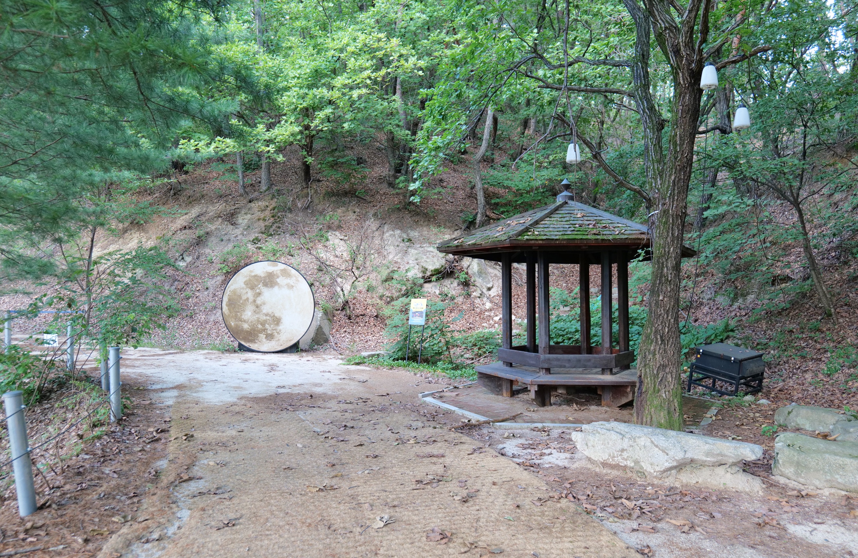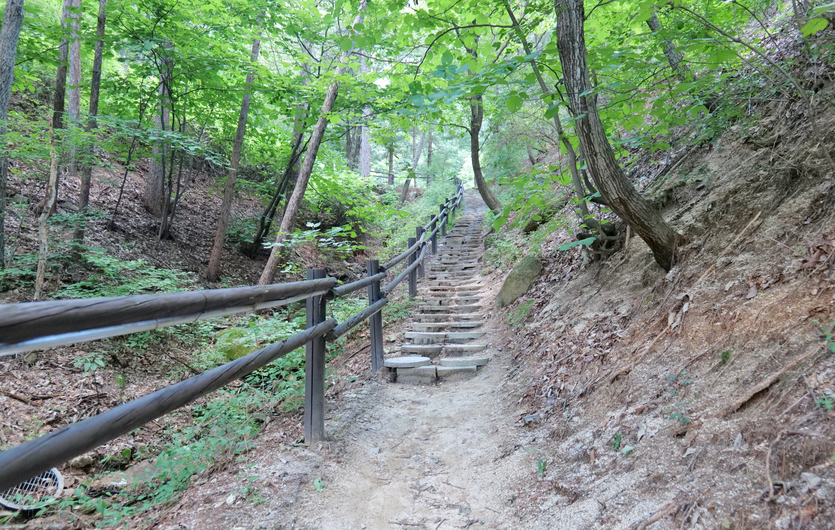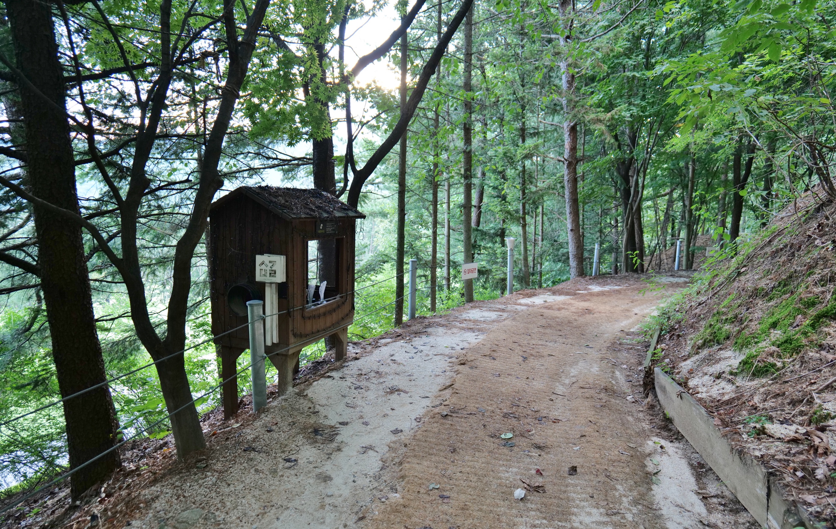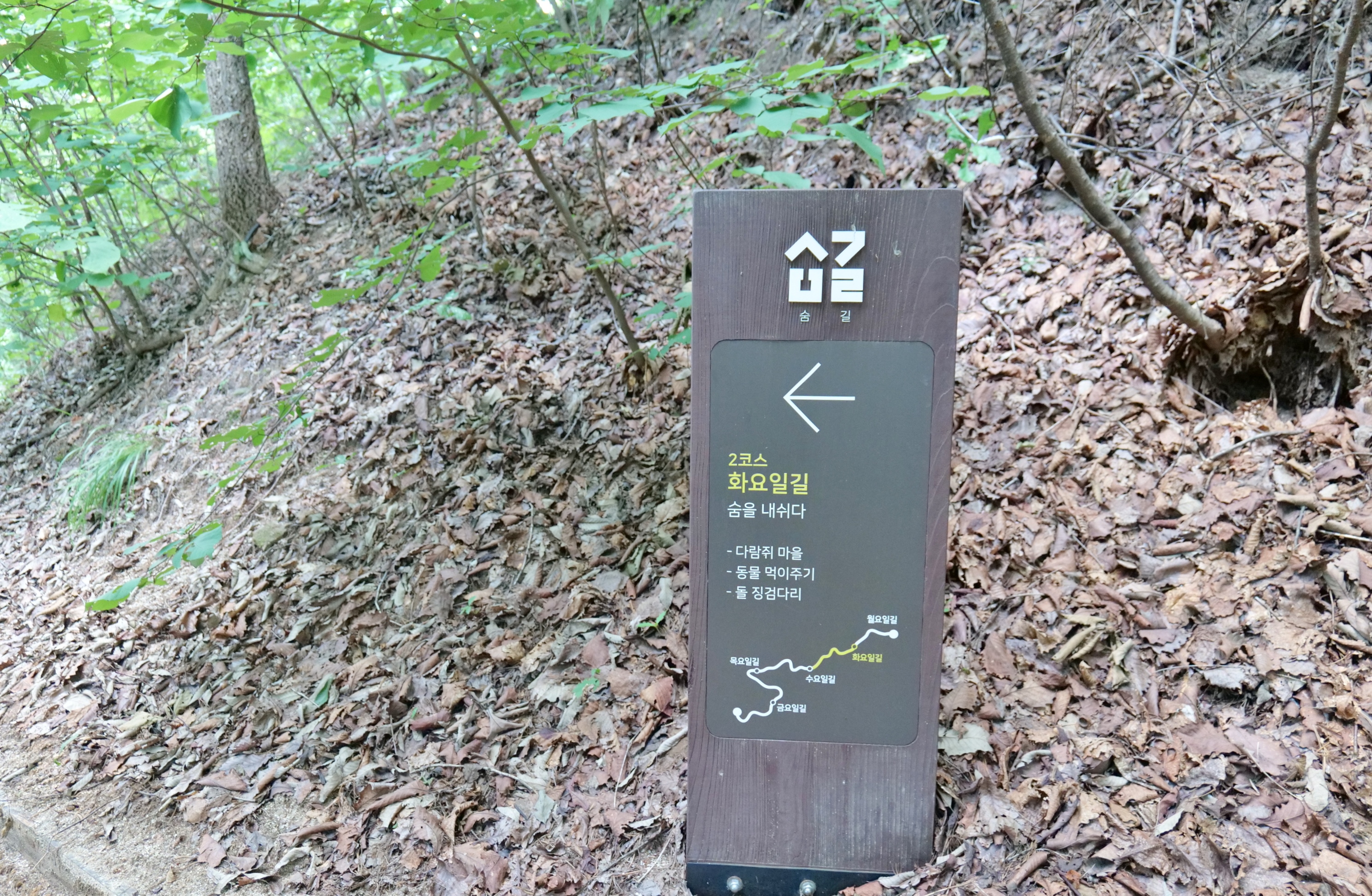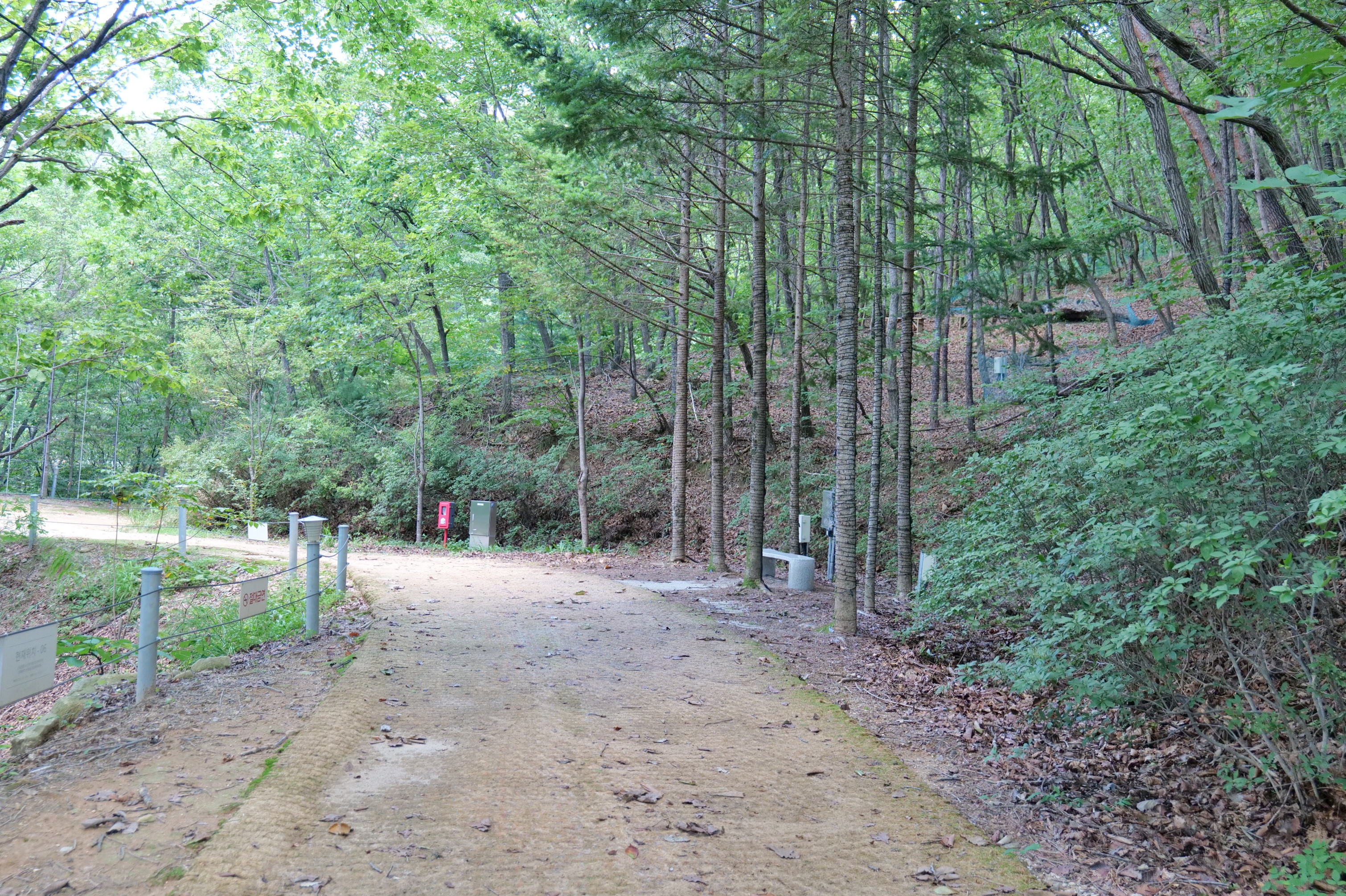 계단을 오르면 임도를 만나게 되고, 숲길(산책로) 1km,(15분 소요)안내 표지판이 있다.
