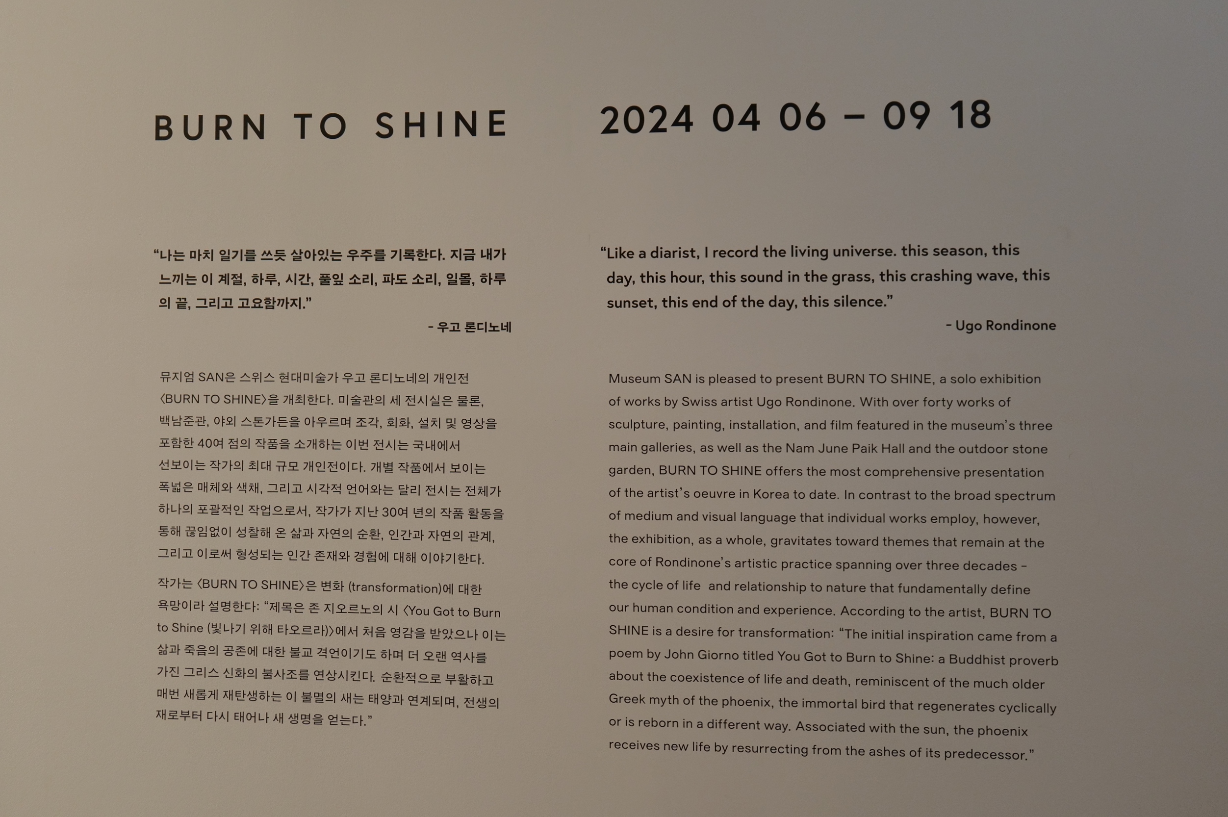 2016년 두 번 뮤지엄 산을 방문한 적이 있으며, 첫번째의 기억이 좋아 두번째는 제임스 터렐의 작품 5점을 감상하였다. 오늘은 가족과 함께 기억에 남는 곳을 다시 찾은 셈으로 미술관에서는 우고 론디노네 Ugo Rondinone의 특별전이 2024. 4. 6~ 9. 18일 까지 열리고 있다.