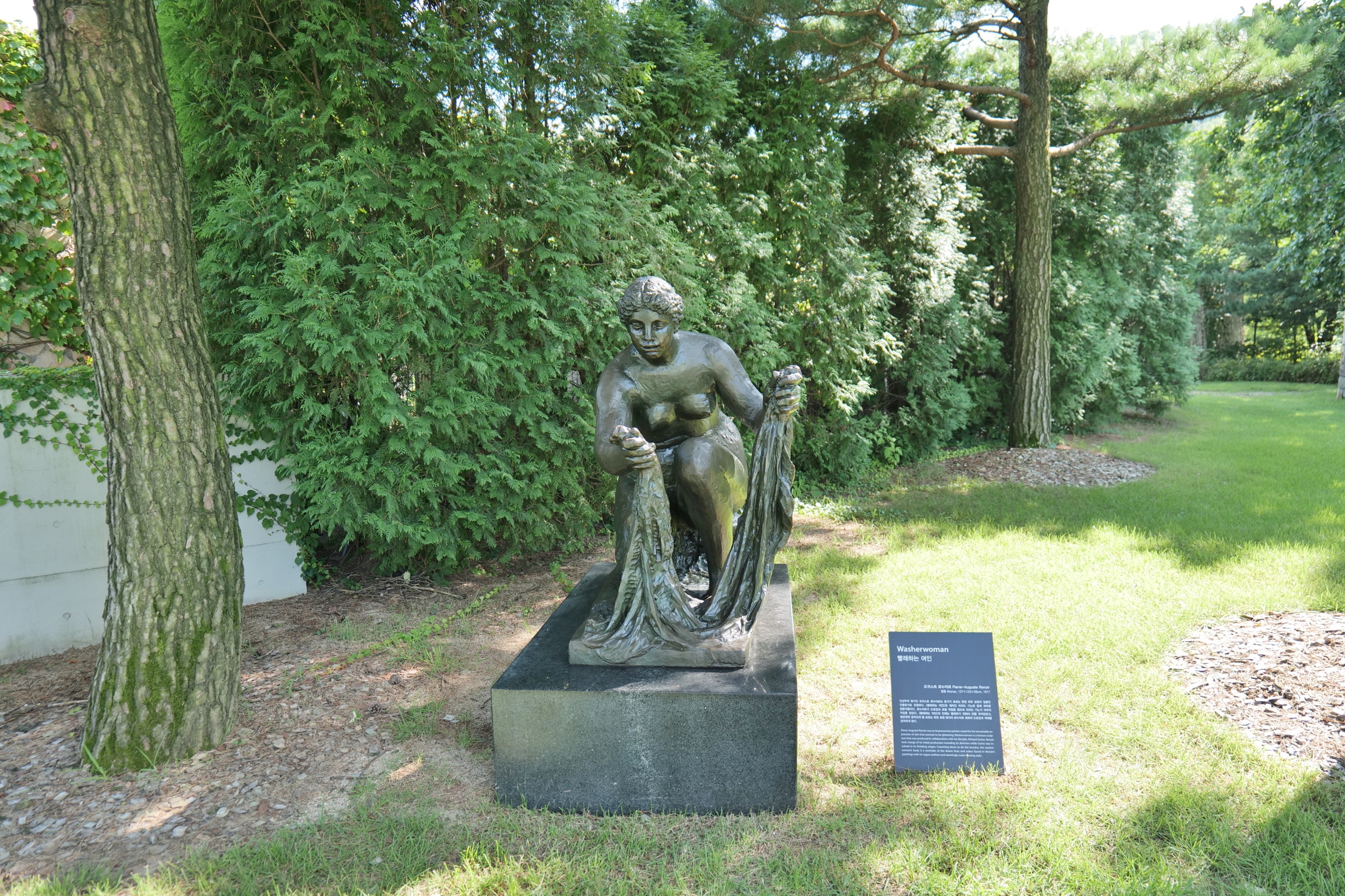 인상주의 화가인 오귀스트 르누아르는 윤기가 흐르는 듯한 피부 표현이 일품인 인물화가로 유명하다. <빨래하는 여인>은 제자인 리처드 기노와 함께 제작한 청동작품이다. 르누아르가 드로잉과 초벌 작업을 했으며 리차드 기노가 마무리 작업을 맡았다. <빨래하는 여인>의 인체는 빨래하기 위해서 반쯤 주저앉았고, 불분명한 윤곽선과 물 흐르는 듯한 표현 방식이 르누아르 회화의 드로잉과 색채를 짐작하게 한다.