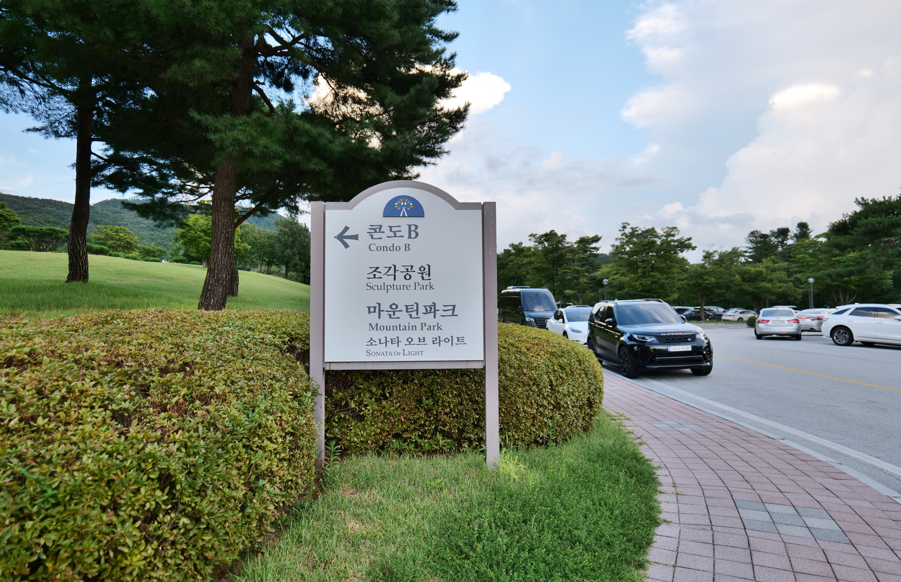 내비에 소나타오브라이트로 검색하여 오크밸리 리조트로 진입한다. 방문자센터 인근에 소형 로터리가 있고 주변에 주차장이 있다. 조각공원의 맨 하단 인근이므로 직감적으로 위치를 가늠할 수 있다.