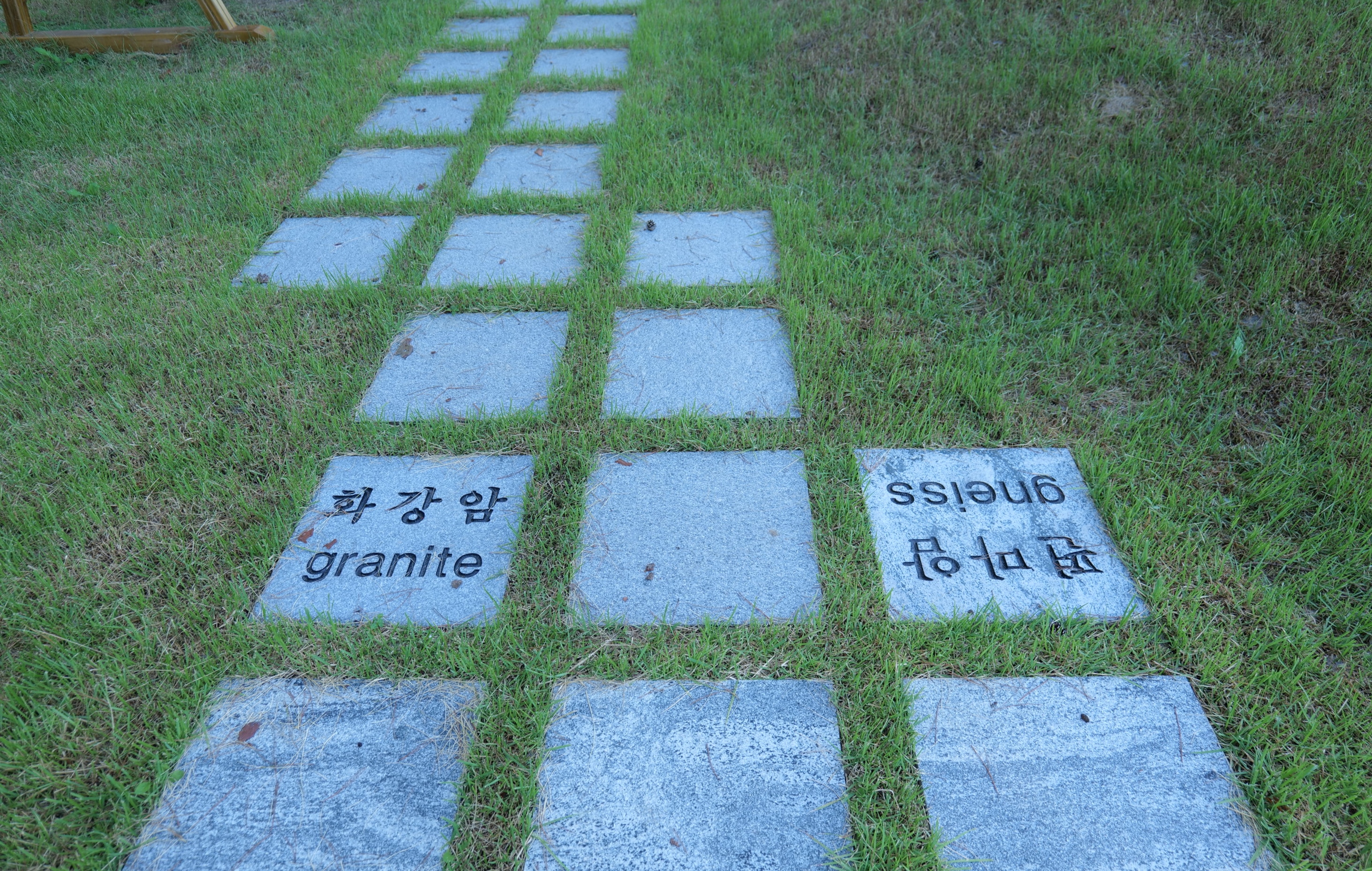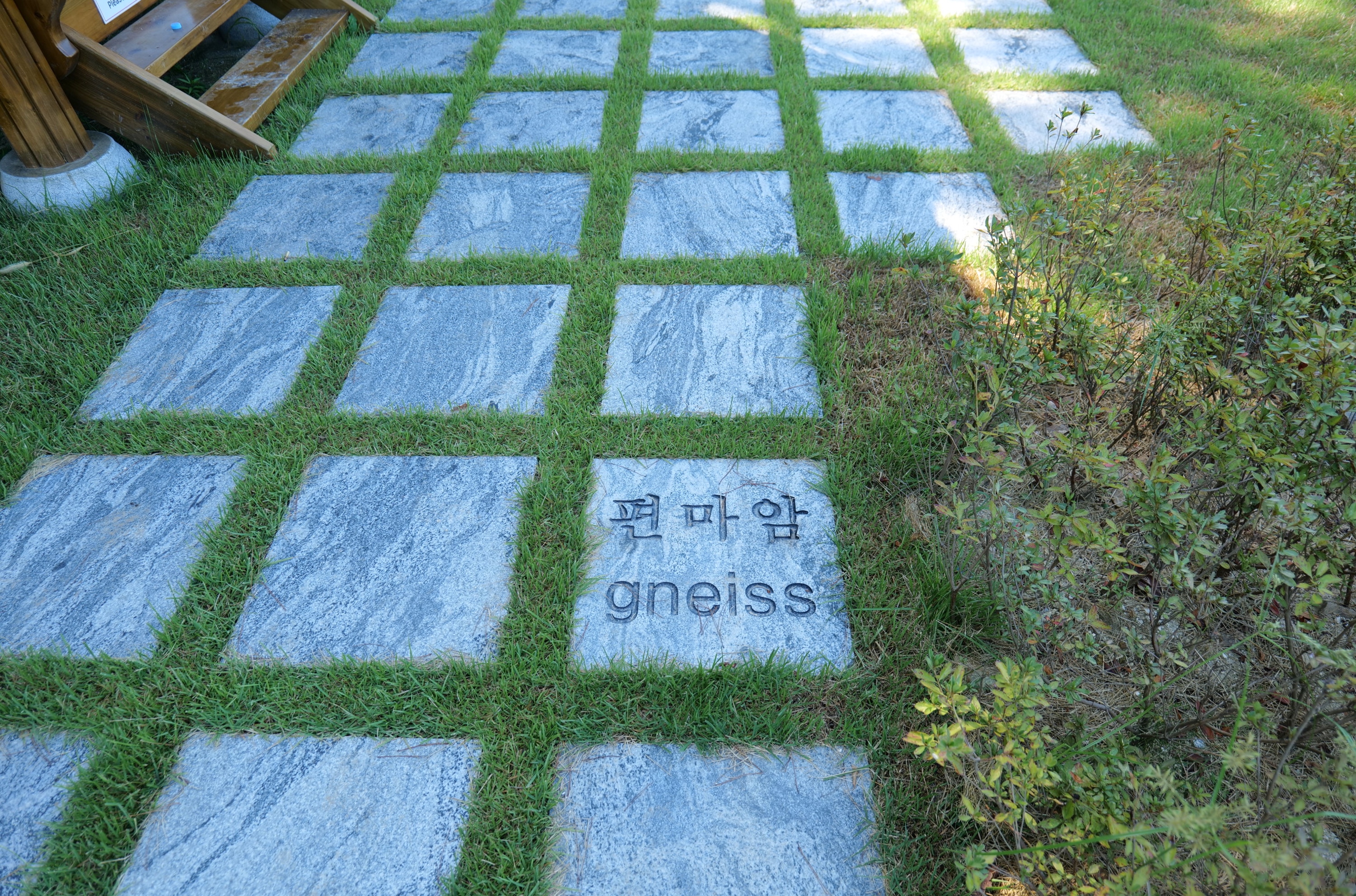 군데군데 종류가 다른 석질의 바위를 전시하고 이름을 붙였다.