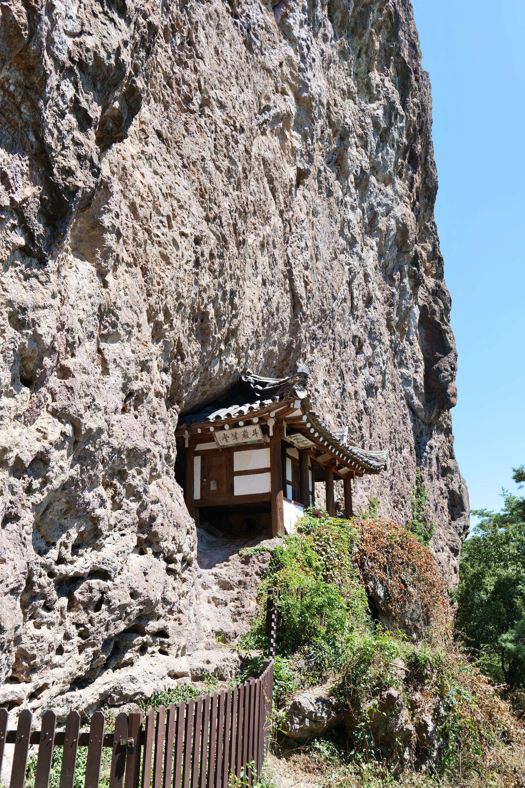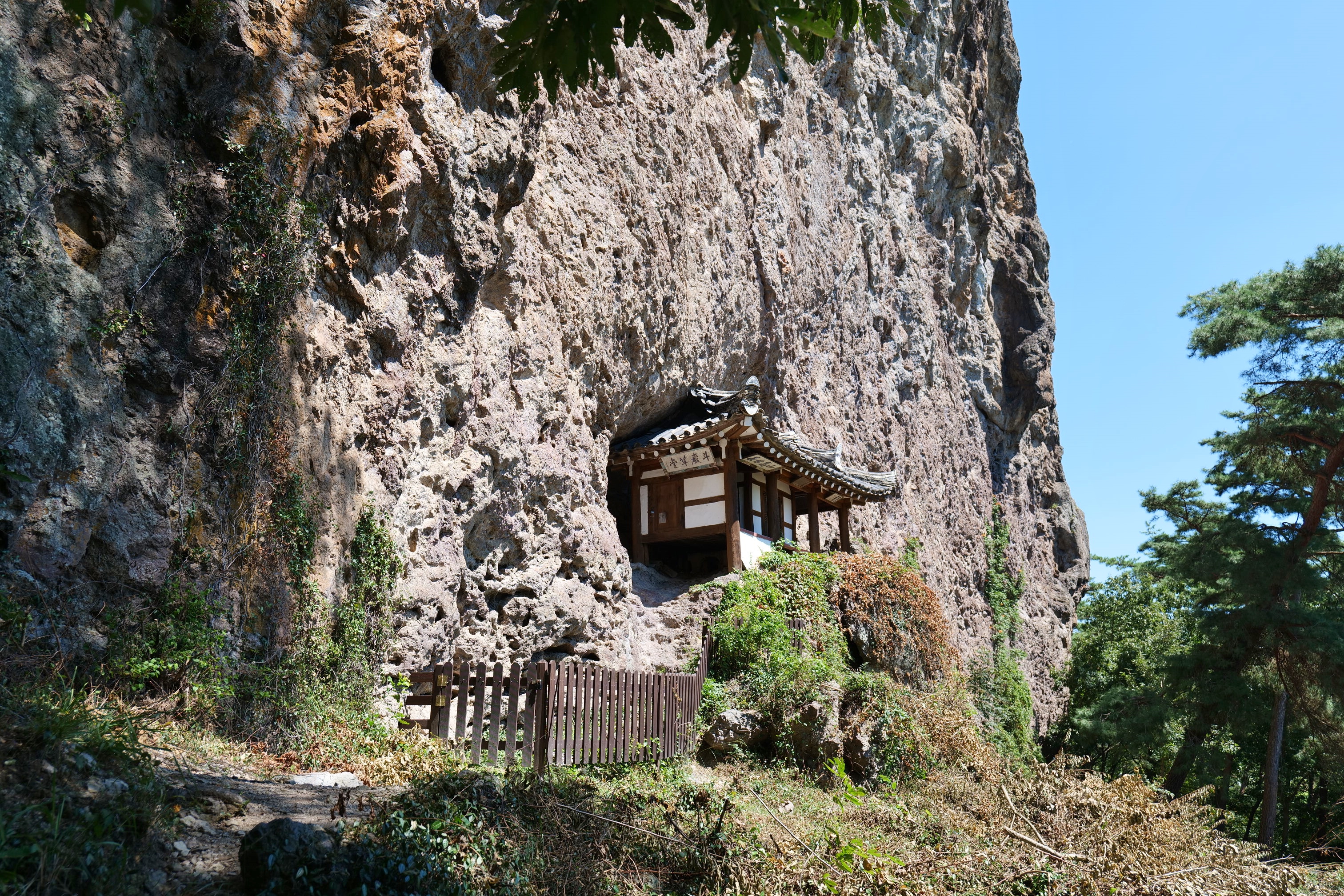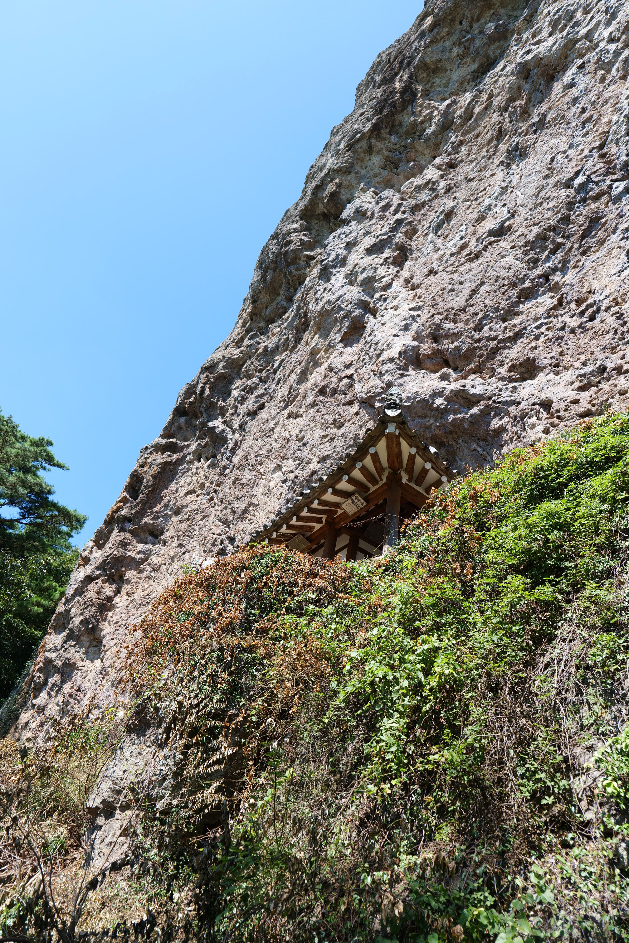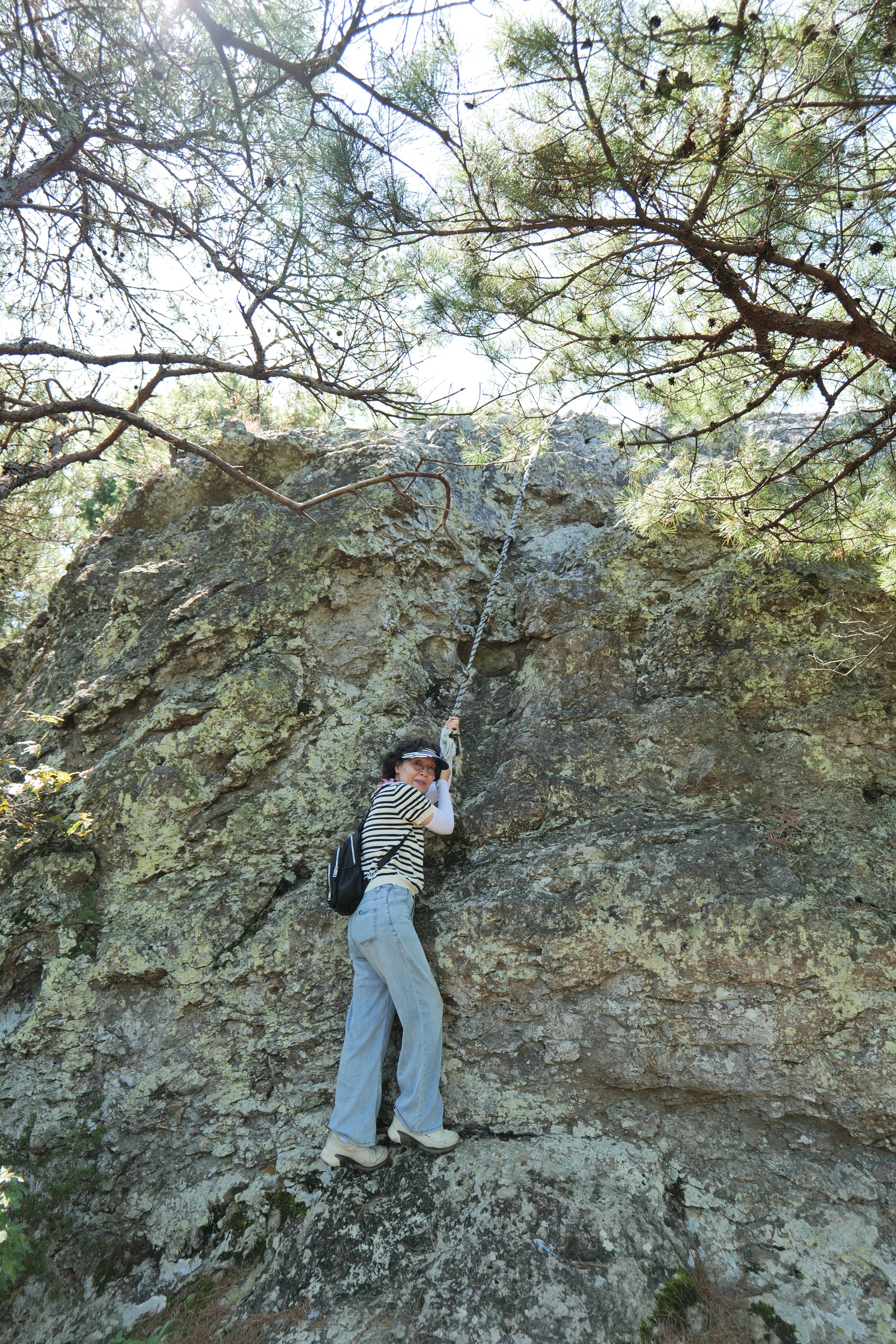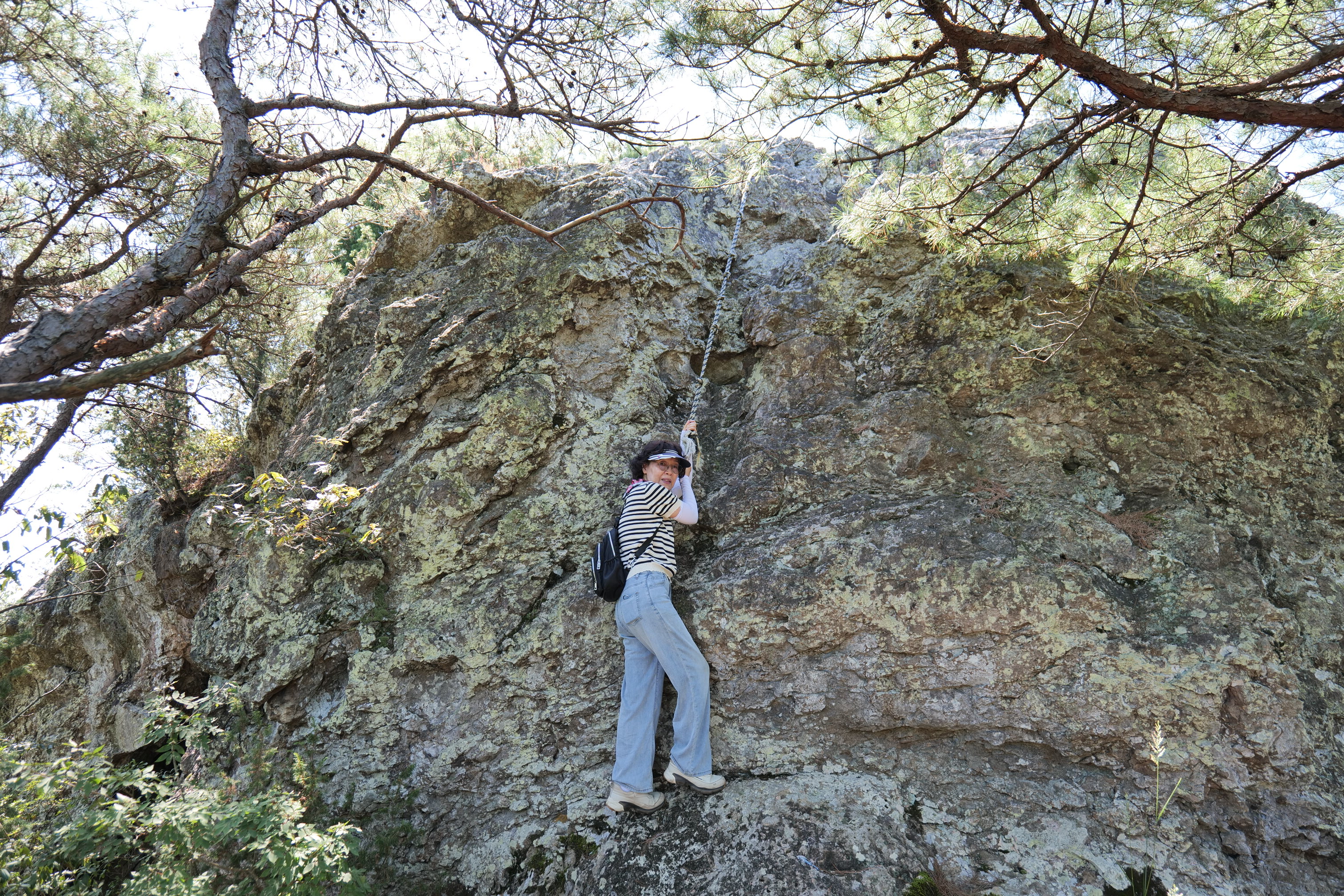 전좌바위로 오르는 수직 절벽엔 밧줄이 매여있으며, 조금 위험하지만 조심스레 오를 수 있다.