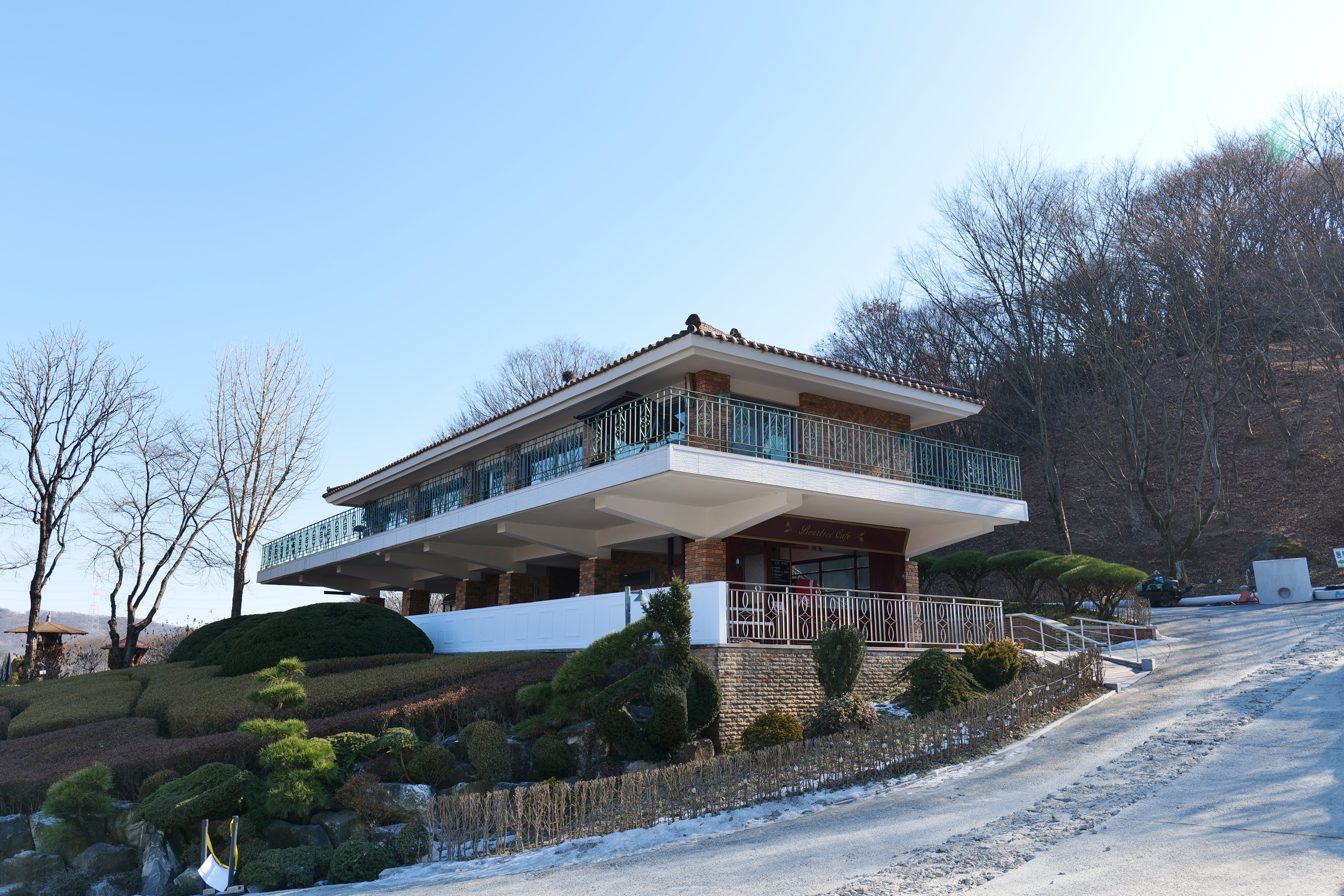 앞쪽으로 연못이 있고, 보이는 1층은 실제로 2층인 셈이다.