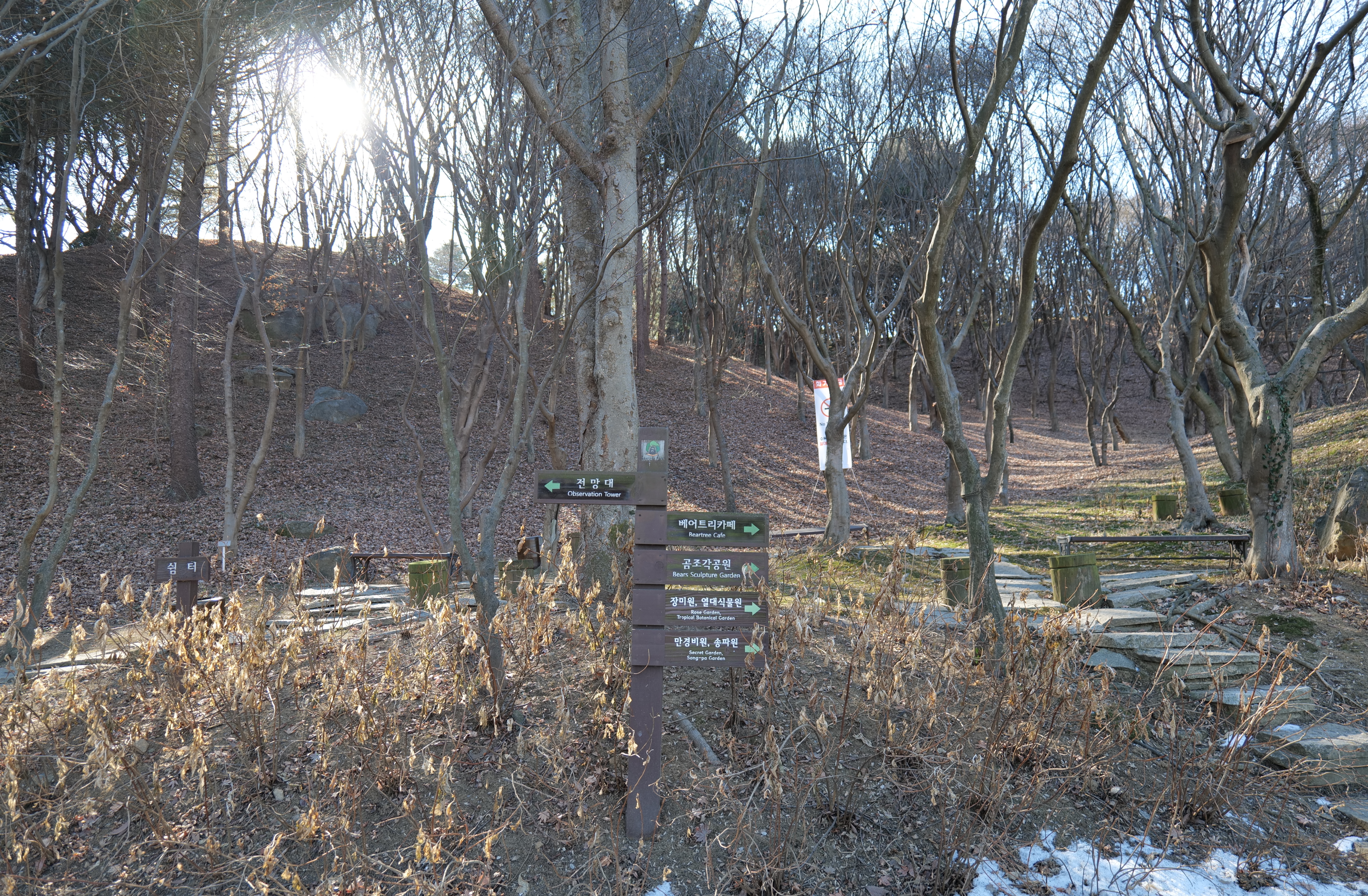 숲놀이터 입구를 지나 임도를 따르면 이내 지능선에 도착하며 이곳에서 전망대로 바로 오르는 길이 있으나, 제법 경사가 있어 겨울철 미끄러져 다침을 사전에 막기 위해 출입을 금하고 있다.
