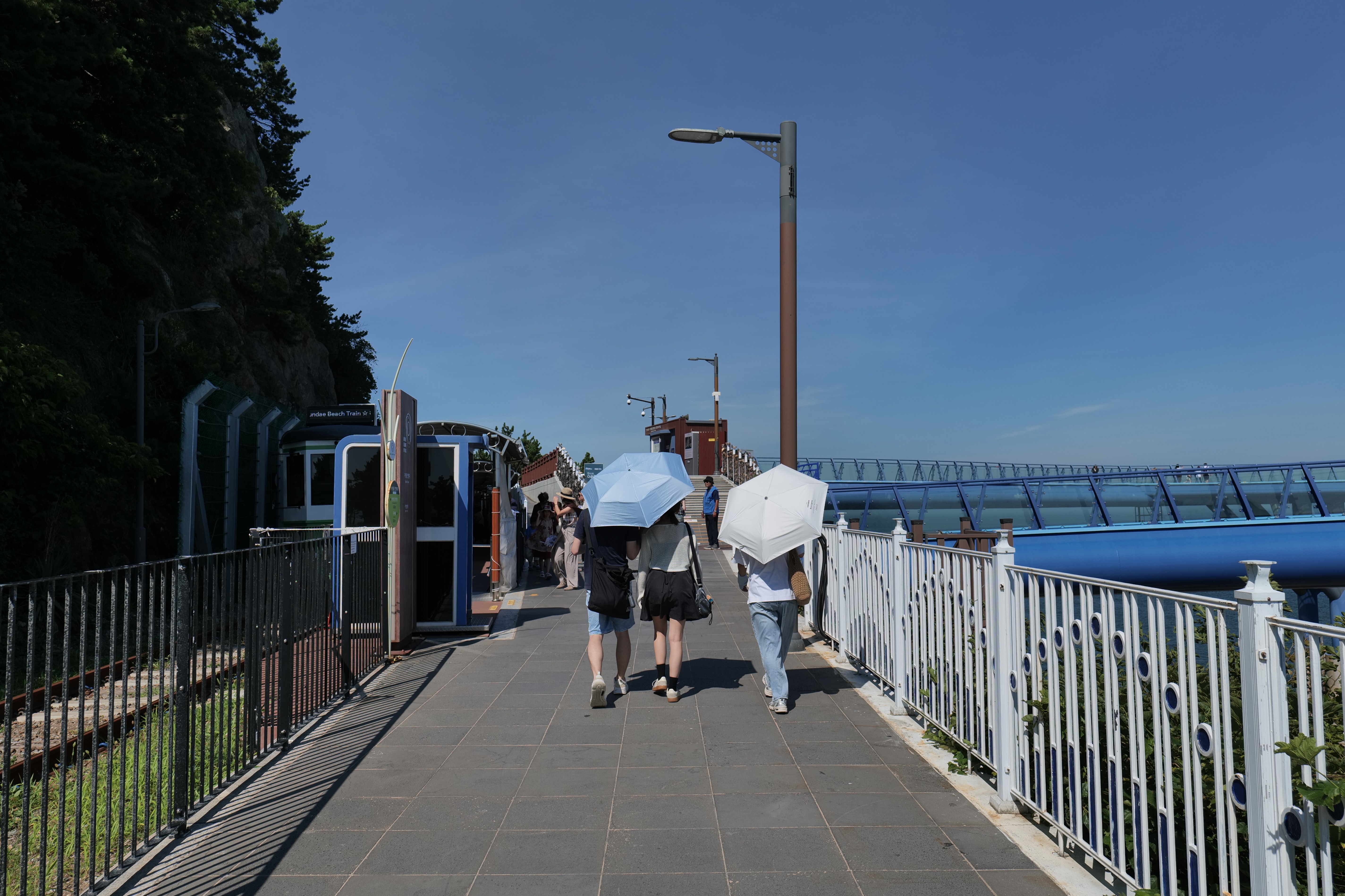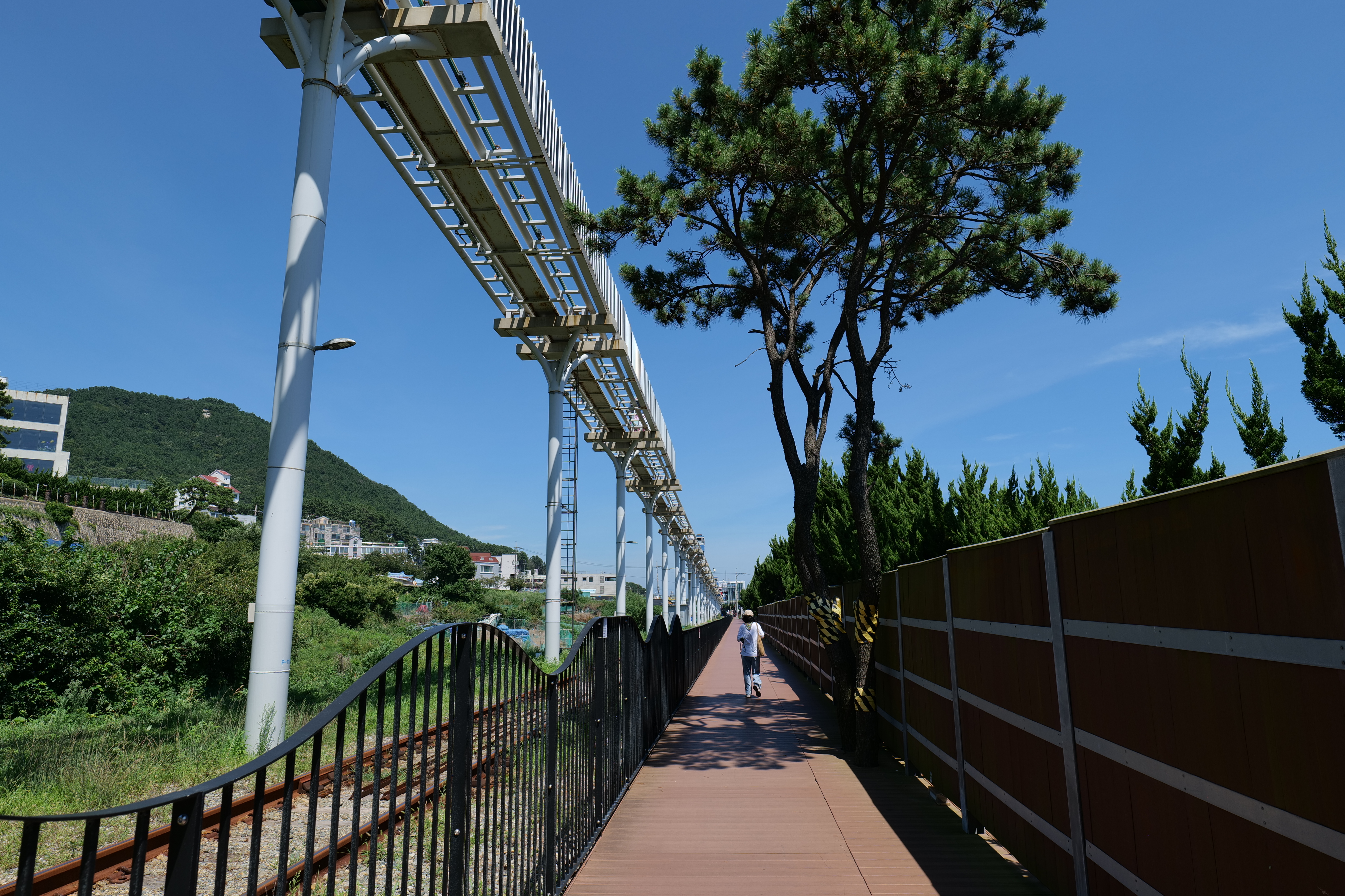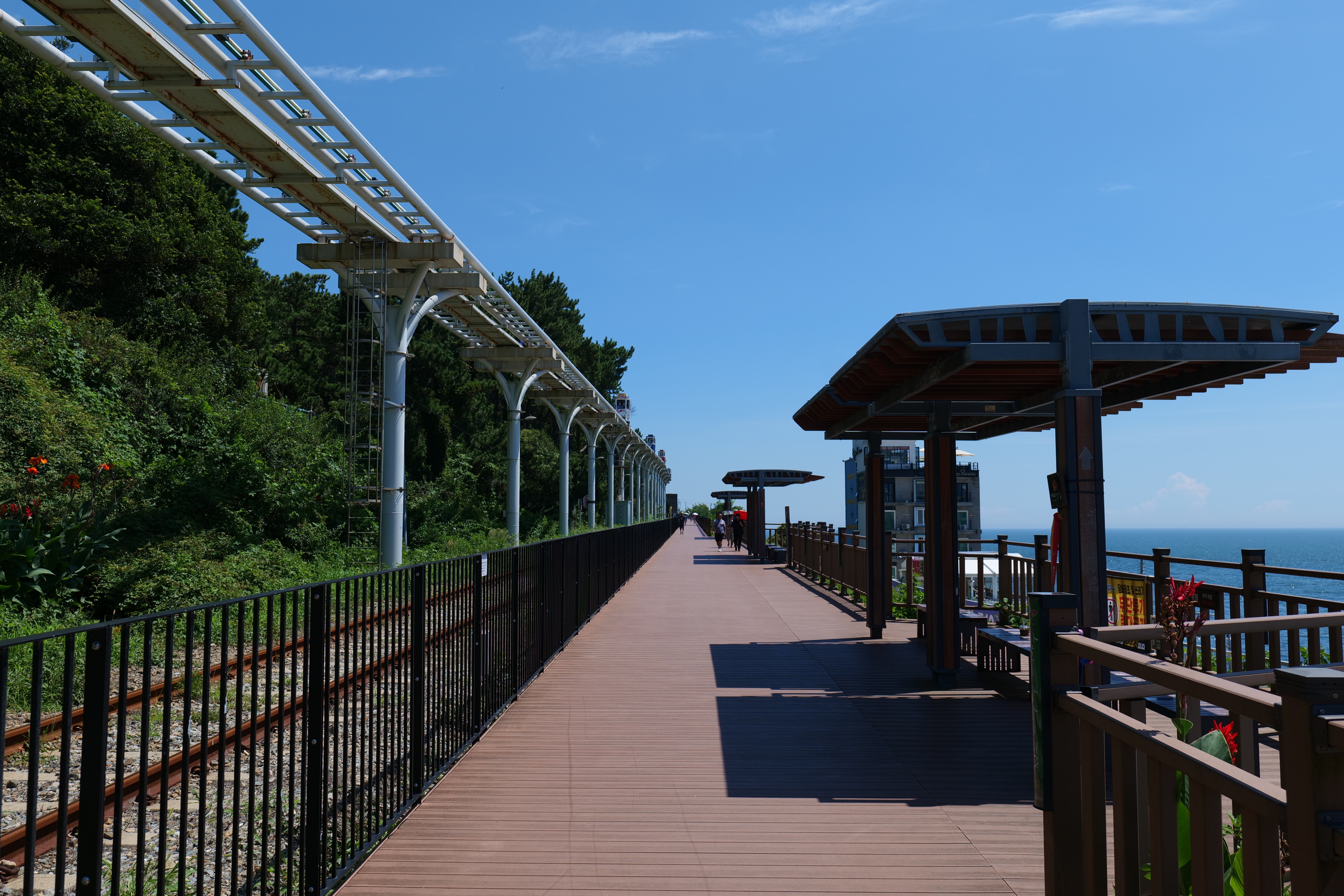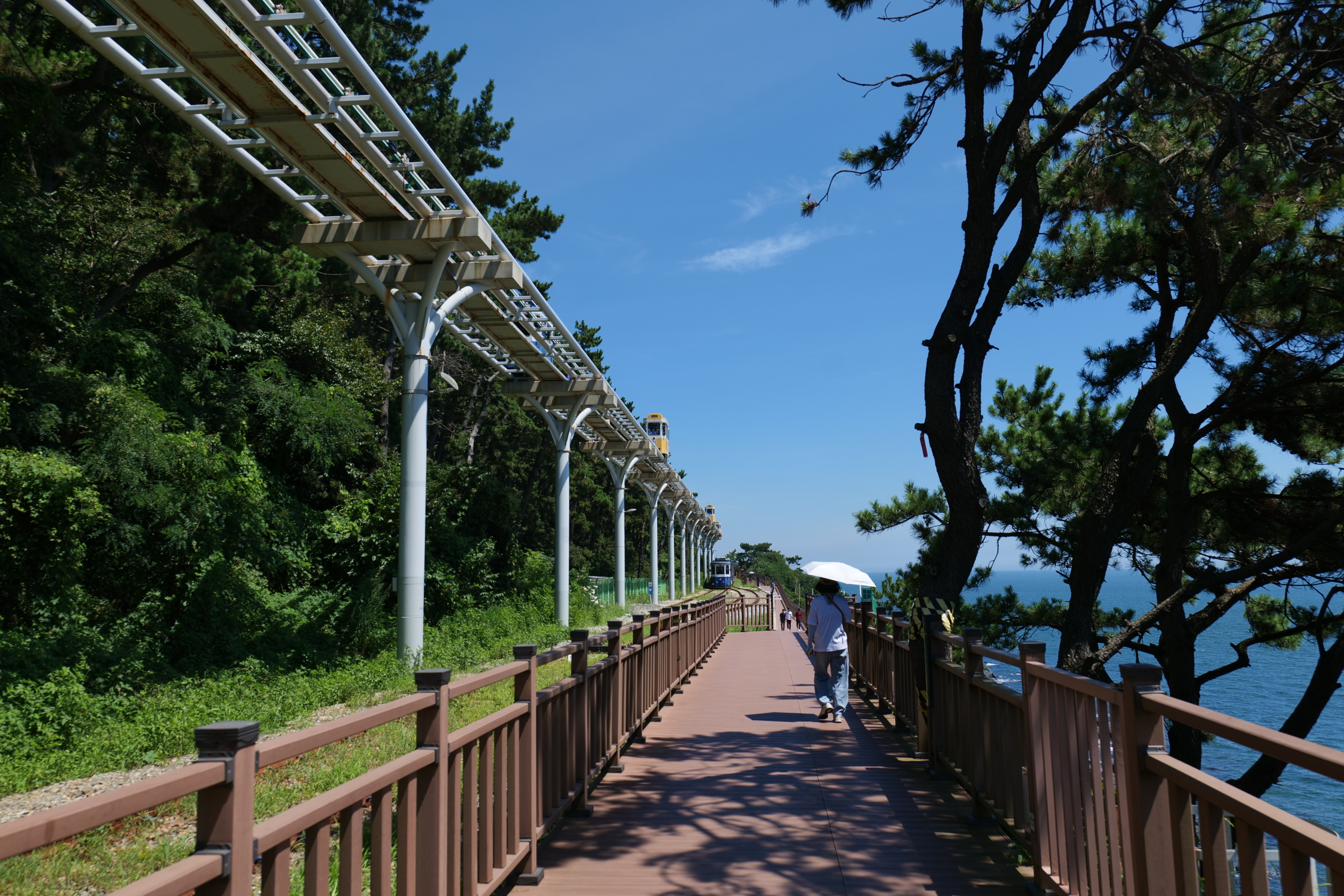 철길을 따라서는 해변열차가, 보이는 구조물로는 스카이 캡슐이 다니고 있고, 철길 옆으로 산책로가 조성되어 있습니다.