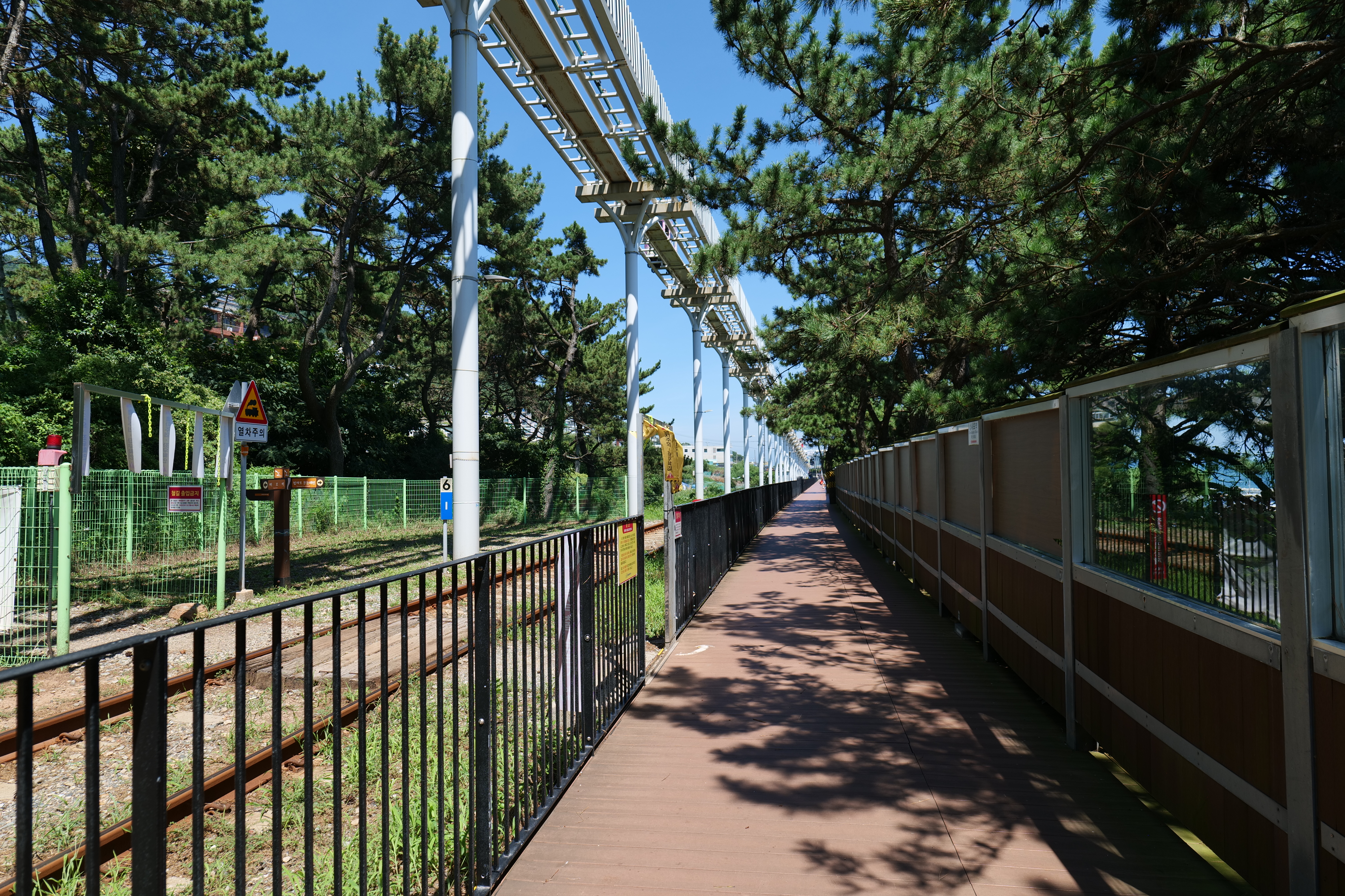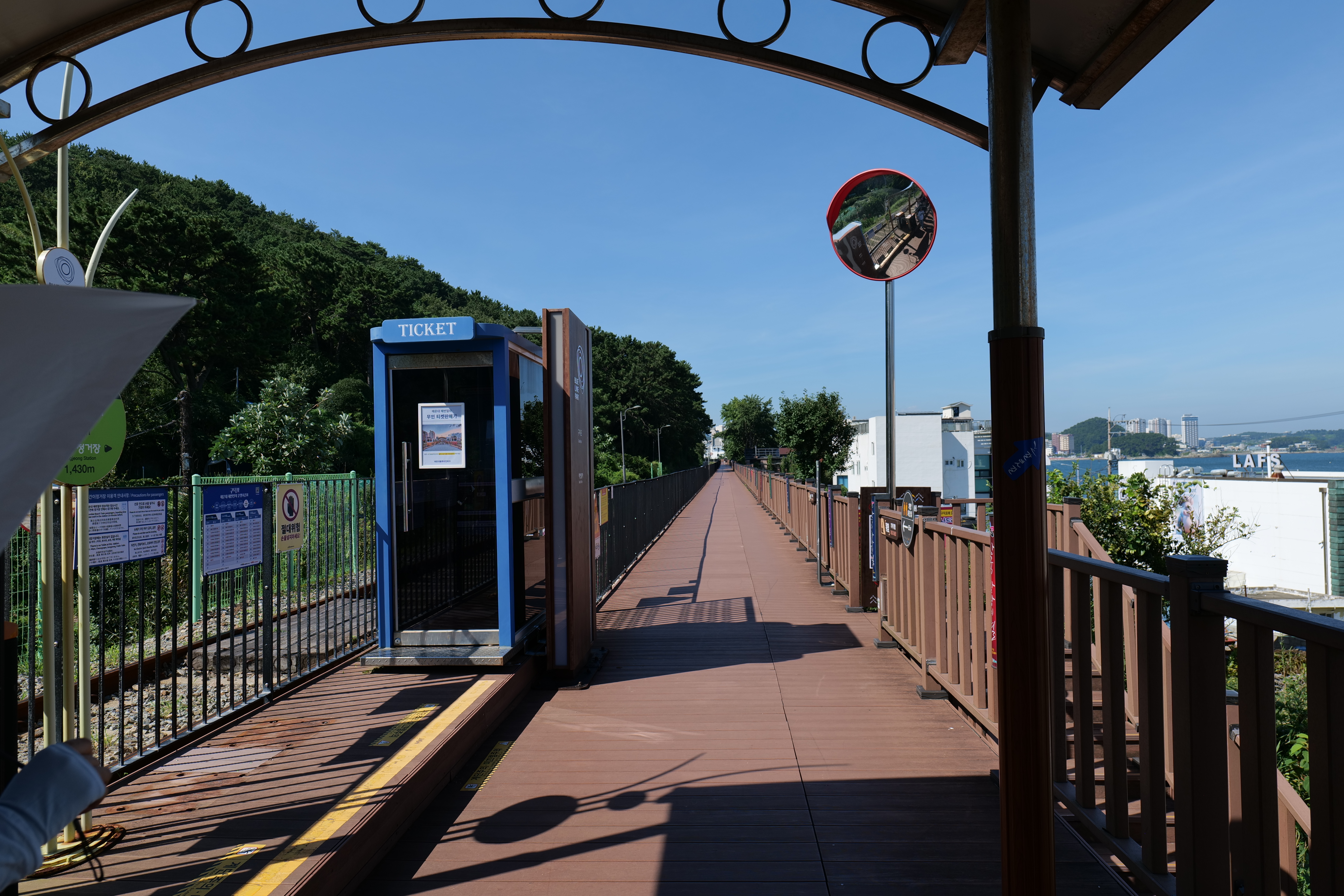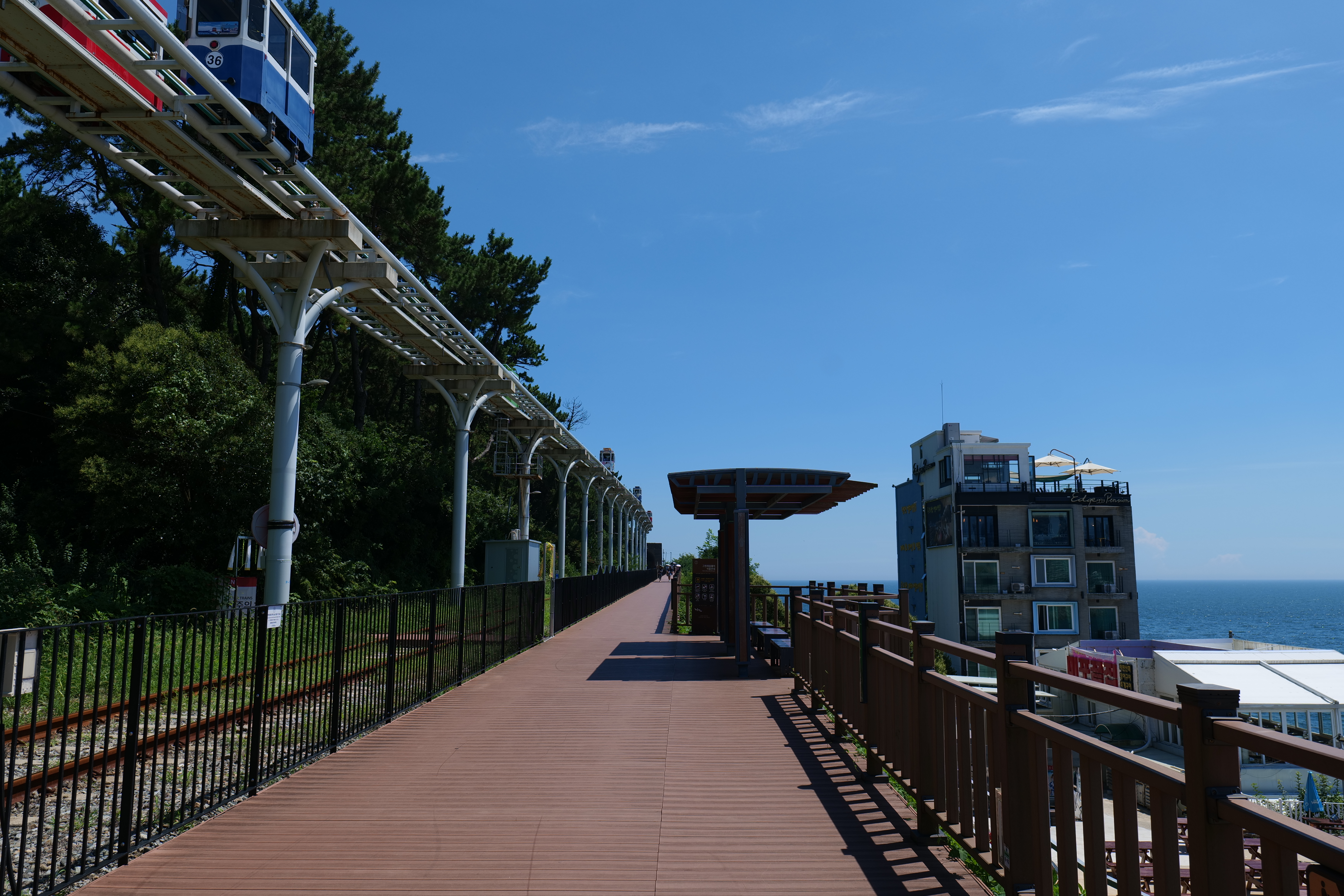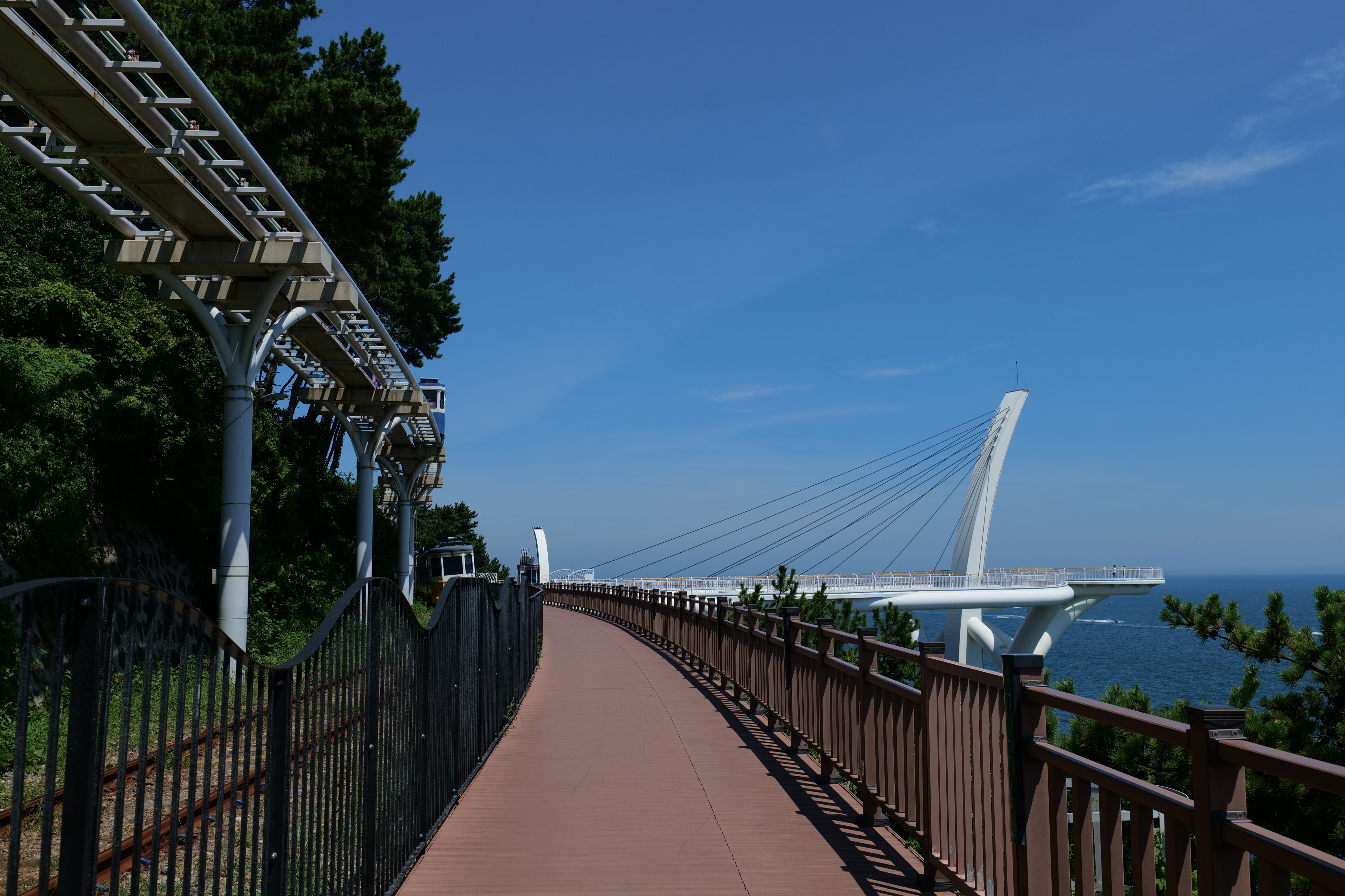철길을 따라서는 해변열차가, 보이는 구조물로는 스카이 캡슐이 다니고 있고, 철길 옆으로 산책로가 조성되어 있습니다.