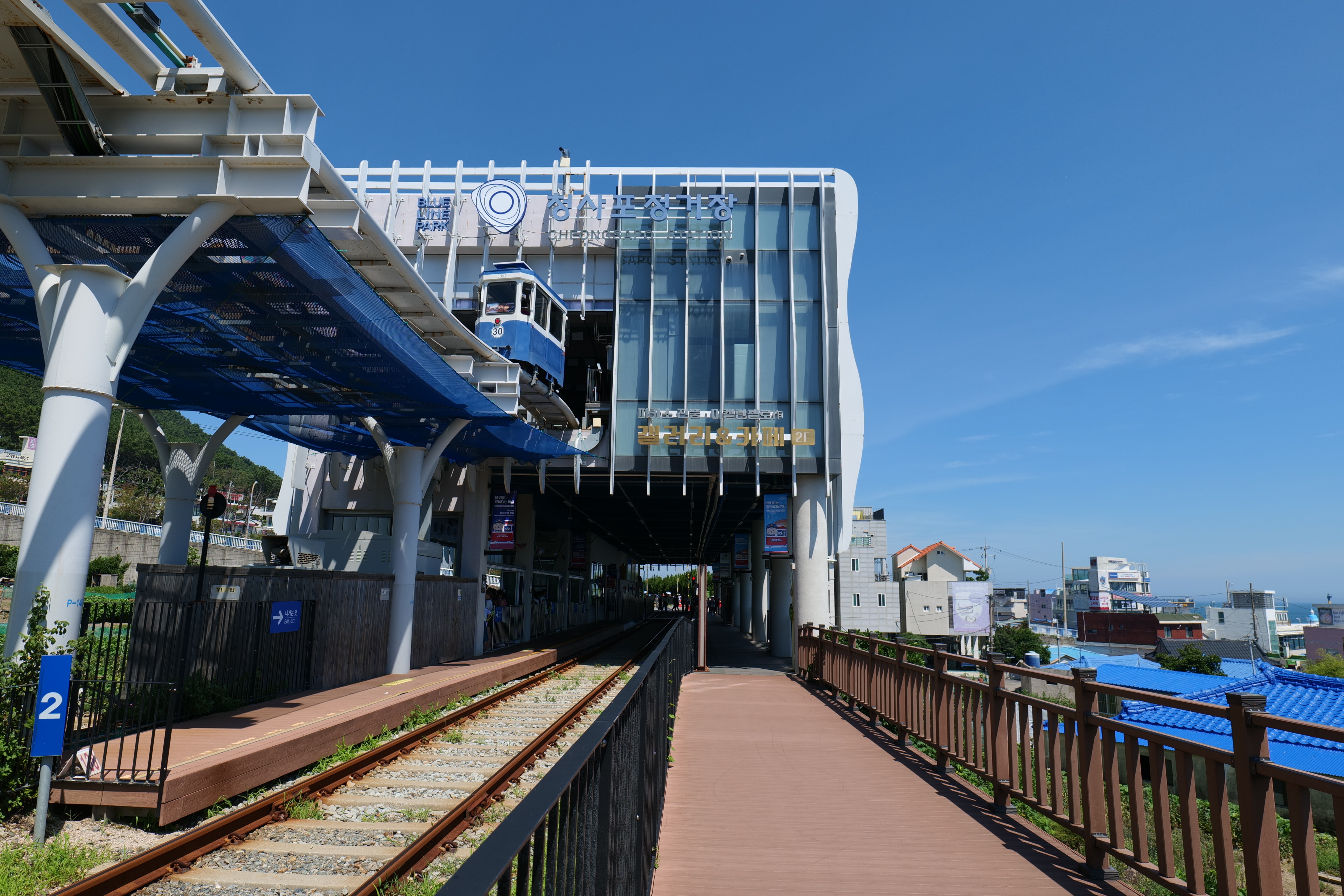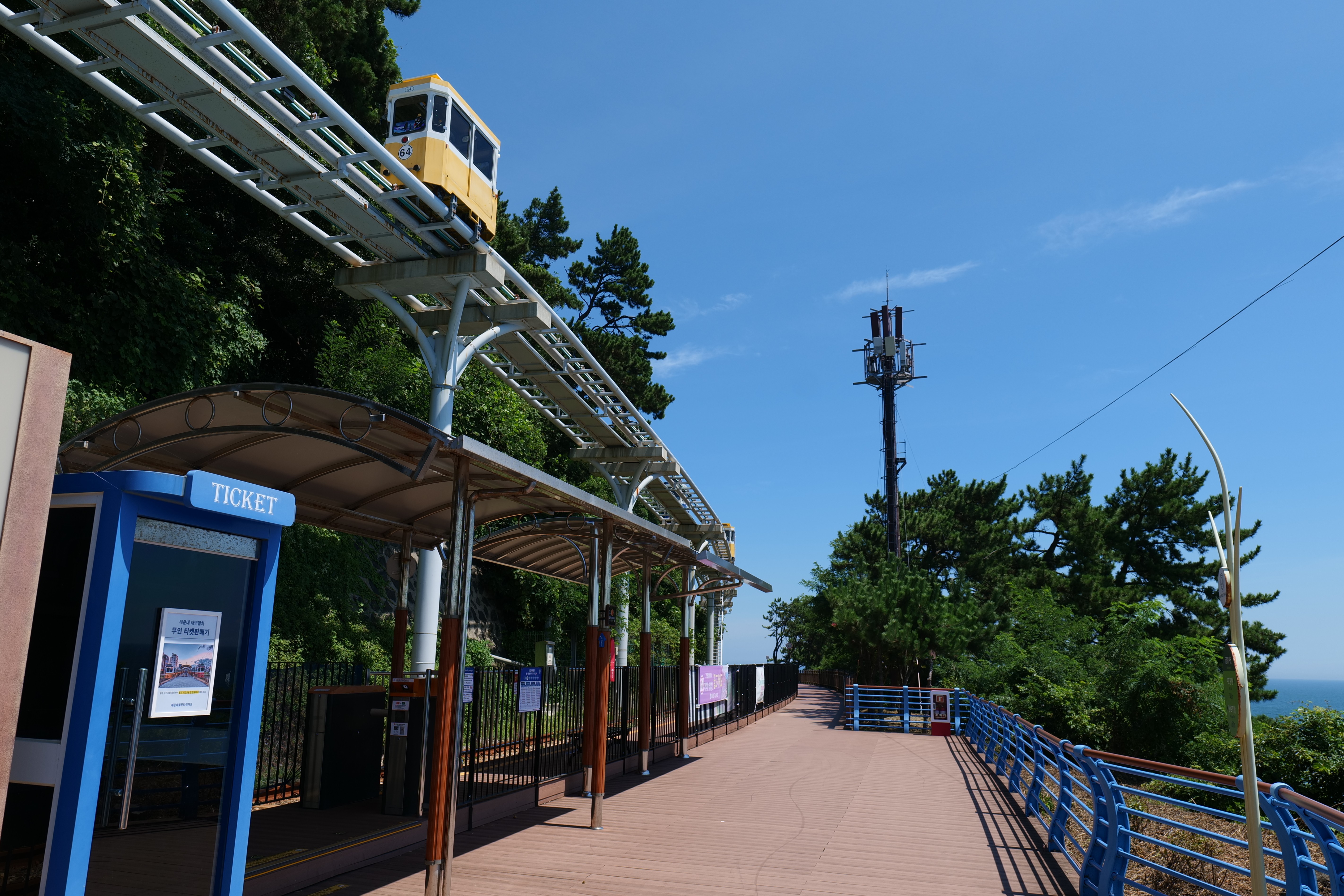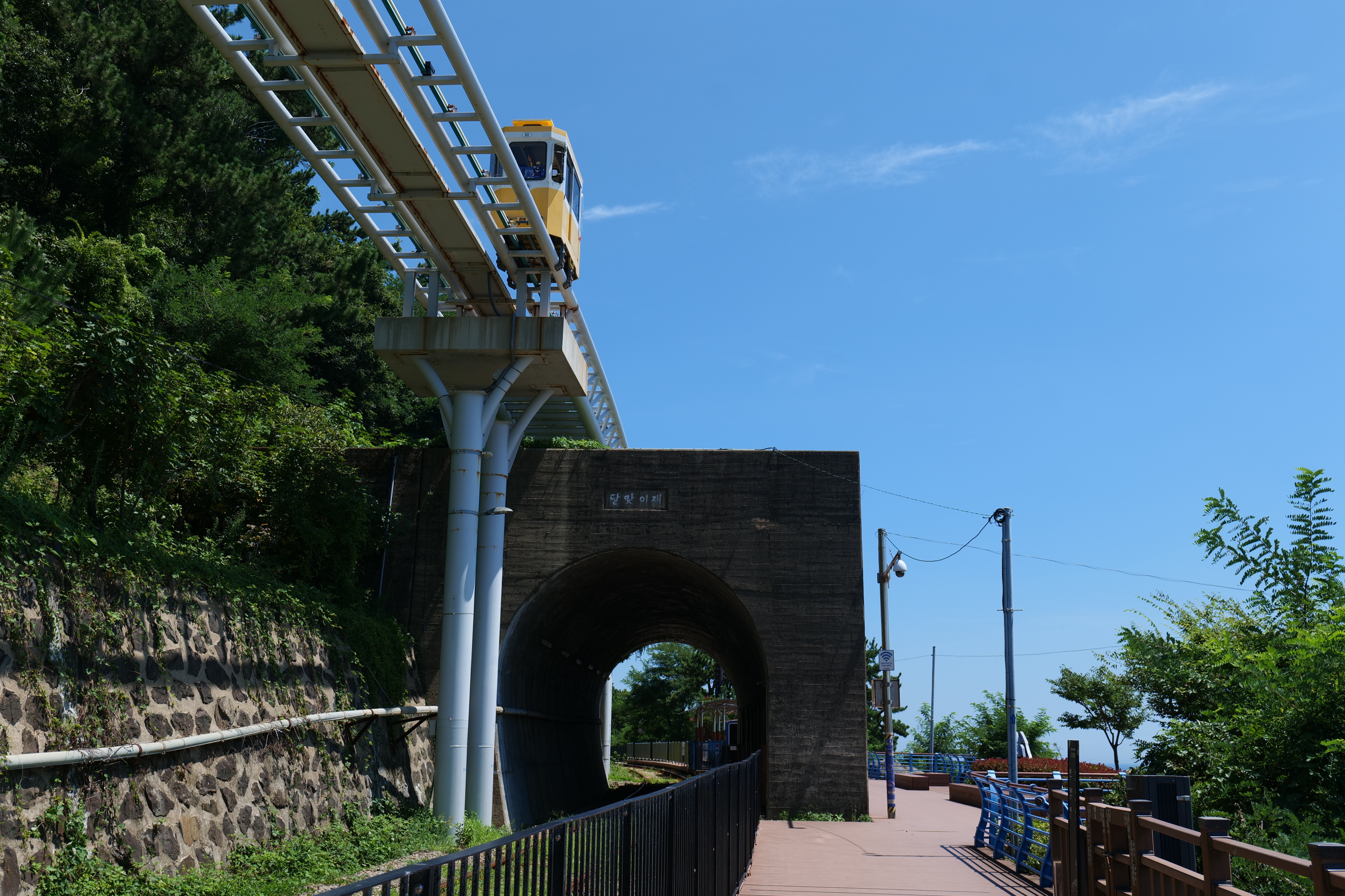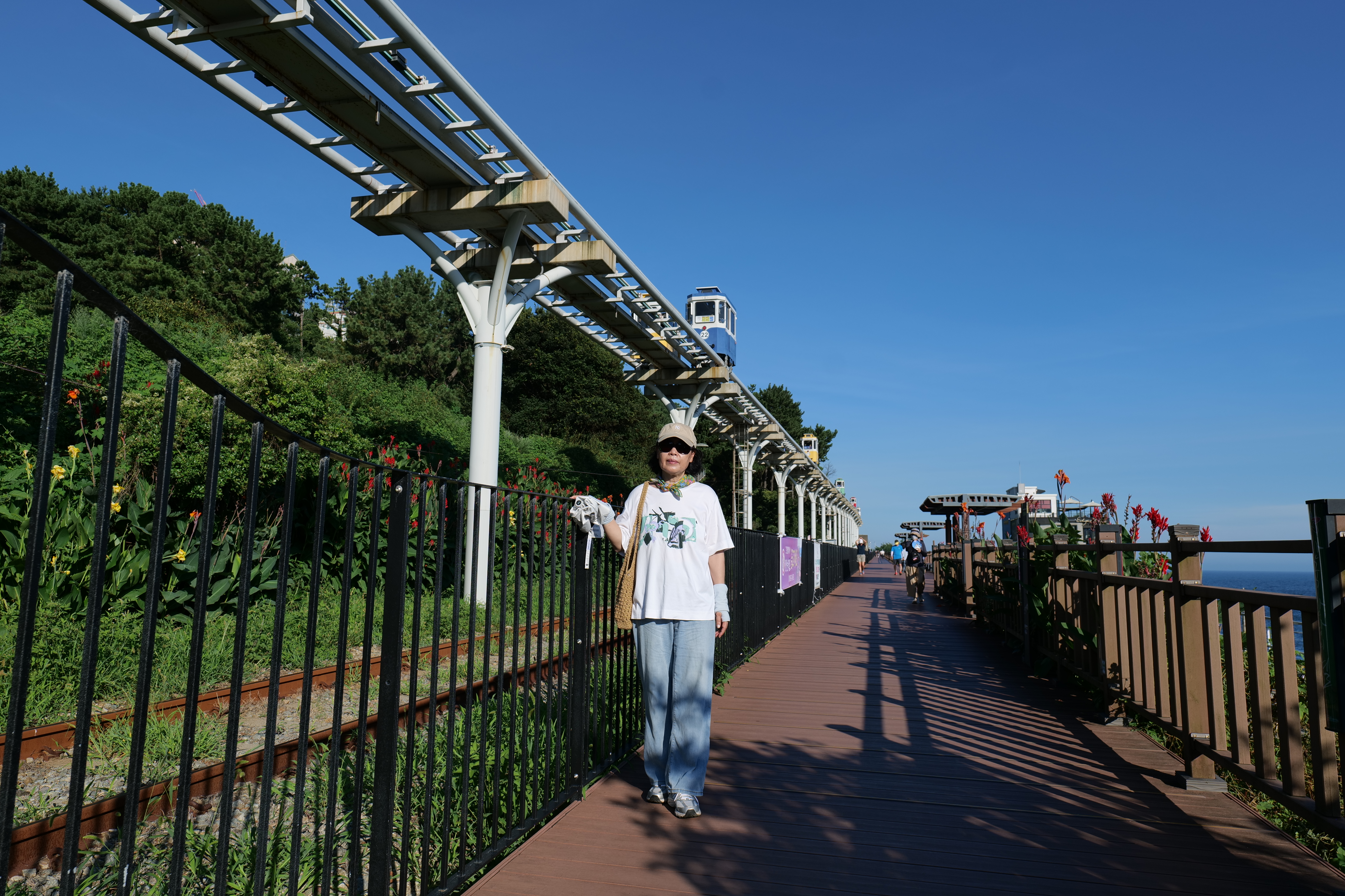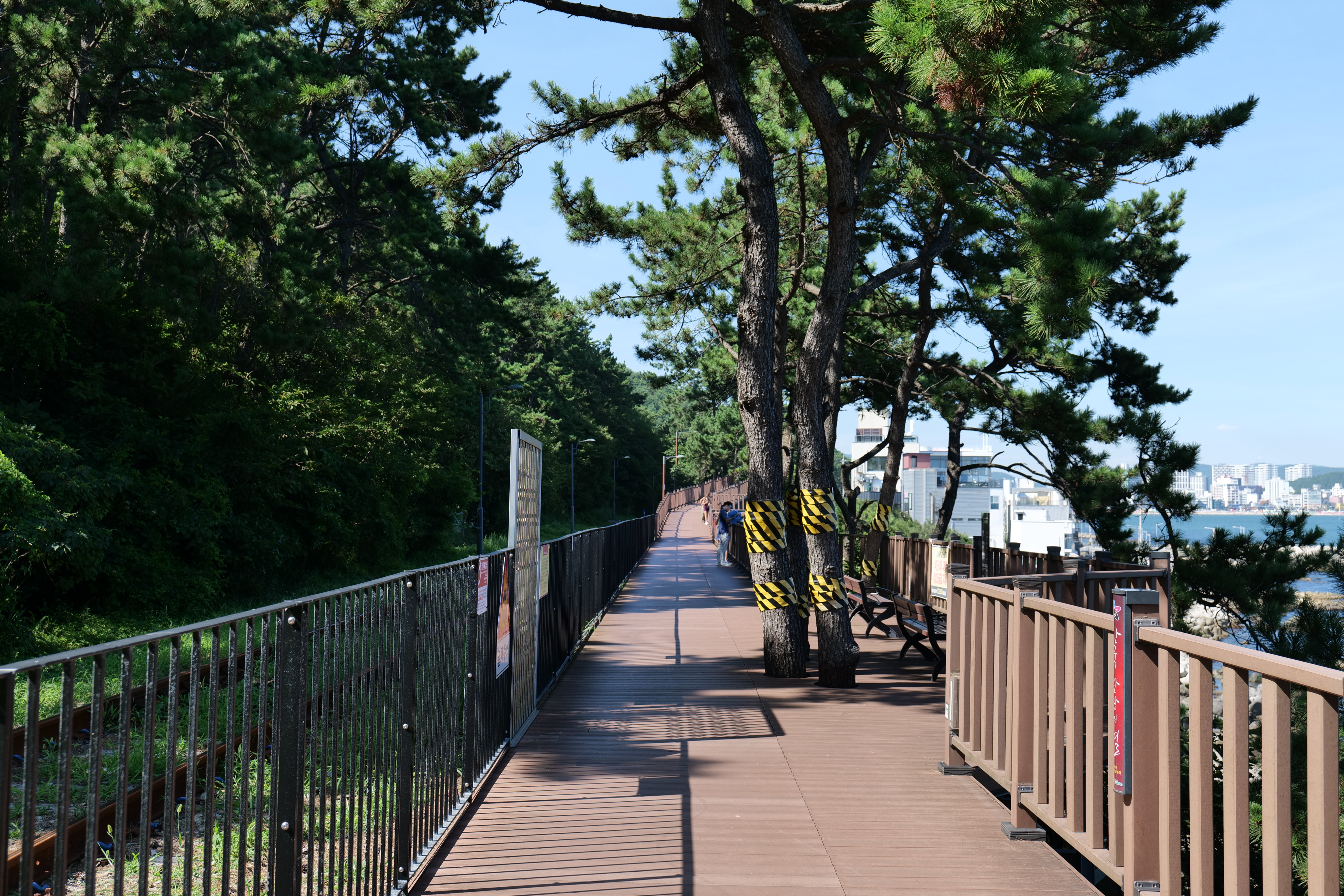 철길을 따라서는 해변열차가, 보이는 구조물로는 스카이 캡슐이 다니고 있고, 철길 옆으로 산책로가 조성되어 있습니다.