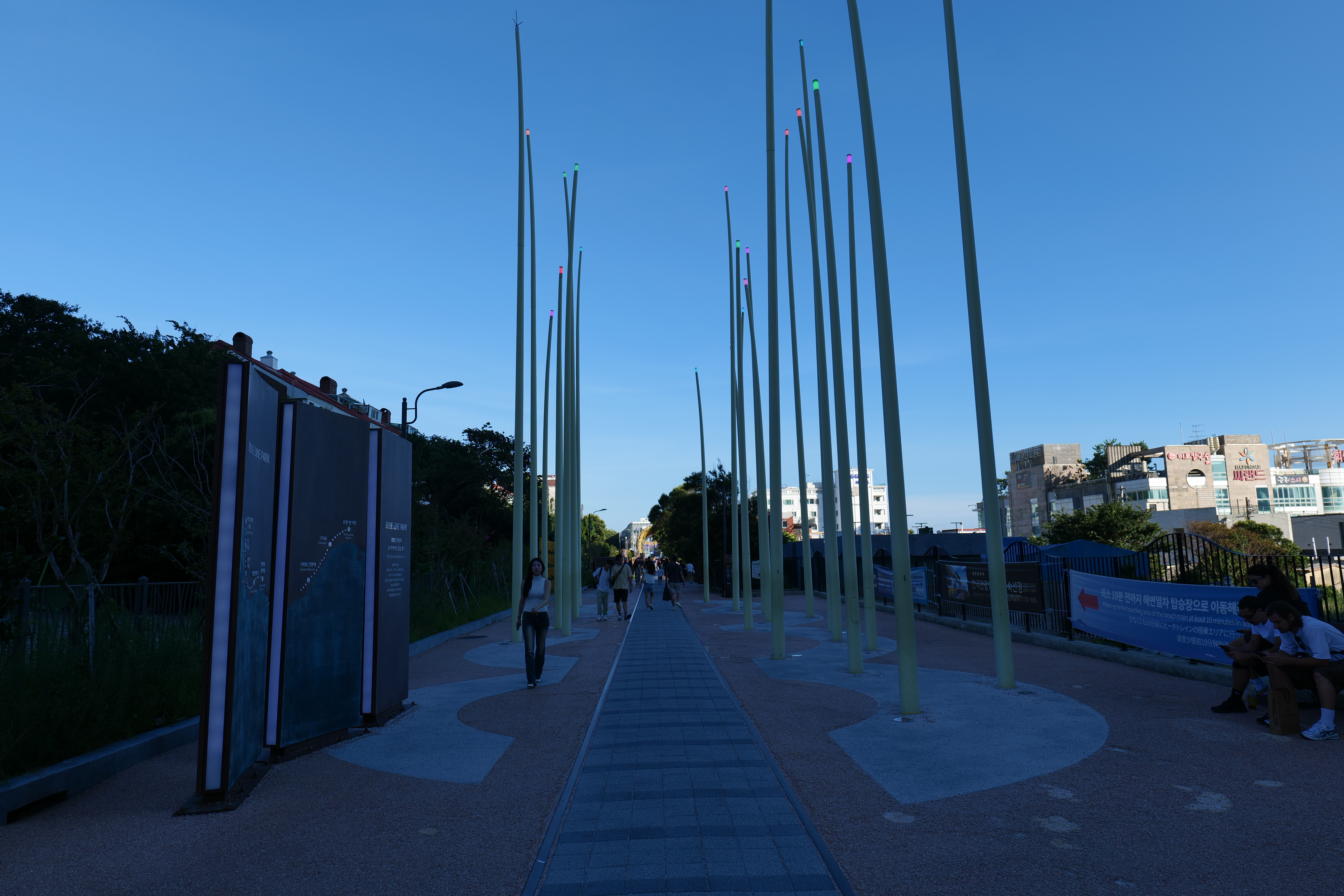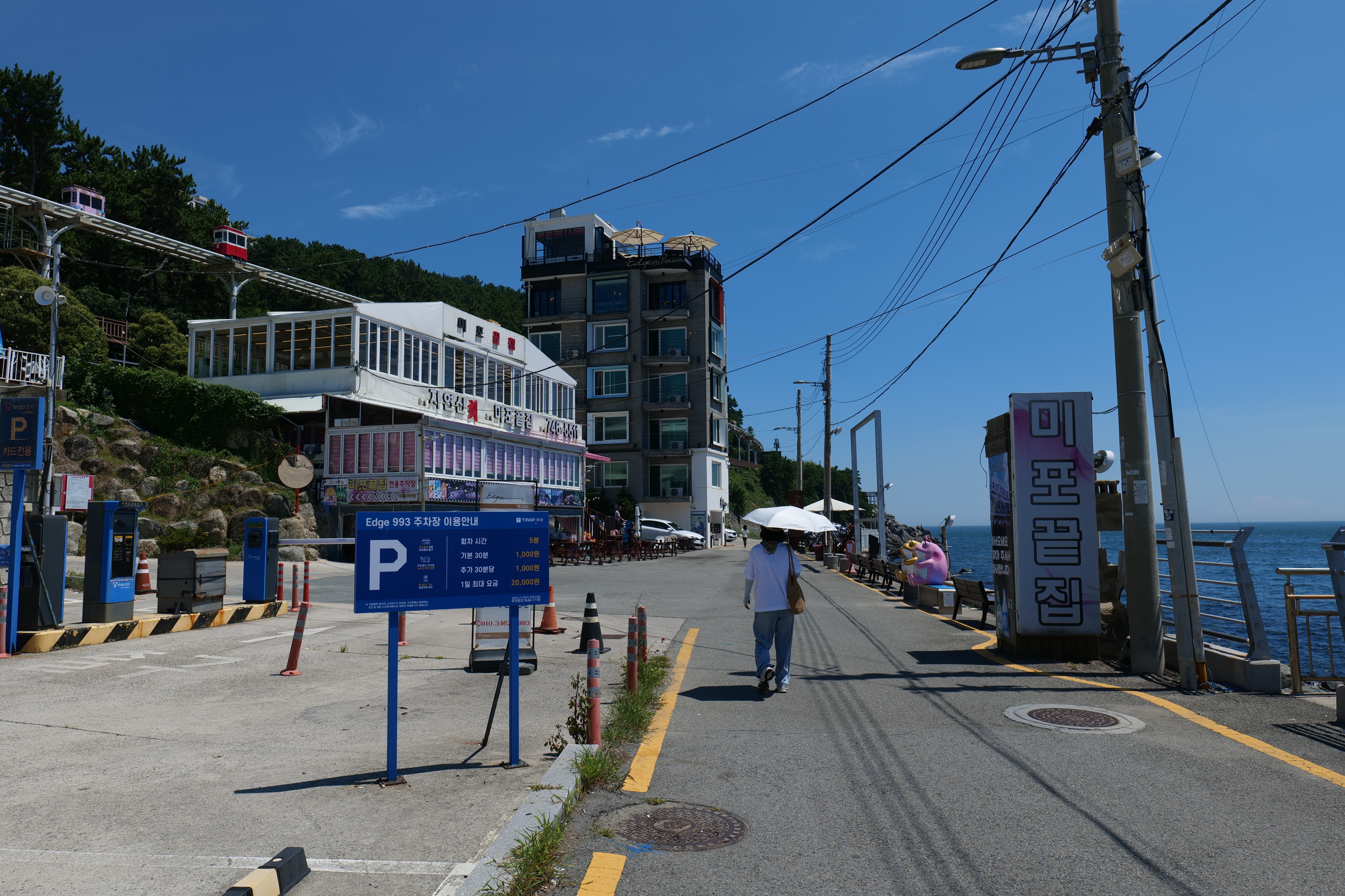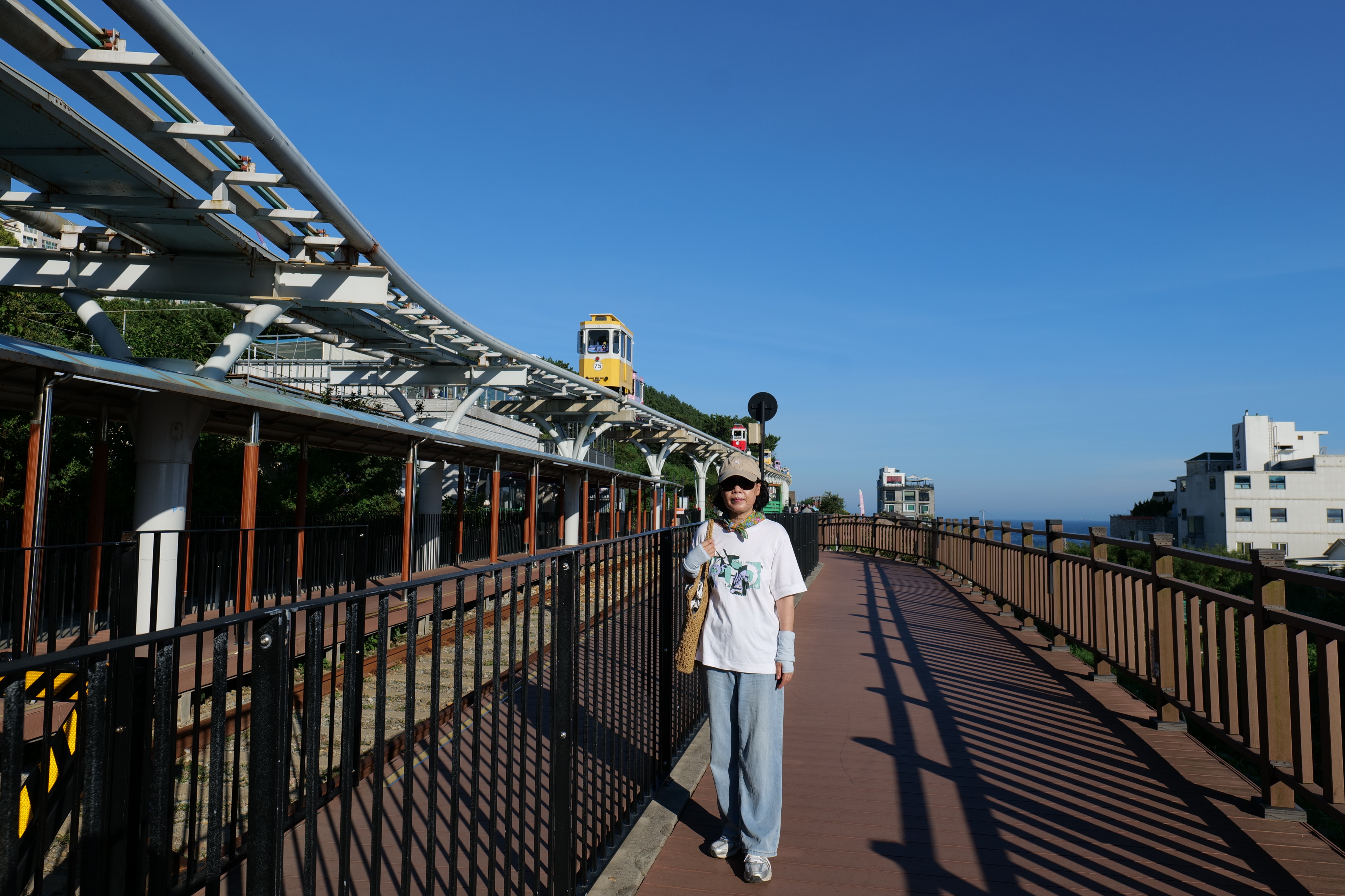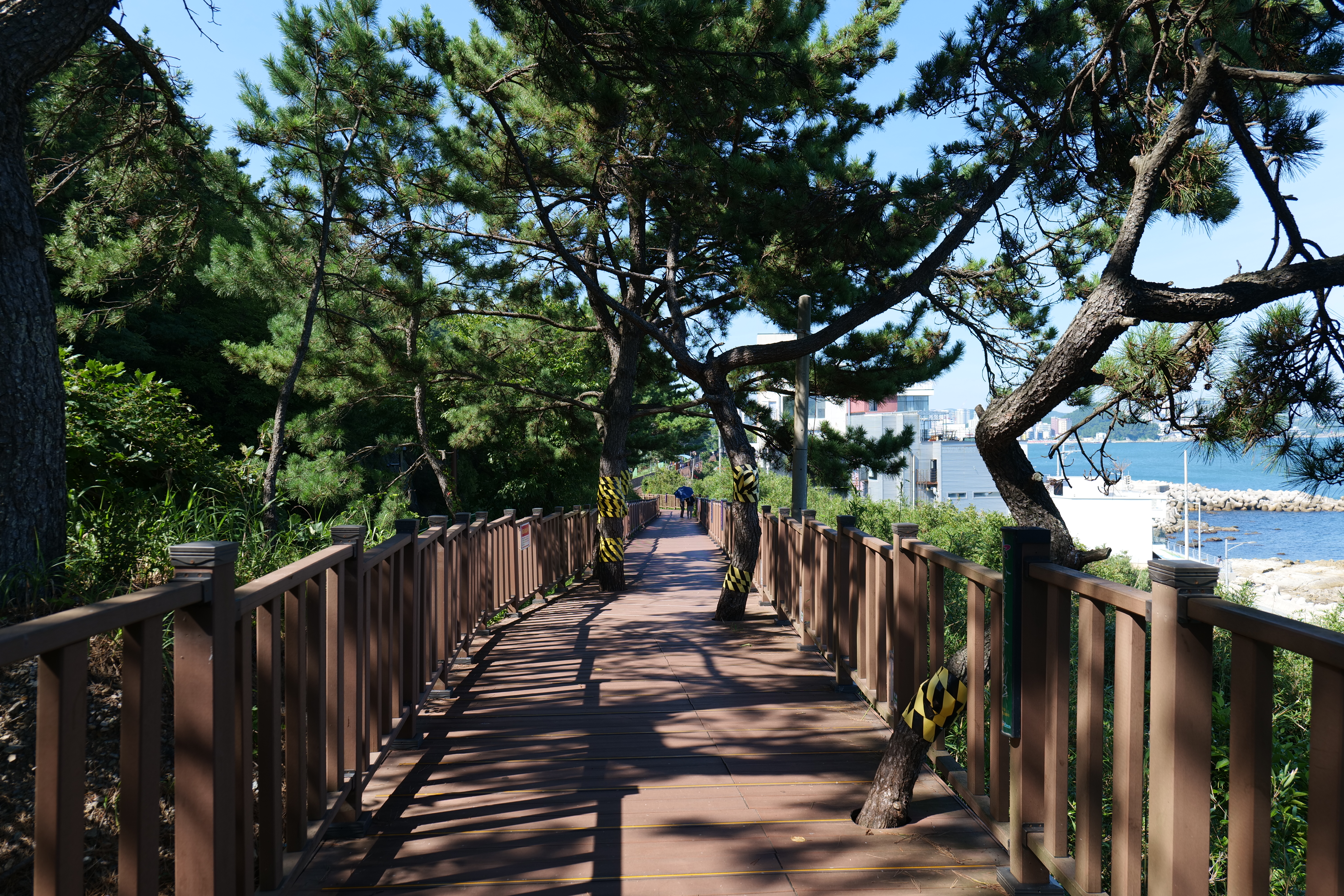 철길을 따라서는 해변열차가, 보이는 구조물로는 스카이 캡슐이 다니고 있고, 철길 옆으로 산책로가 조성되어 있습니다.