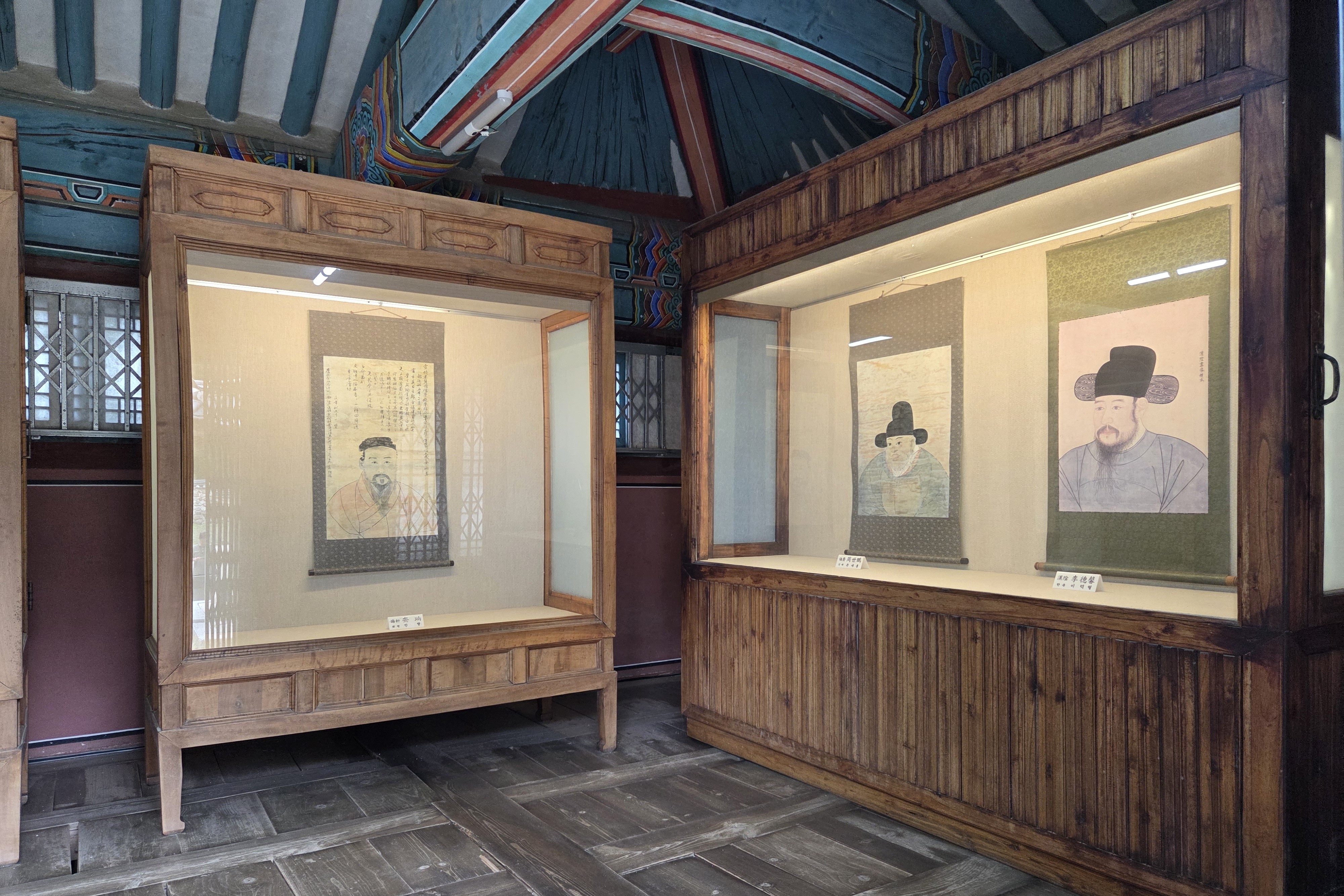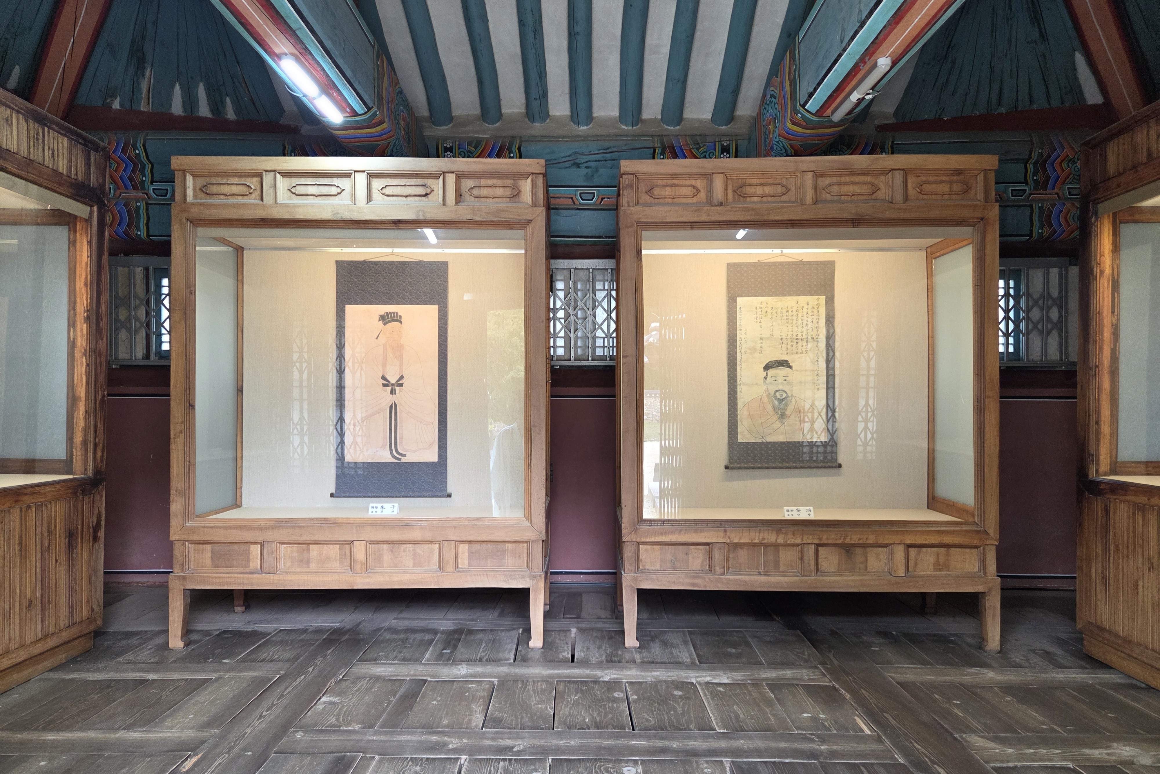 영정각 내부의 중앙 좌측에는 주자학의 시조인 주자의 영정, 우측에는 우리나라 주자학의 선구자인 안향의 영정, 왼쪽에는 소수서원을 세운 주세붕의 영정, 능력과 덕망을 겸비한 문인인 한음 이덕형의 영정, 오른쪽에는 청백리의 표상인 오리 이원익의 영정과 조선 후기 사상계를 이끌었던 미수 허목의 영정이 있습니다. 이 가운데 안향의 영정은 국보, 주세붕의 영정은 보물로 지정되었습니다. 원본은 소수박물관에 있으며 전시된 영정은 복제본입니다.