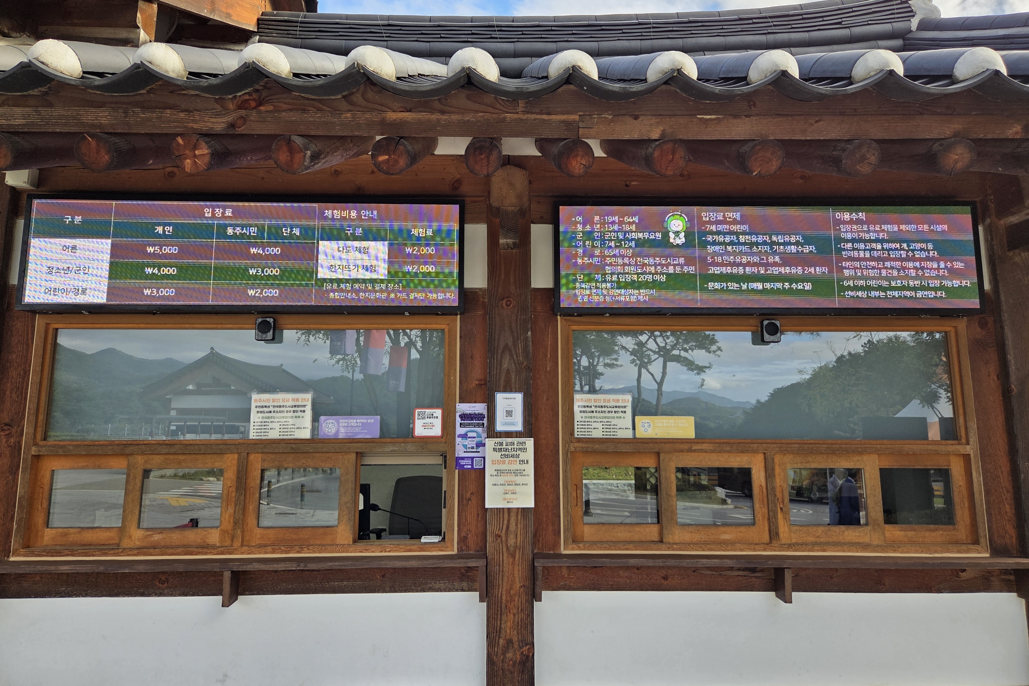 주차 요금은 무료이지만 소수서원과 선비촌 통합 입장료는 어른 2,000원 입니다. 주차장이 두 곳 있기 때문에 매표소도 소수서원 입구와 선비촌 입구 두 곳이 있습니다. 경로우대의 경우는 무료입장입니다.